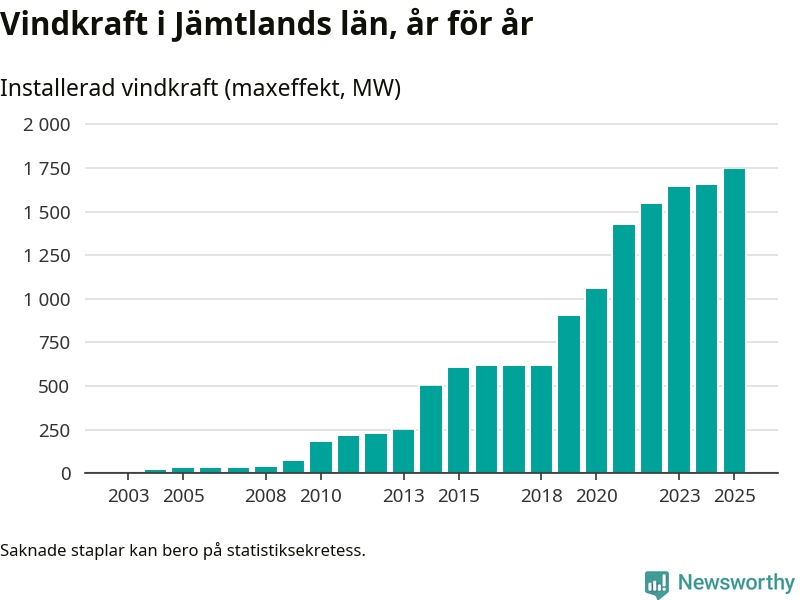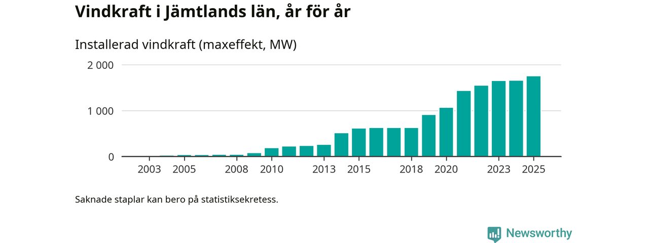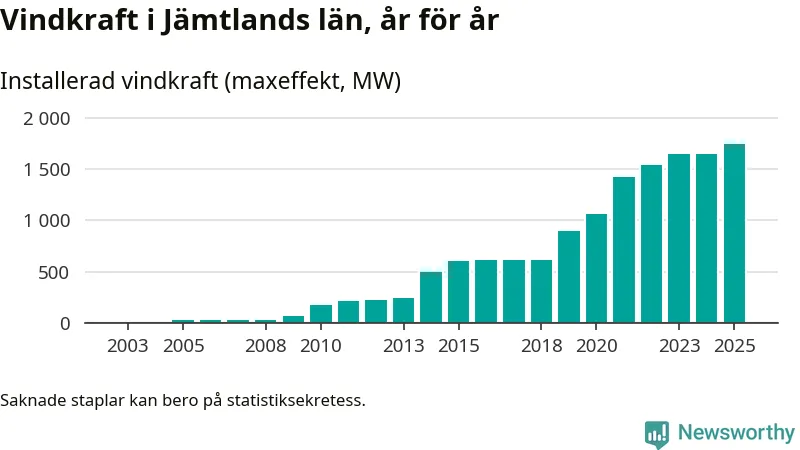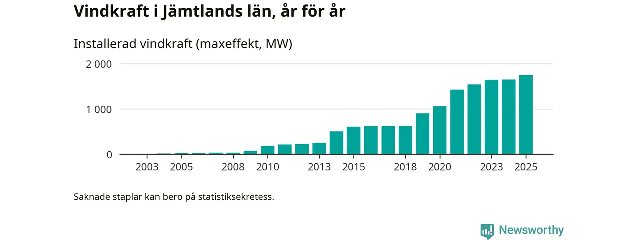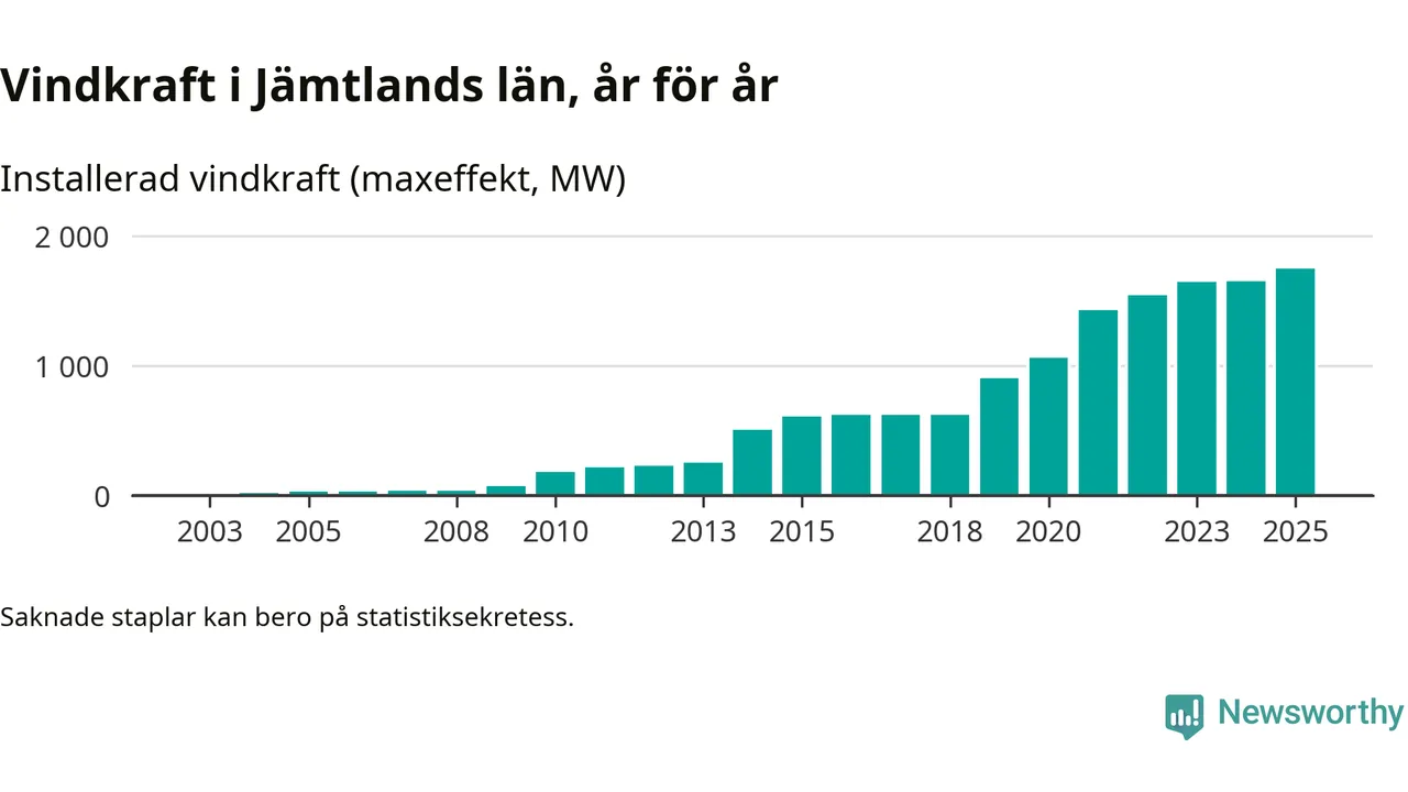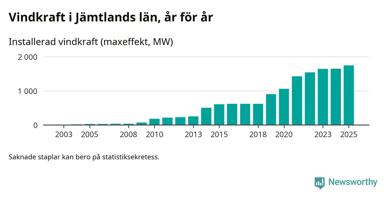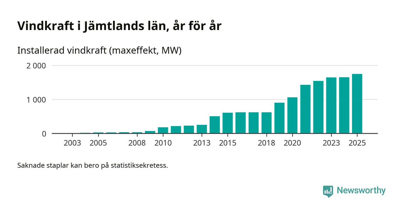 Totalt fanns i slutet av förra året 497 vindkraftverk i Jämtlands län, med en sammanlagd maxeffekt på 1 744 megawatt. Det är en ökning med 93,5 megawatt, eller 6 procent, jämfört med året innan. Det visar nya siffror från Energimyndigheten.