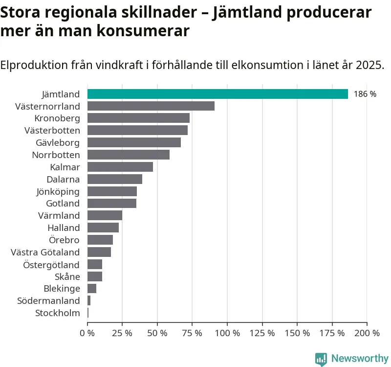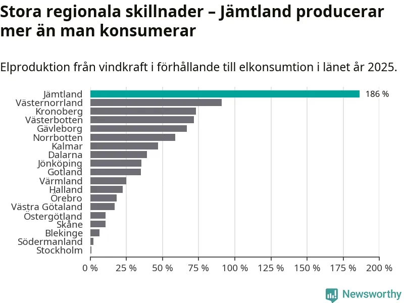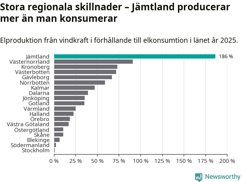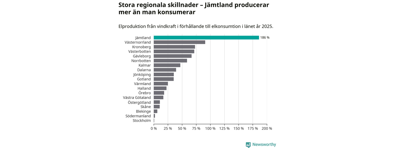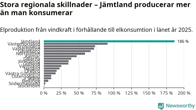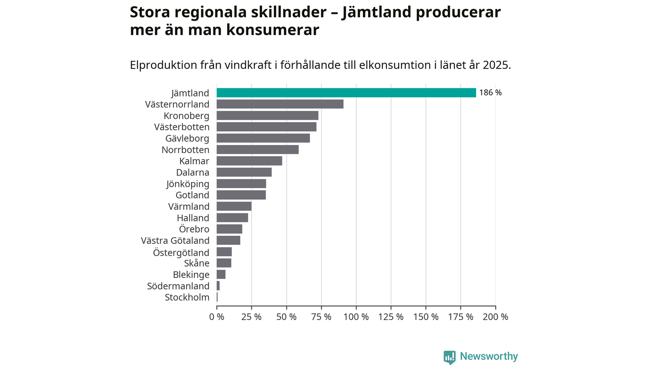 Totalt producerade länets vindkraft 3 296 gigawattimmar el under fjolåret, vilket motsvarar ungefär 186 procent av den totala elkonsumtionen1. Jämtlands län producerar alltså mer el med vindkraft än vad invånarna gör åt.