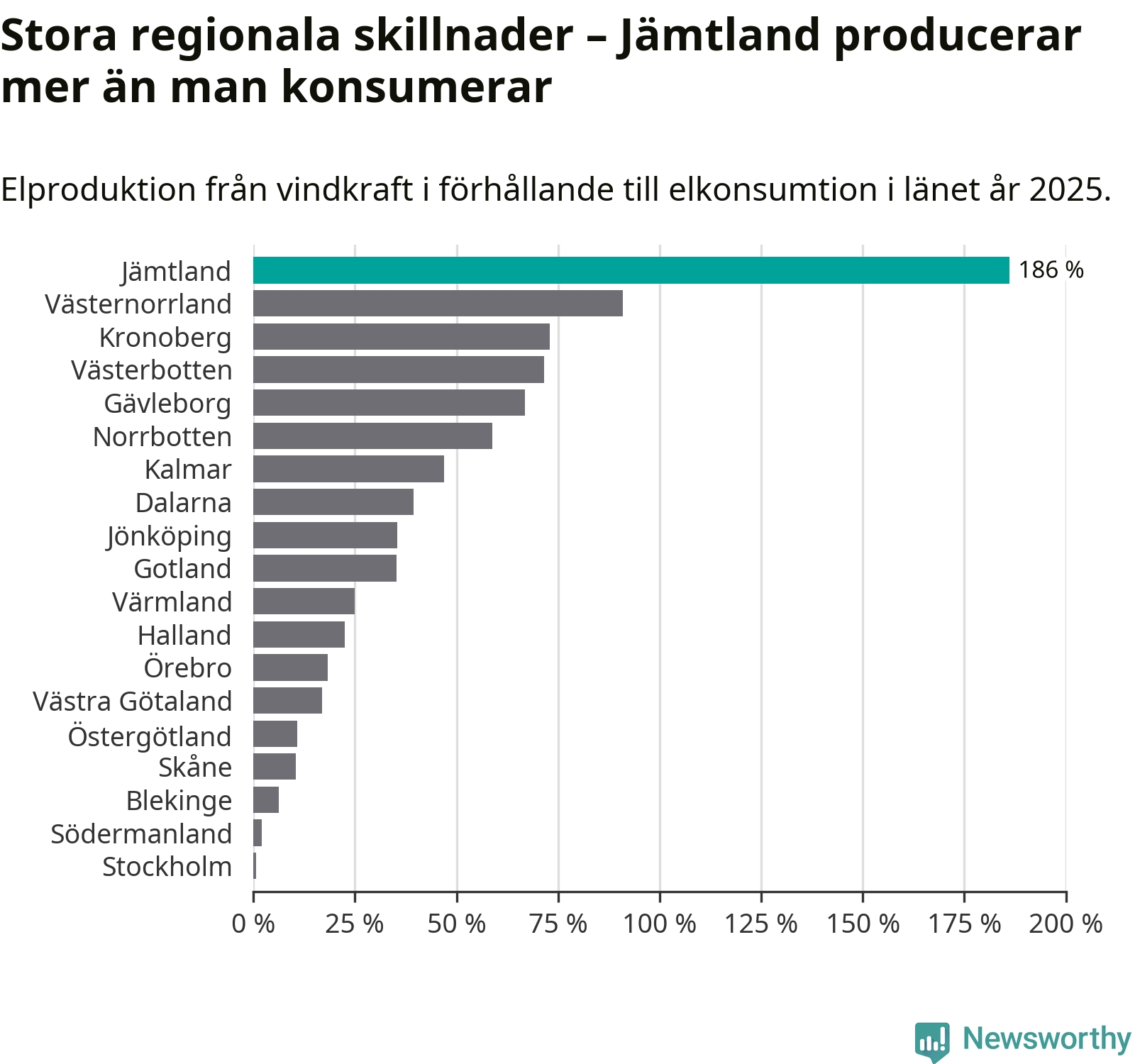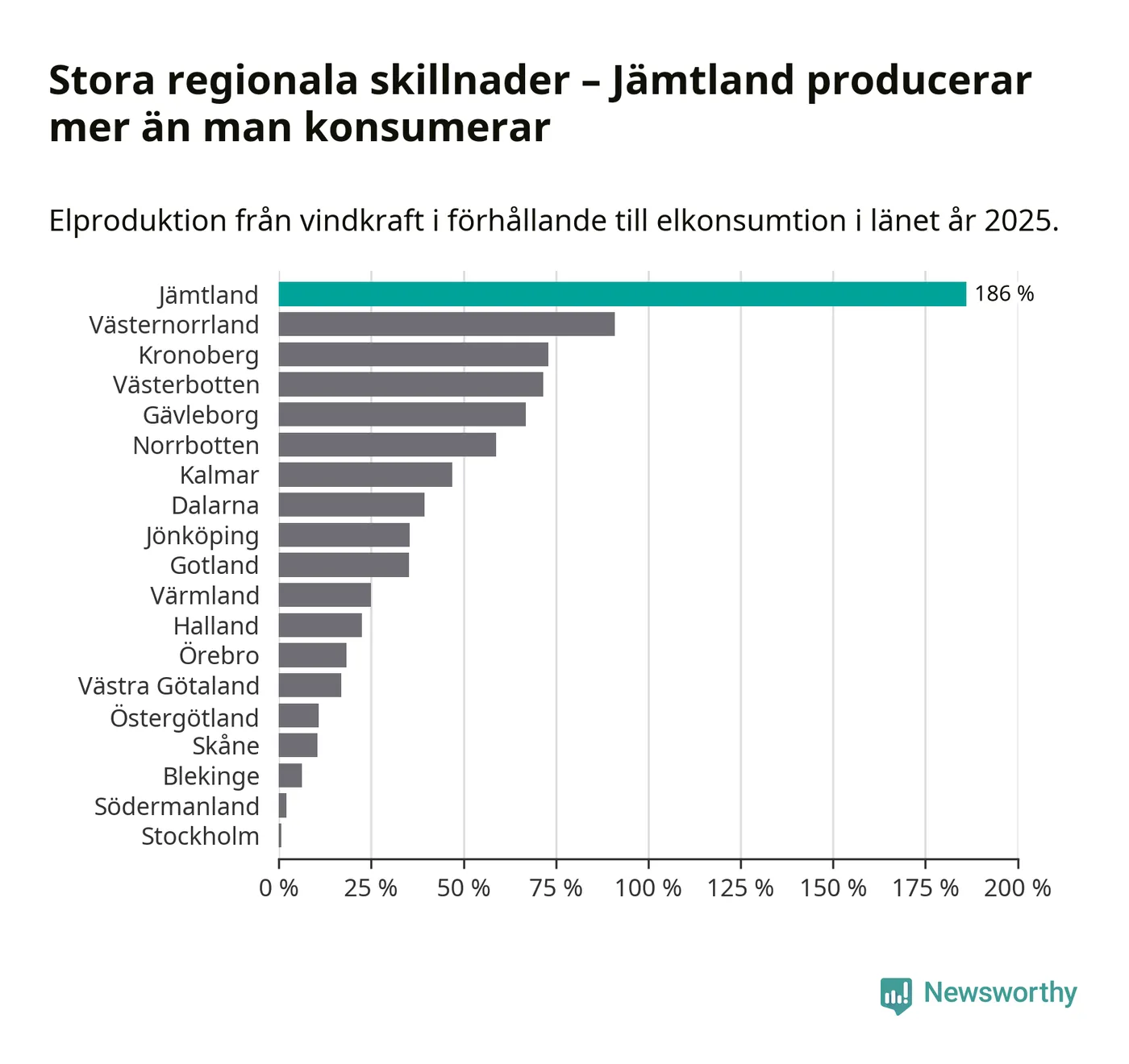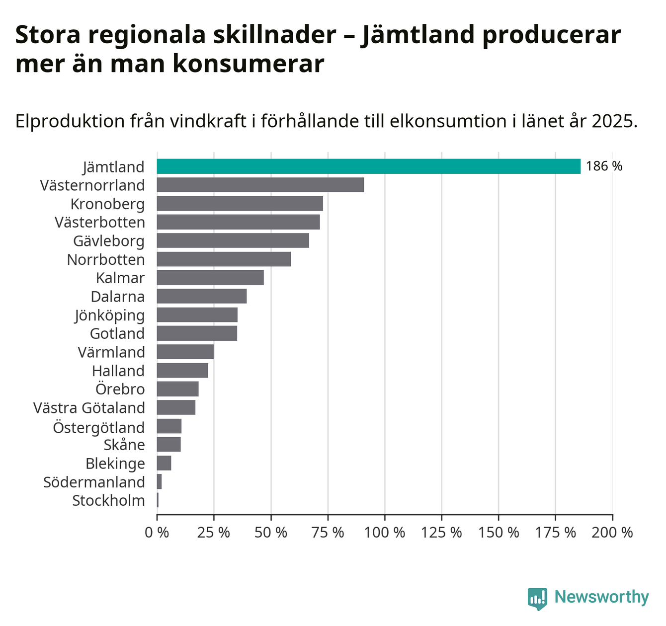 Totalt producerade länets vindkraft 3 296 gigawattimmar el under fjolåret, vilket motsvarar ungefär 186 procent av den totala elkonsumtionen1. Jämtlands län producerar alltså mer el med vindkraft än vad invånarna gör åt.