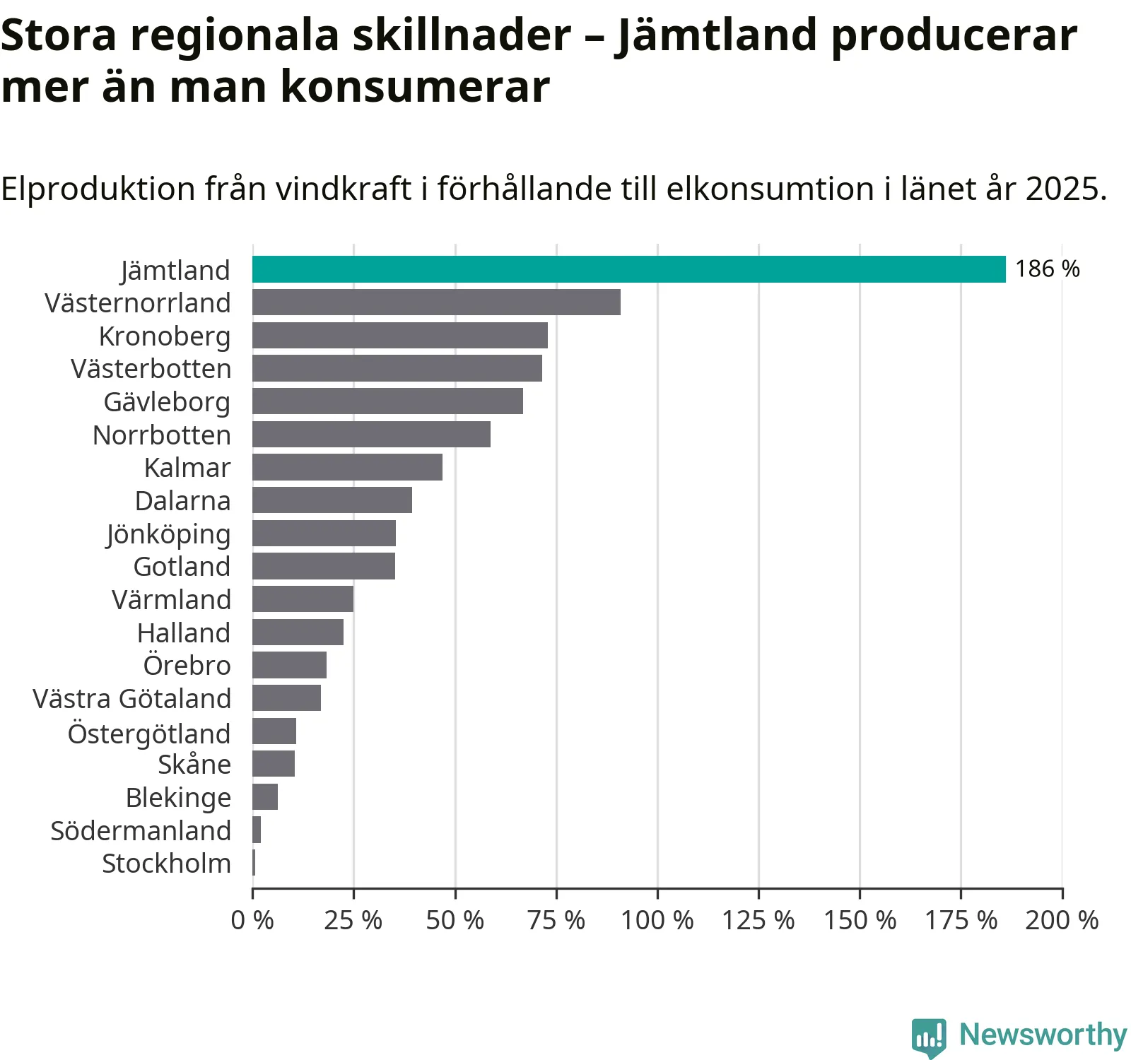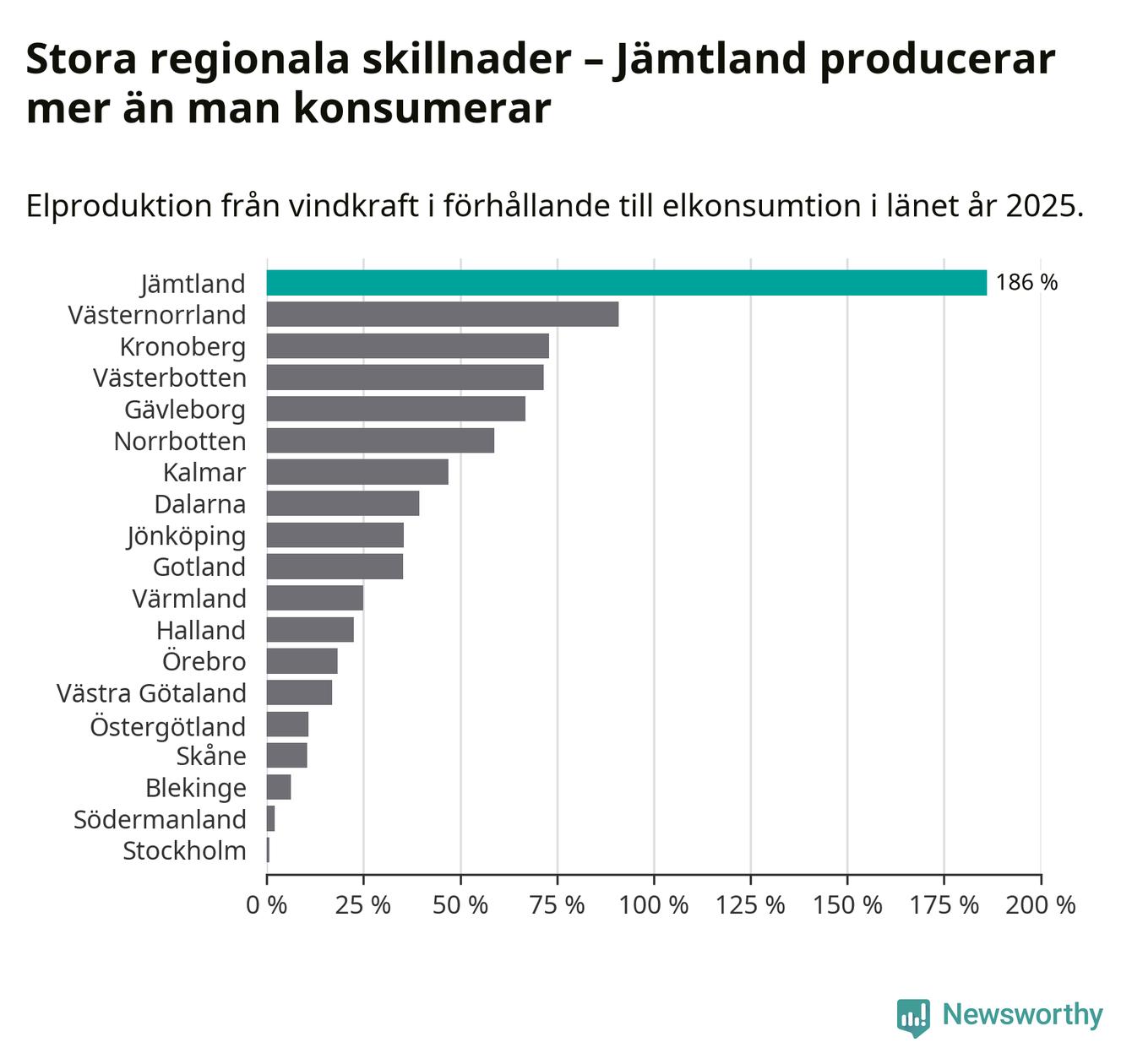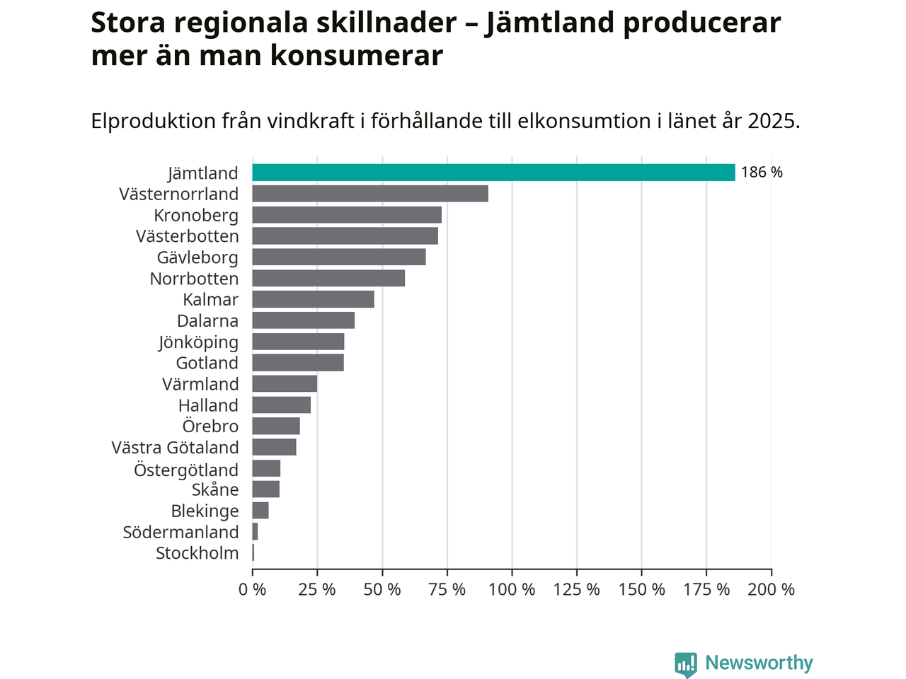 Störst installerad vindkraftseffekt bland landets län finns nu i Västernorrland, med 3 477 megawatt. Bland kommunerna i Jämtland ligger Strömsunds kommun i topp i effektligan.