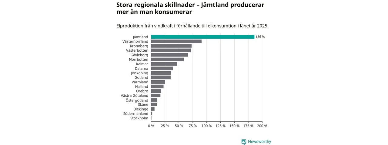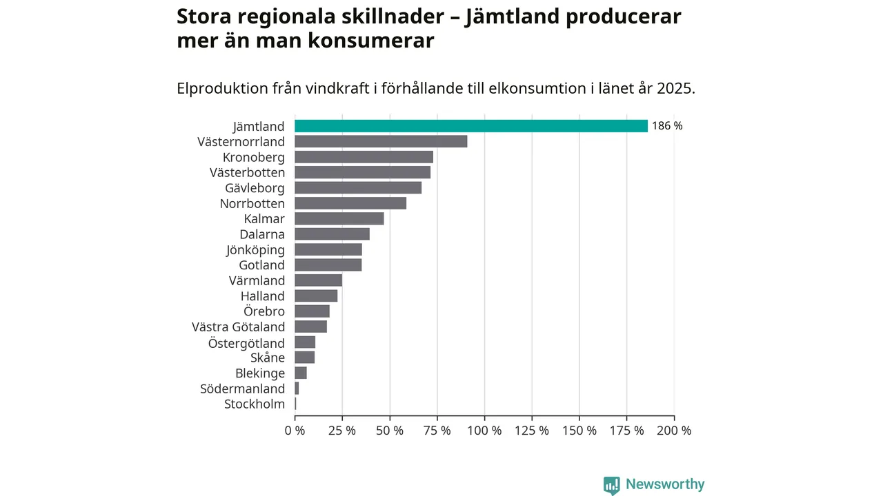 Det är bara ett femtontal kommuner i landet där vindkraftskapaciten rapporterats öka under 2025. Under hela den innevarande mandatperioden har ett 30-tal kommuner ökat den installerade effekten med totalt tre gigawatt, samtidigt som små minskningar skett i ett 20-tal kommuner. Totalt var utbyggnaden omkring 20 procent lägre under 2023–2025, än under motsvarande period förra mandatperioden.