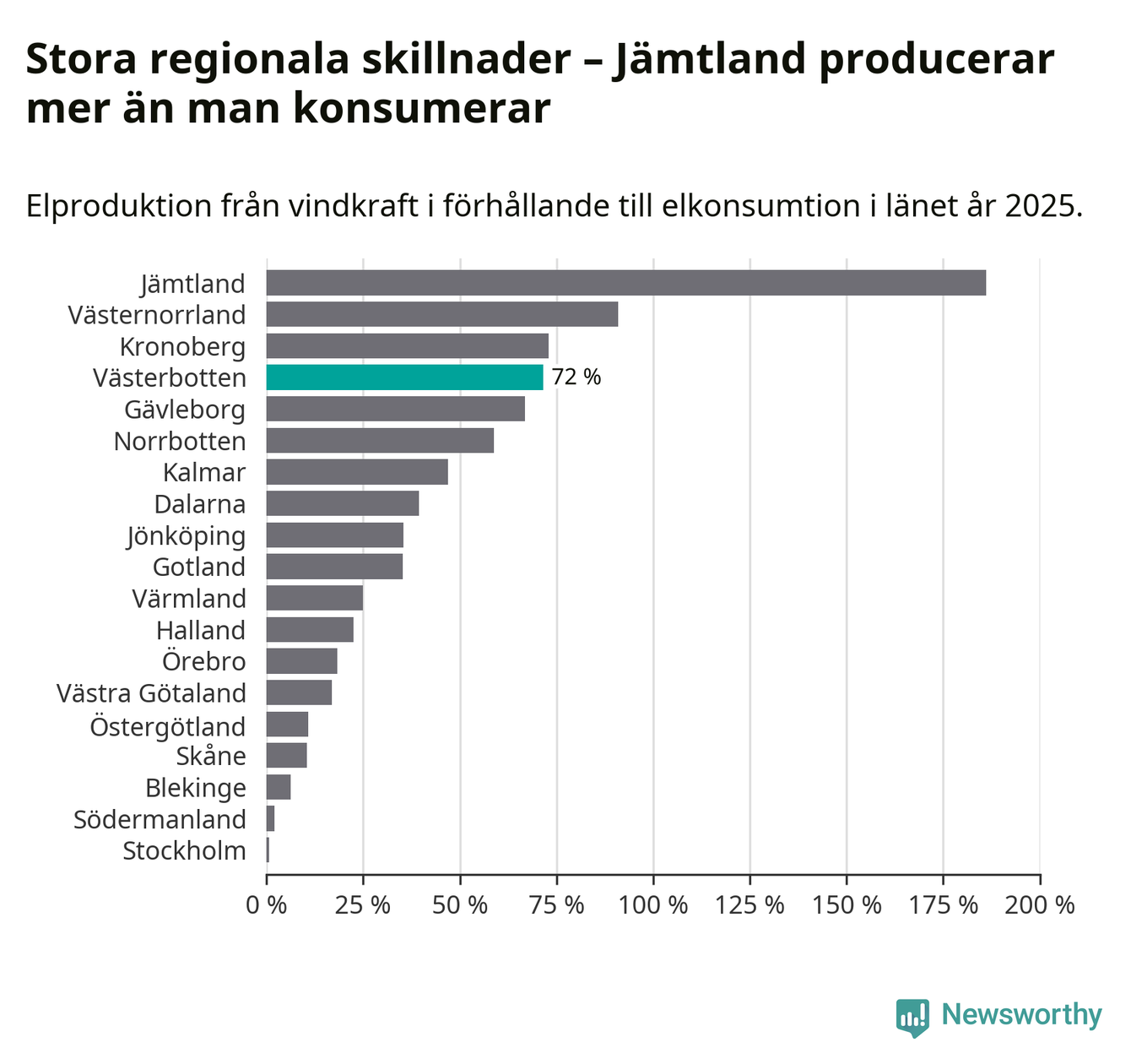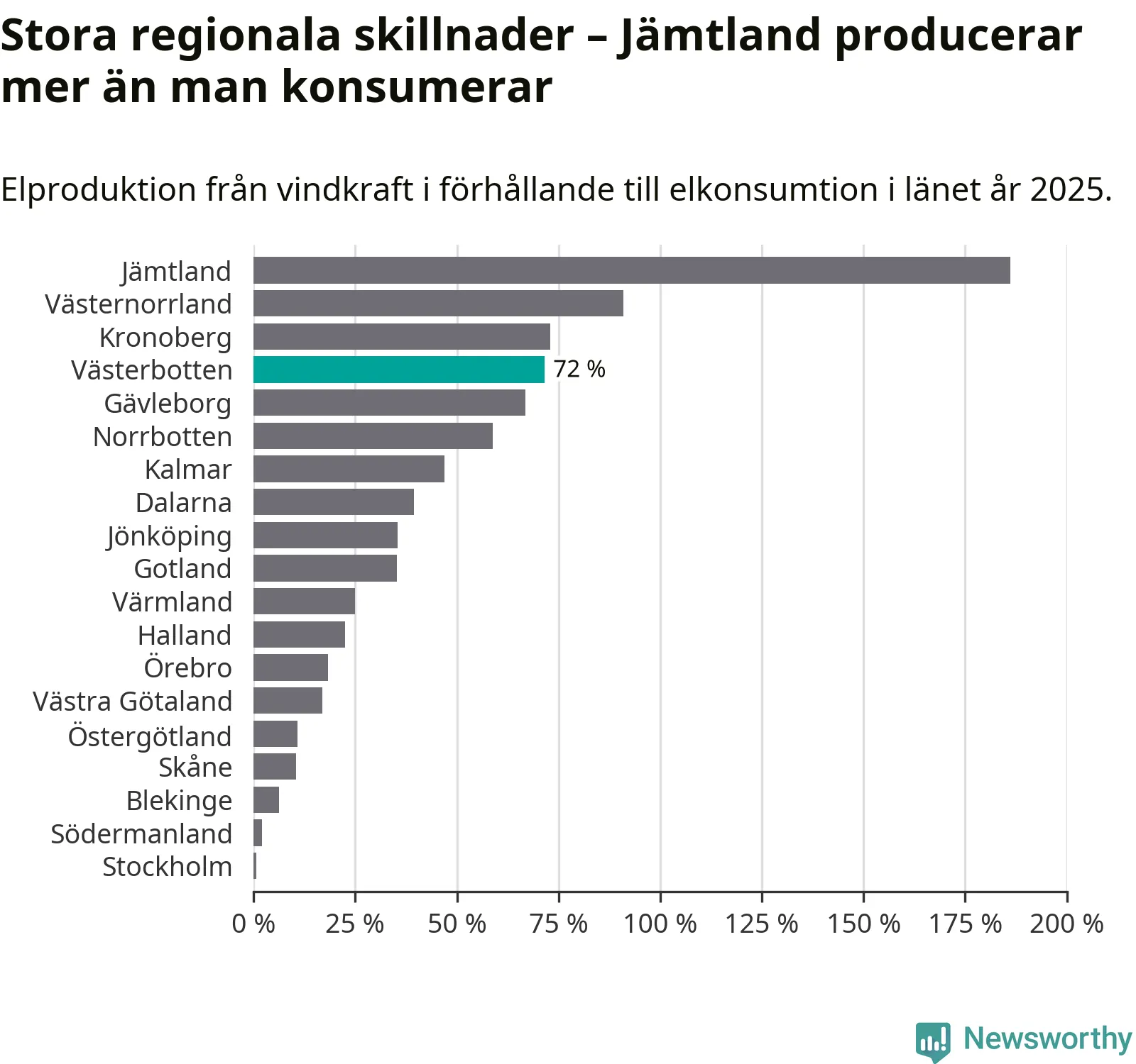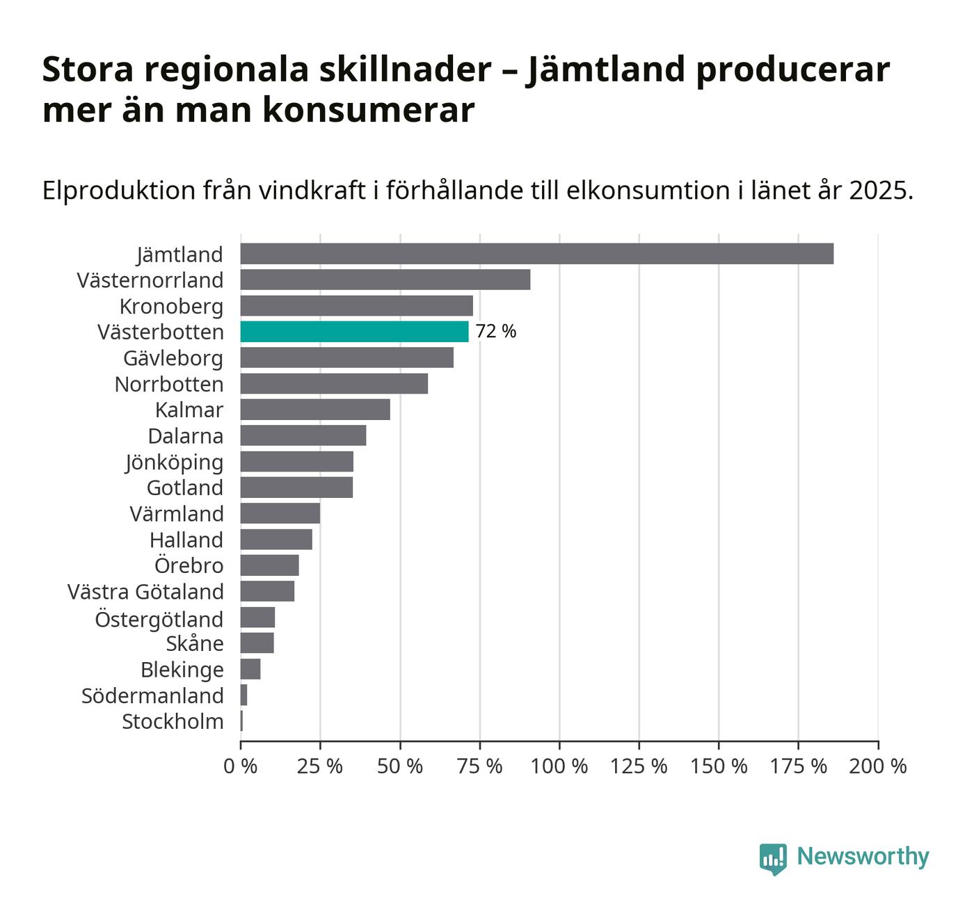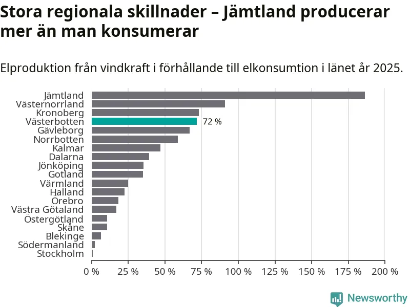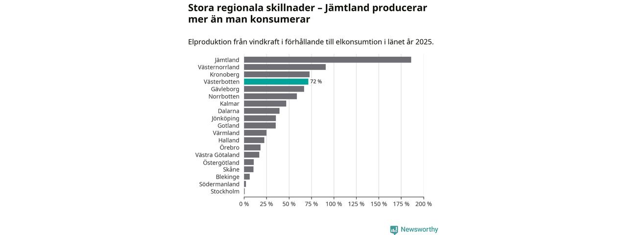 Störst installerad vindkraftseffekt bland landets län finns nu i Västernorrland, med 3 477 megawatt. Bland kommunerna i Västerbotten ligger Åsele kommun i topp i effektligan.