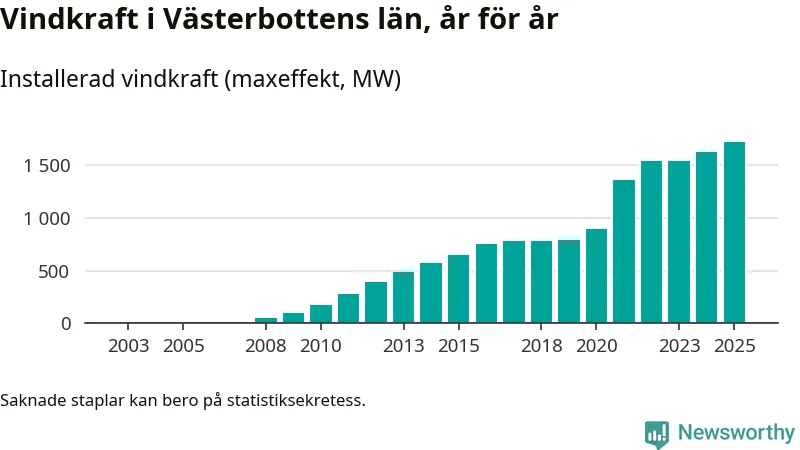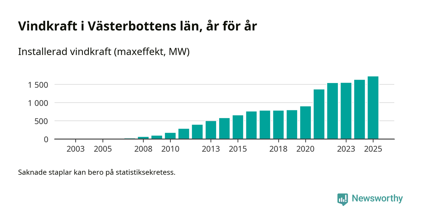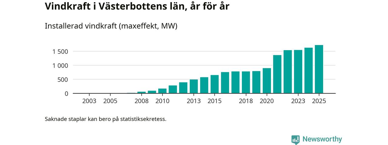 Totalt fanns i slutet av förra året 540 vindkraftverk i Västerbottens län, med en sammanlagd maxeffekt på 1 718 megawatt. Det är en ökning med 95,5 megawatt, eller 6 procent, jämfört med året innan. Det visar nya siffror från Energimyndigheten.