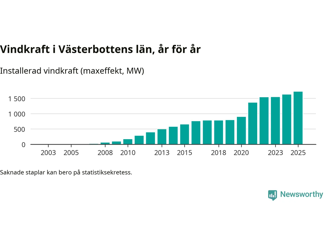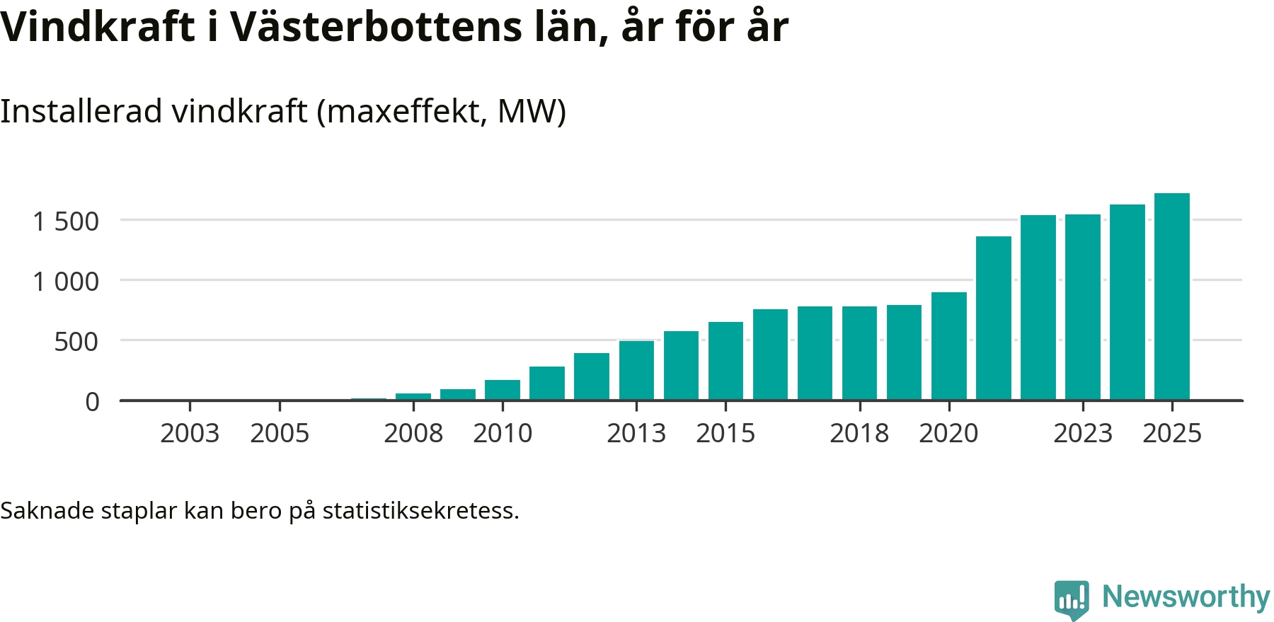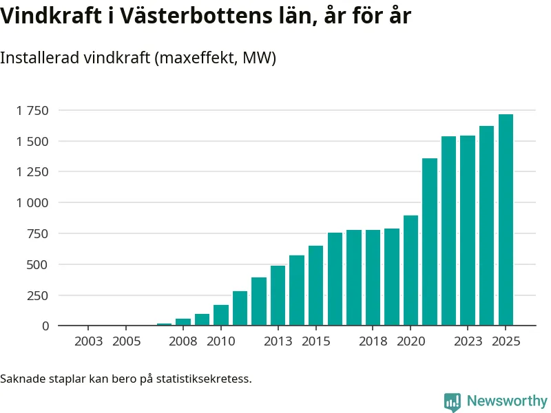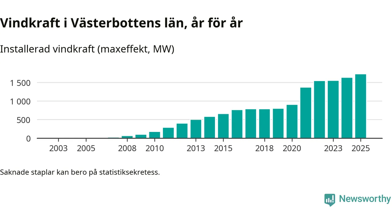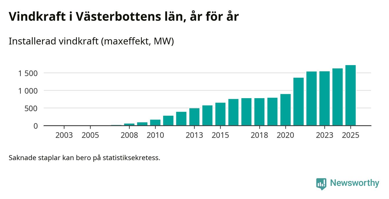 Fler vindkraftverk byggdes i fjol än året innan, men utbyggnaden är fortfarande betydligt mindre än vi vant oss vid det senaste decenniet. Så här ser det ut i Västerbotten