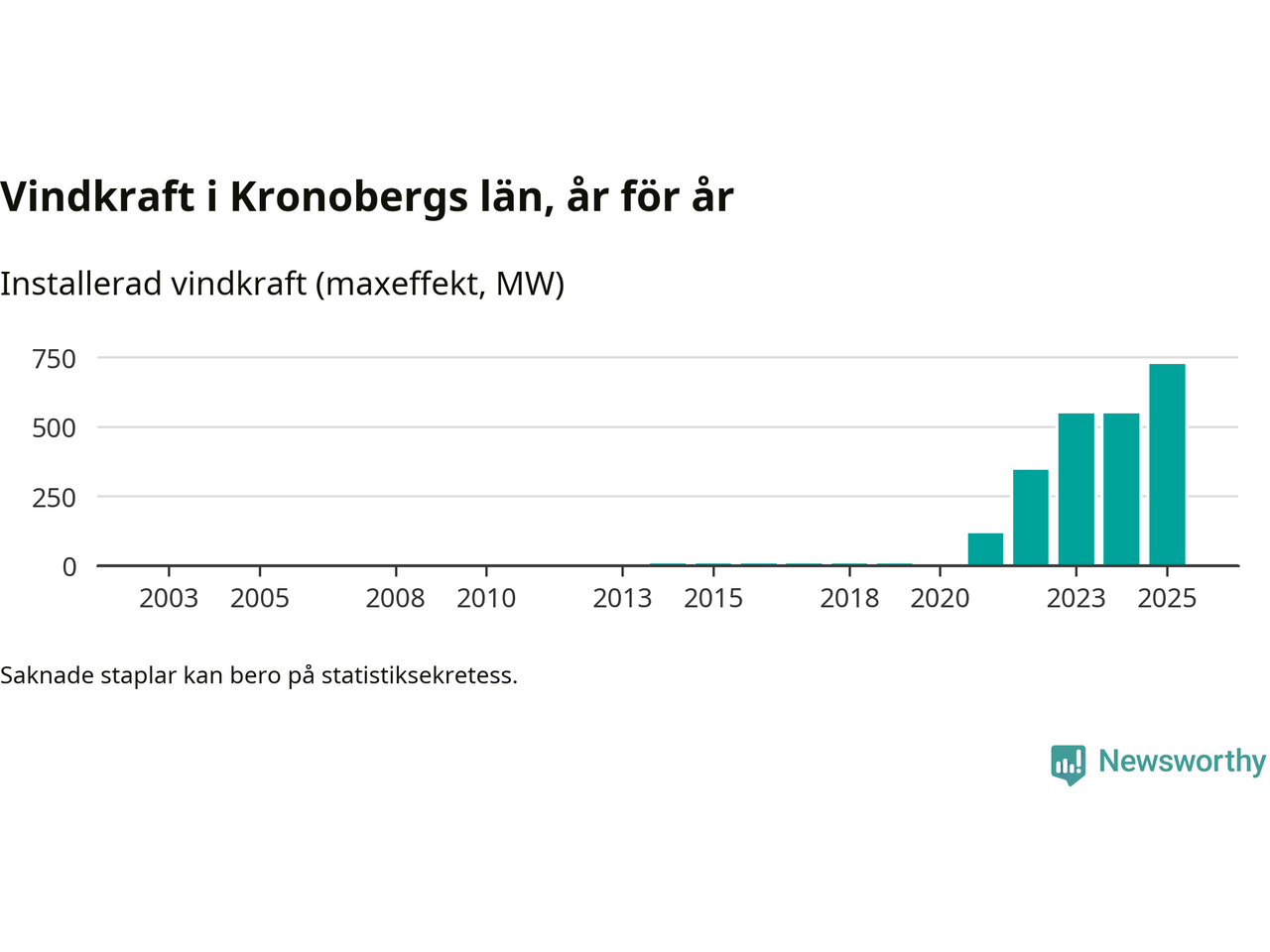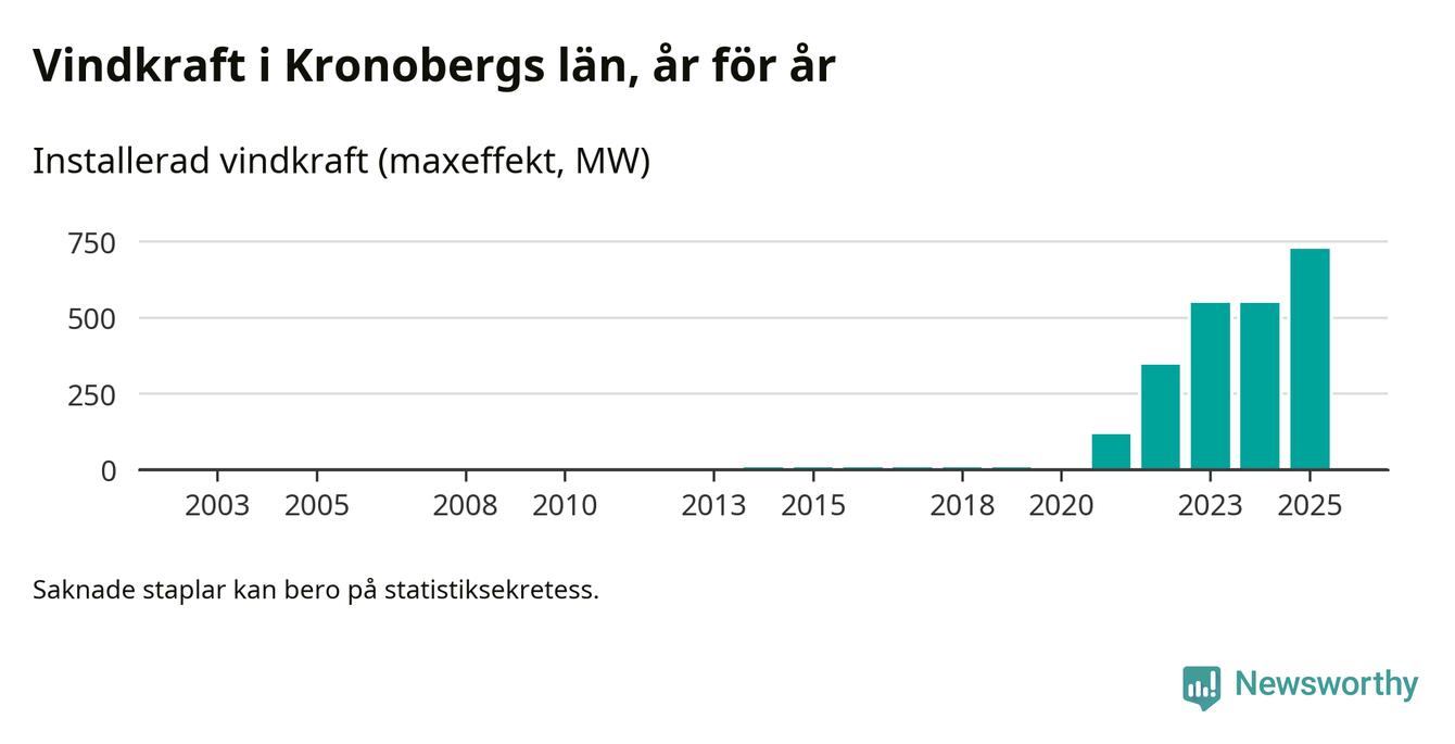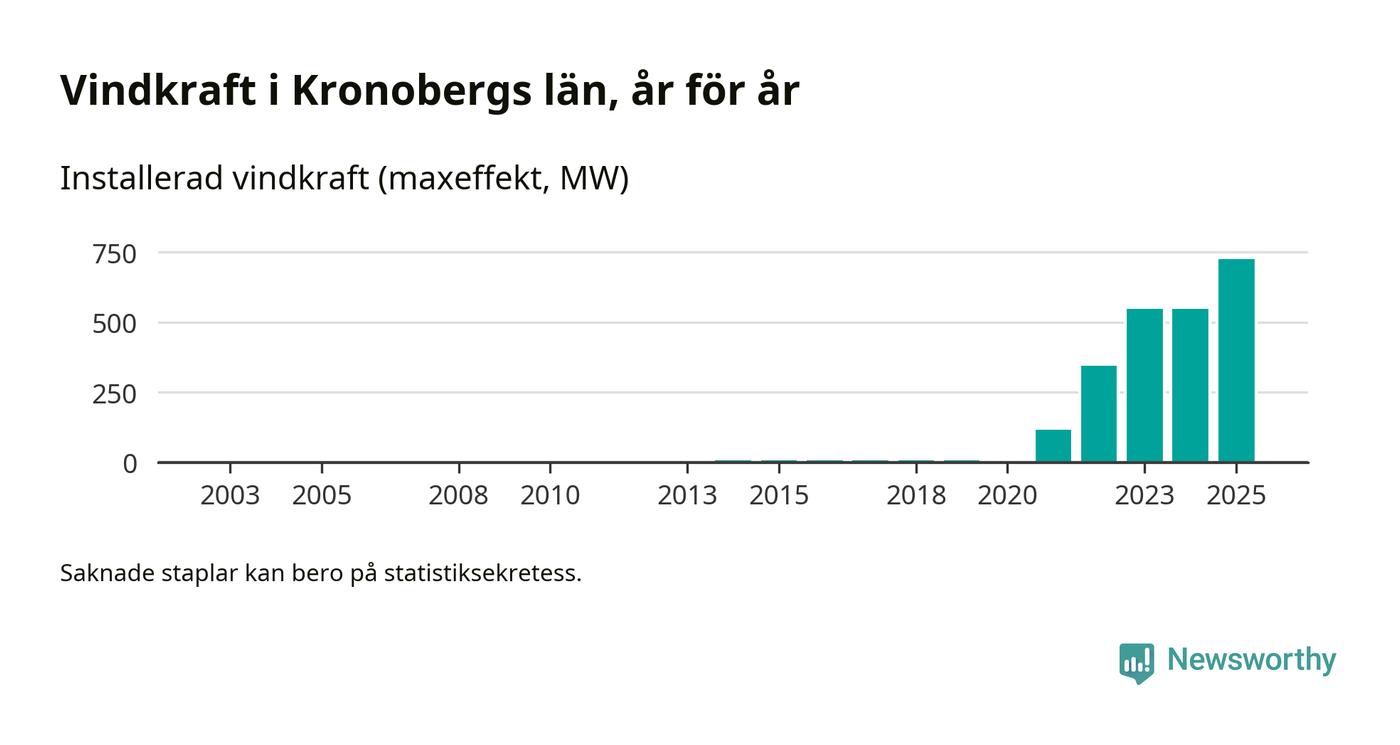 Totalt fanns i slutet av förra året 149 vindkraftverk i Kronobergs län, med en sammanlagd maxeffekt på 725 megawatt. Det är en ökning med 177,7 megawatt, eller 32 procent, jämfört med året innan. Det visar nya siffror från Energimyndigheten.