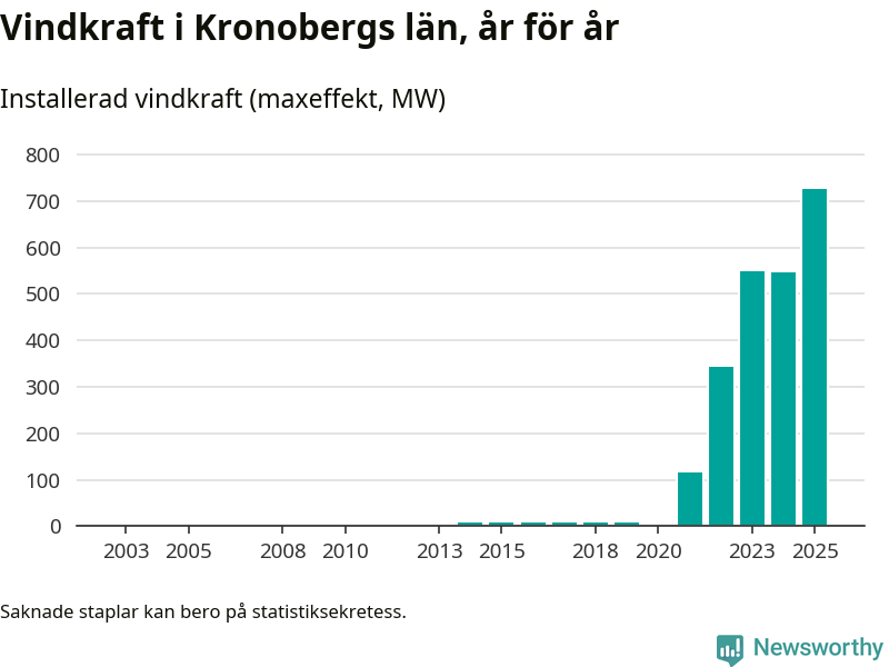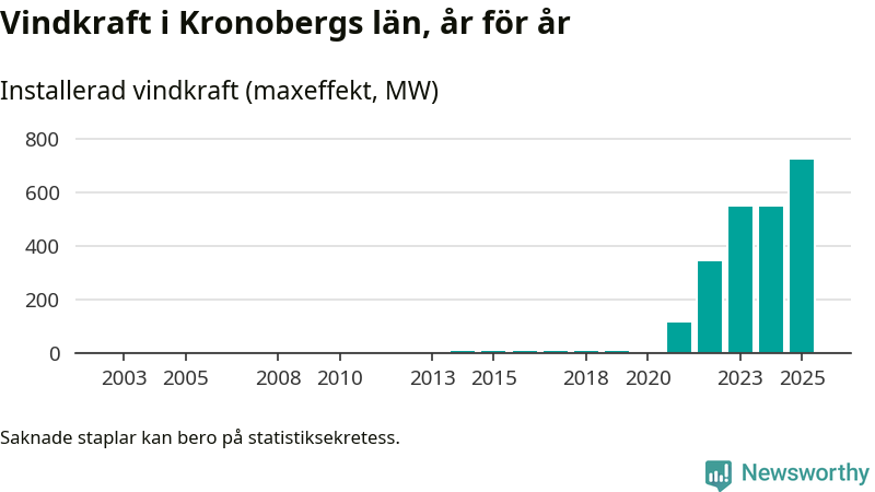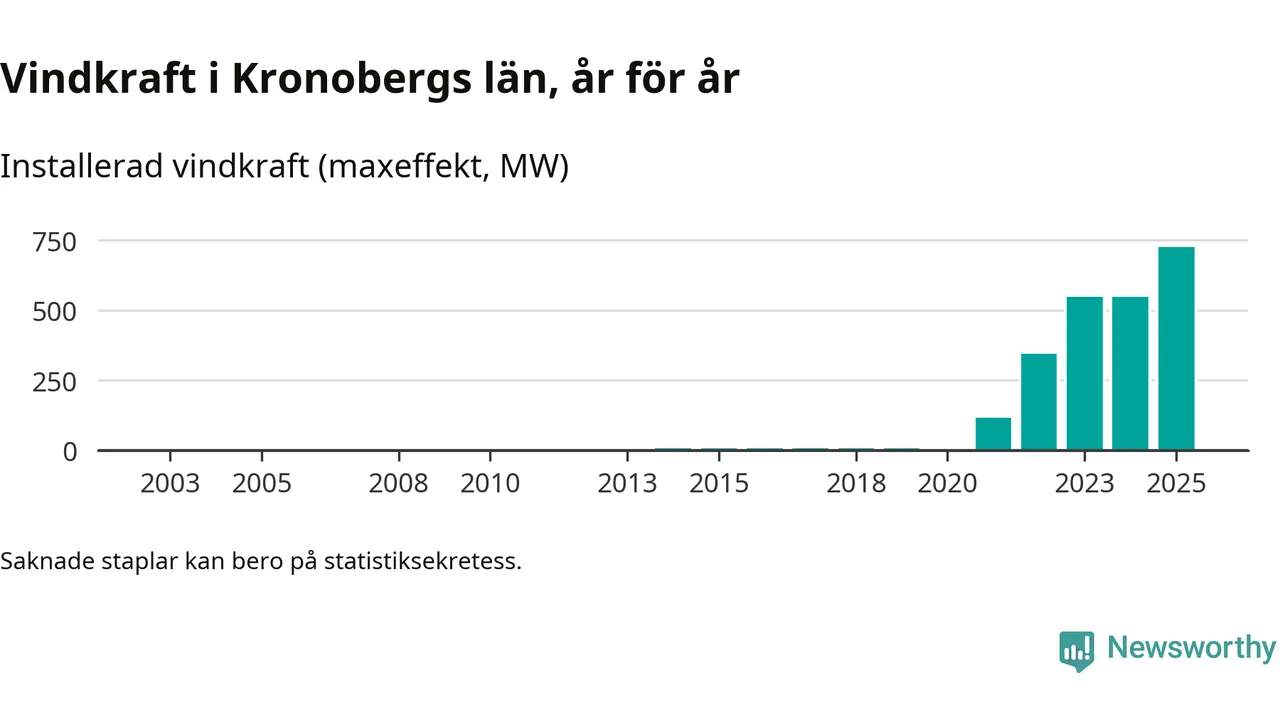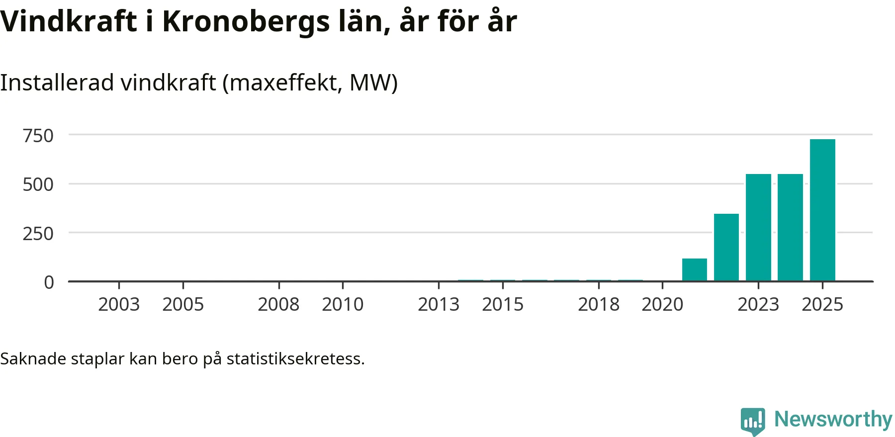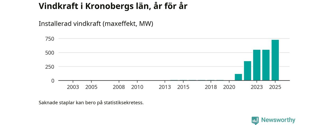 Totalt fanns i slutet av förra året 149 vindkraftverk i Kronobergs län, med en sammanlagd maxeffekt på 725 megawatt. Det är en ökning med 177,7 megawatt, eller 32 procent, jämfört med året innan. Det visar nya siffror från Energimyndigheten.