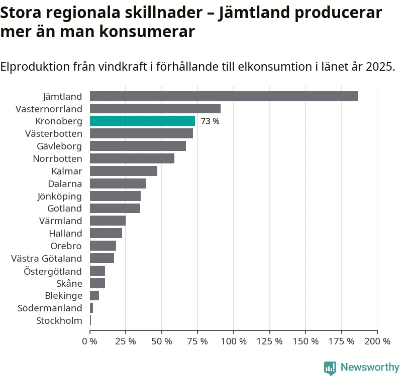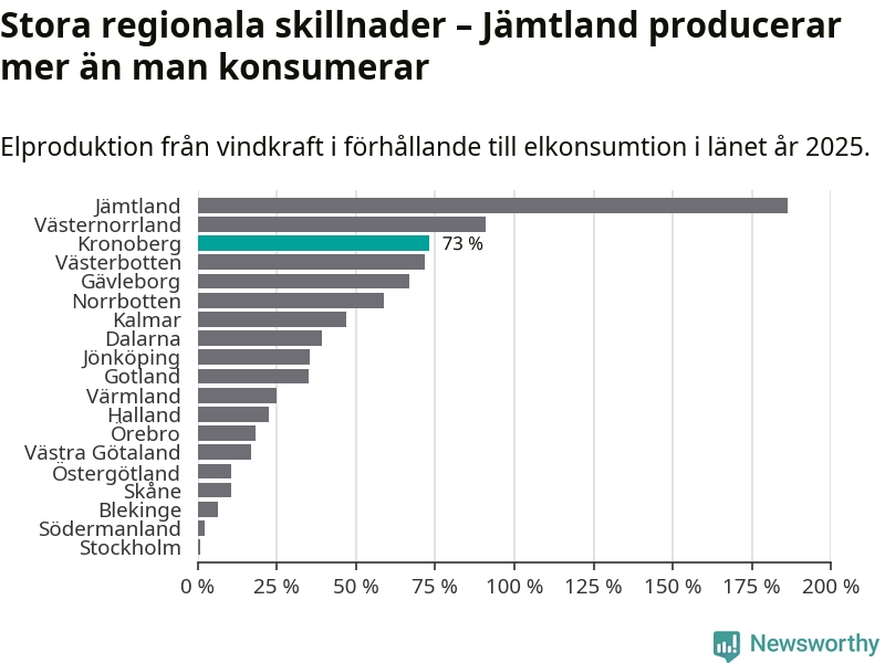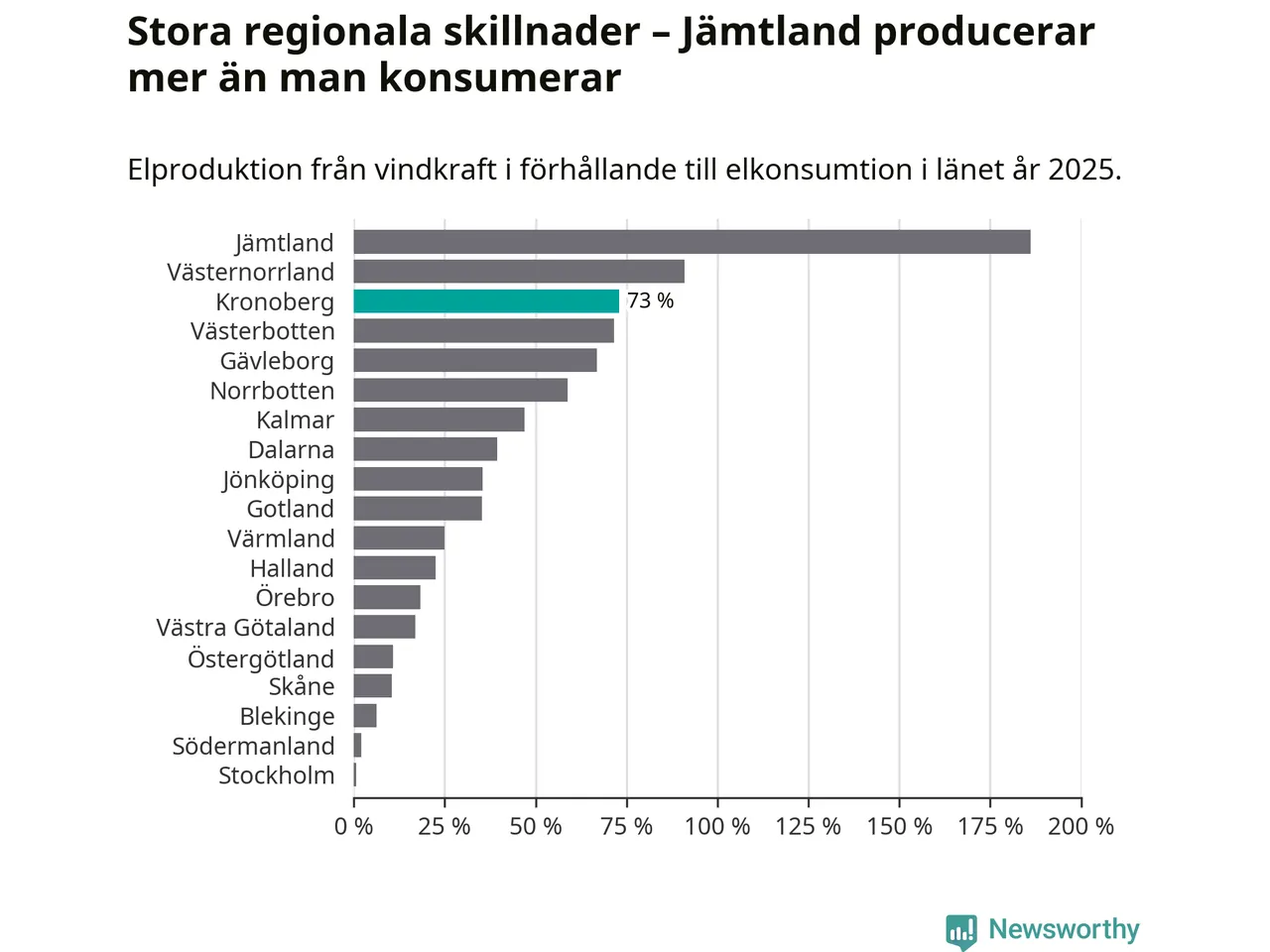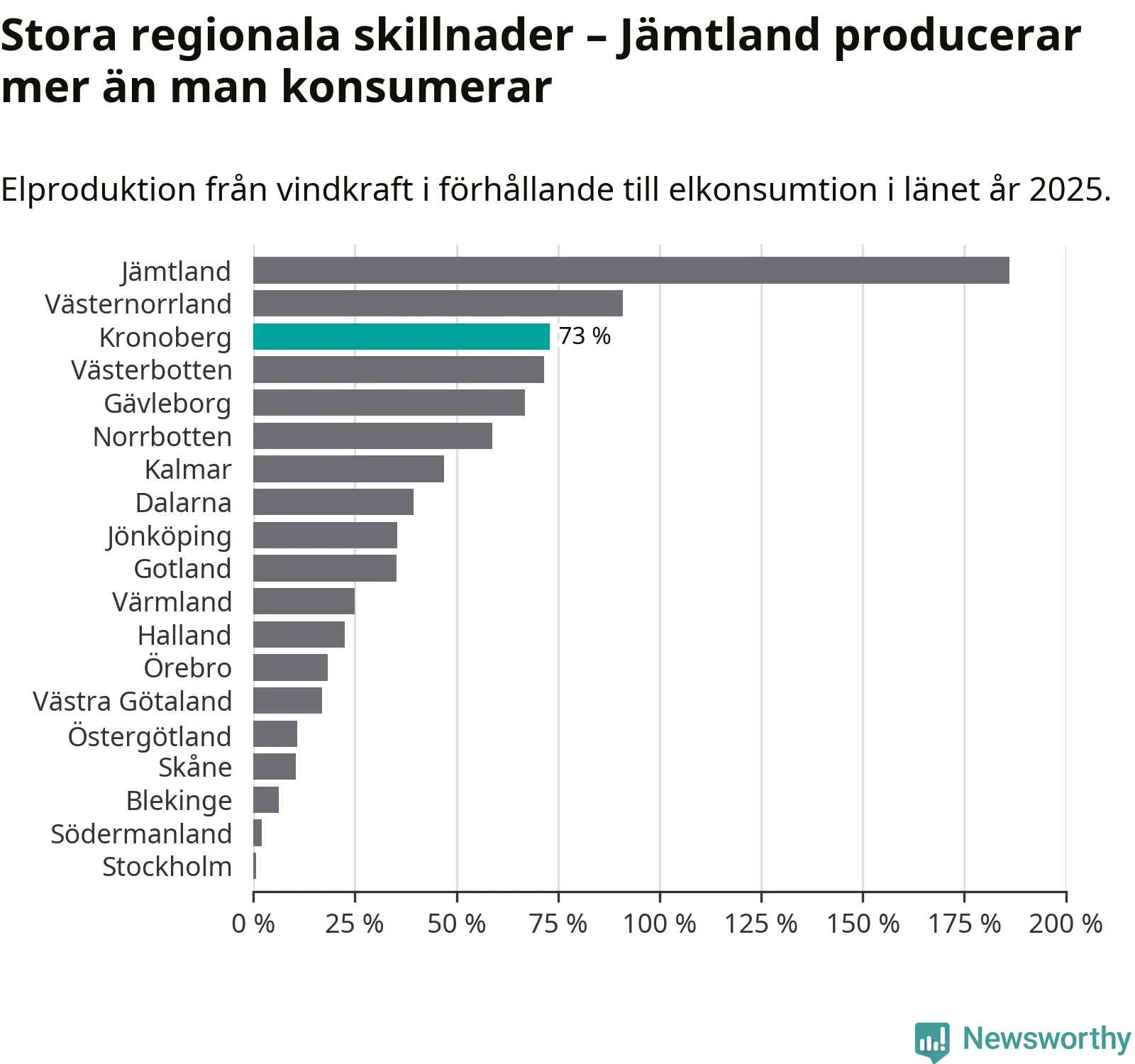 stapeldiagram som visar hur stor andel av varje läns komsumtion vindkraftsproduktionen i länet motsvarar.
