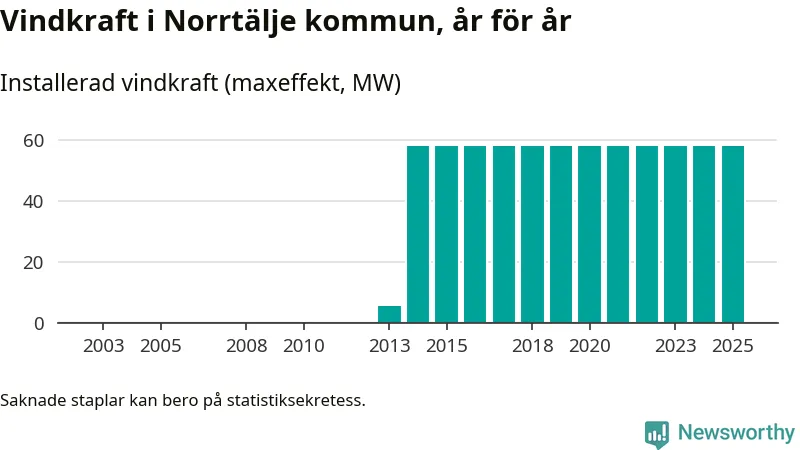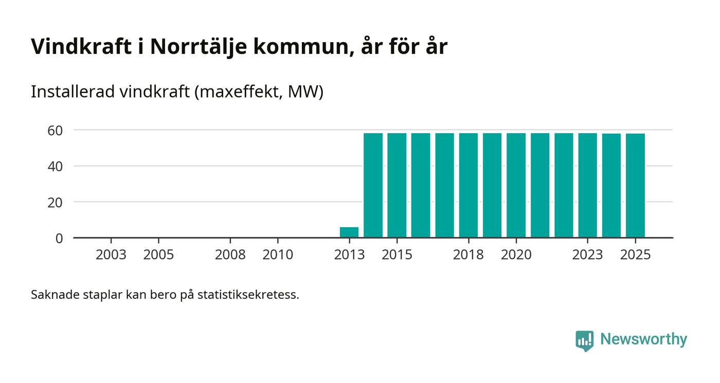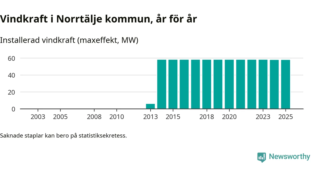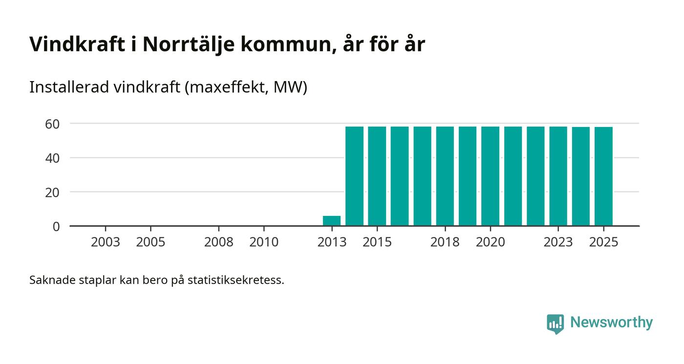 Totalt fanns i slutet av förra året 20 vindkraftverk i Norrtälje kommun, med en sammanlagd maxeffekt på 58 megawatt. Det är oförändrade siffror jämfört med året innan. Det visar nya siffror från Energimyndigheten.