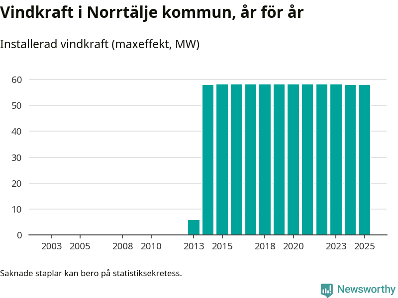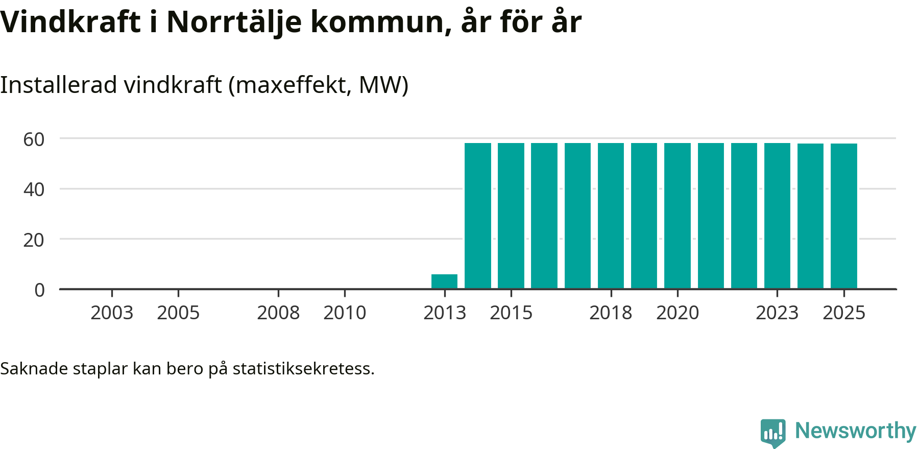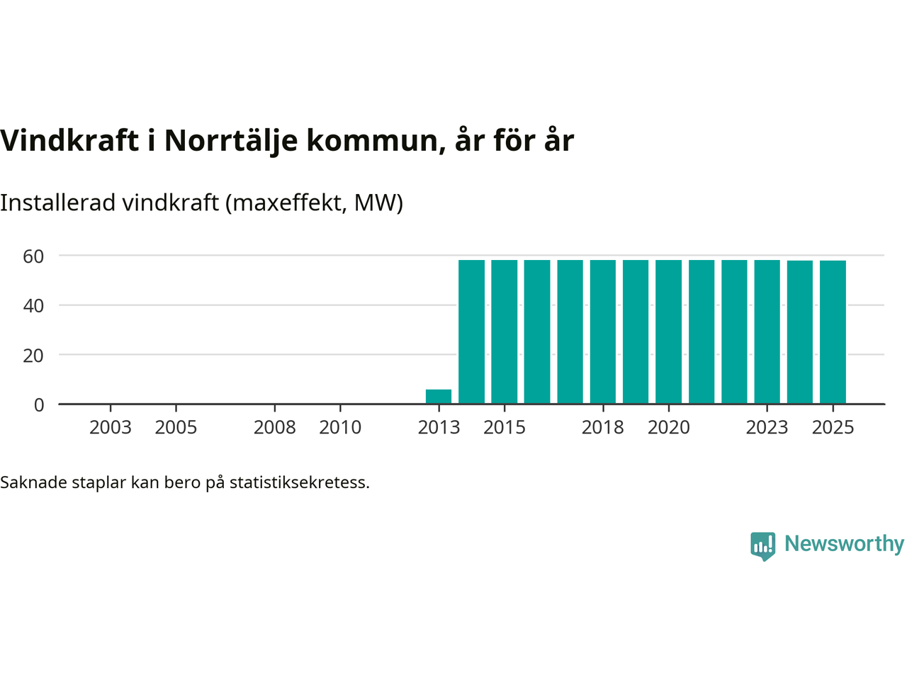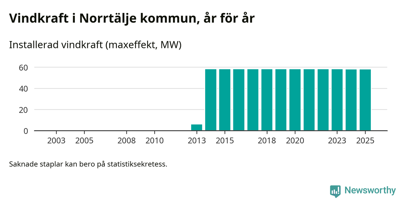 Totalt fanns i slutet av förra året 20 vindkraftverk i Norrtälje kommun, med en sammanlagd maxeffekt på 58 megawatt. Det är oförändrade siffror jämfört med året innan. Det visar nya siffror från Energimyndigheten.