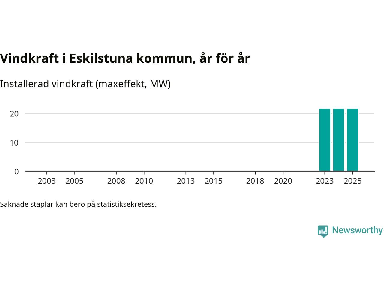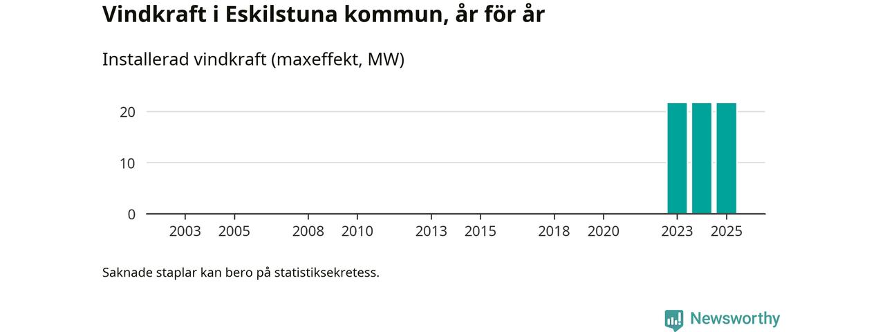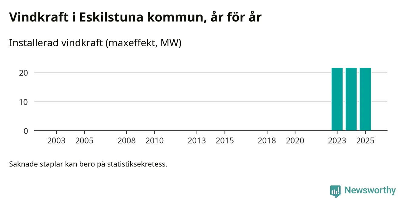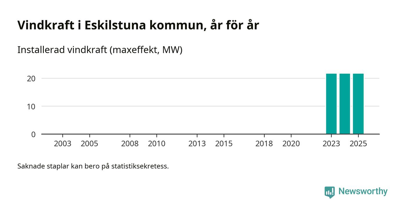 Totalt fanns i slutet av förra året sex vindkraftverk i Eskilstuna kommun, med en sammanlagd maxeffekt på 22 megawatt. Det är, för andra året i rad, oförändrade siffror jämfört med året innan. Det visar nya siffror från Energimyndigheten.