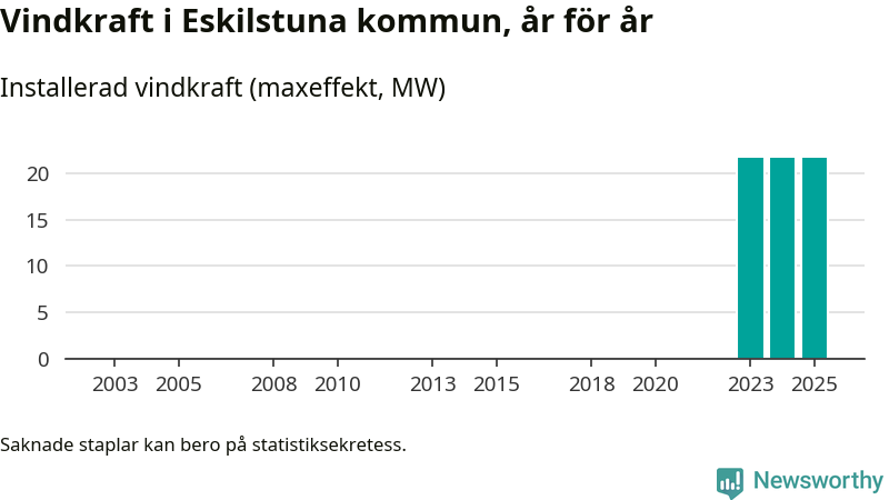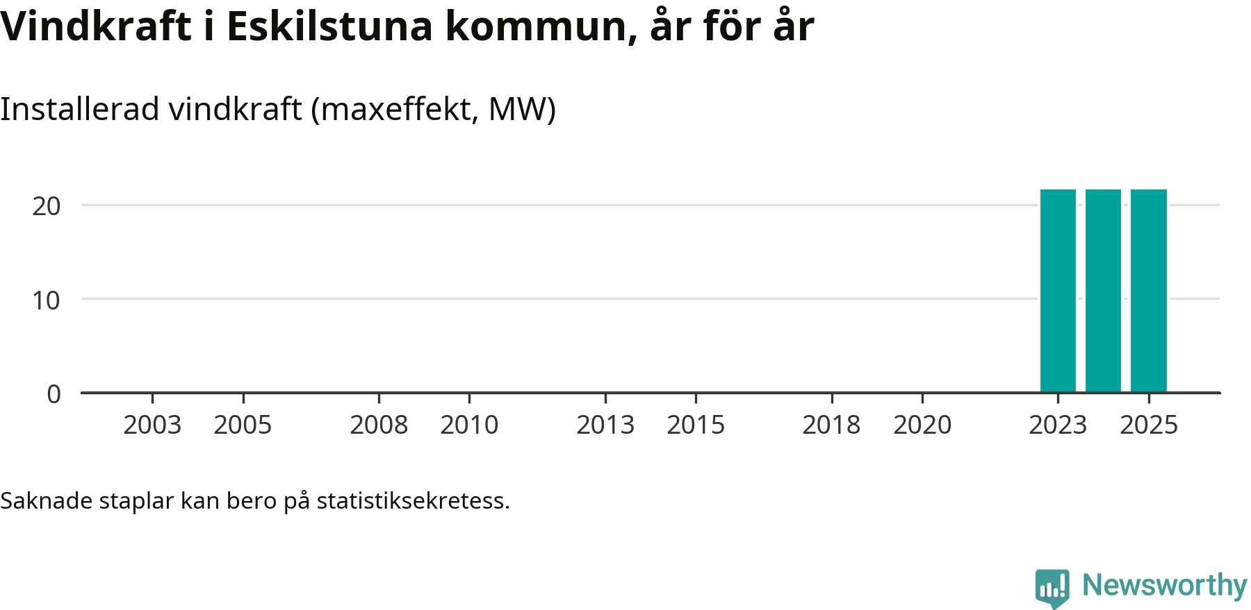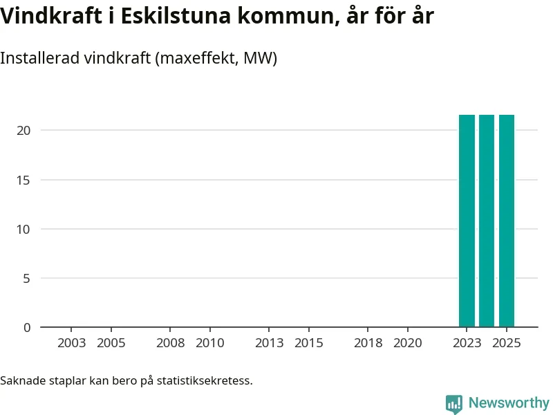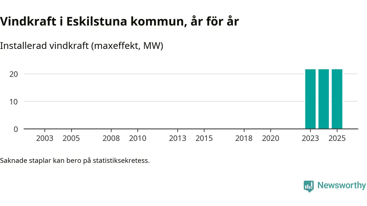 Totalt fanns i slutet av förra året sex vindkraftverk i Eskilstuna kommun, med en sammanlagd maxeffekt på 22 megawatt. Det är, för andra året i rad, oförändrade siffror jämfört med året innan. Det visar nya siffror från Energimyndigheten.