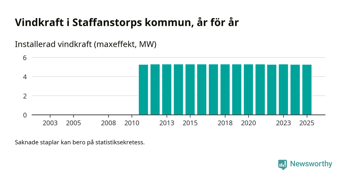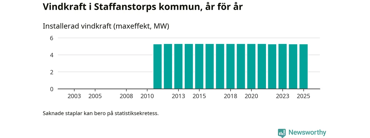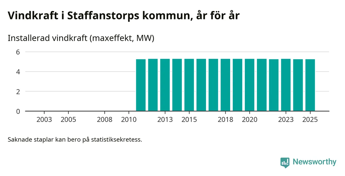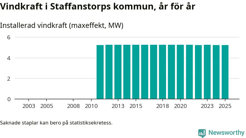 Totalt fanns i slutet av förra året fyra vindkraftverk i Staffanstorps kommun, med en sammanlagd maxeffekt på 5 megawatt. Det är oförändrade siffror jämfört med året innan. Det visar nya siffror från Energimyndigheten.