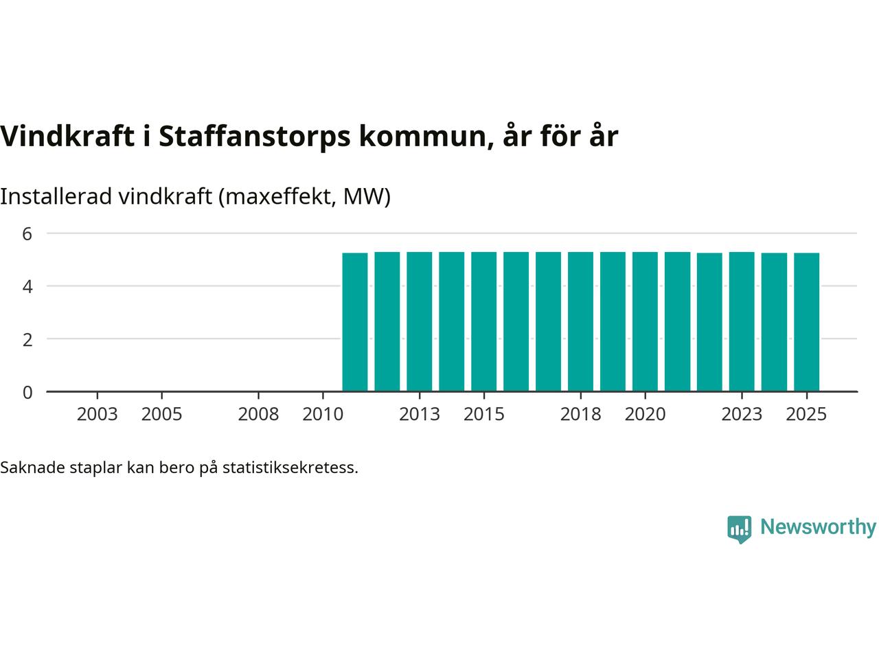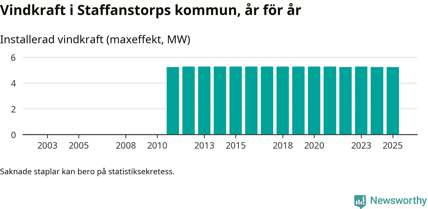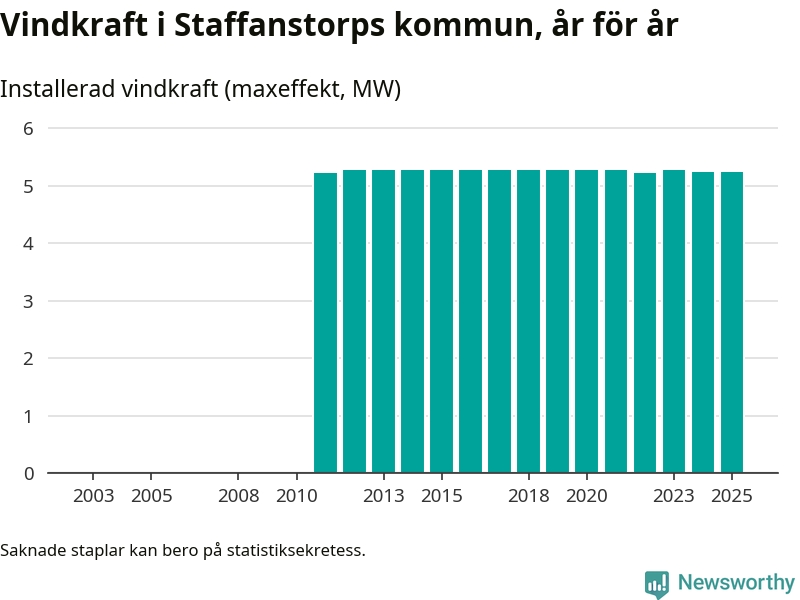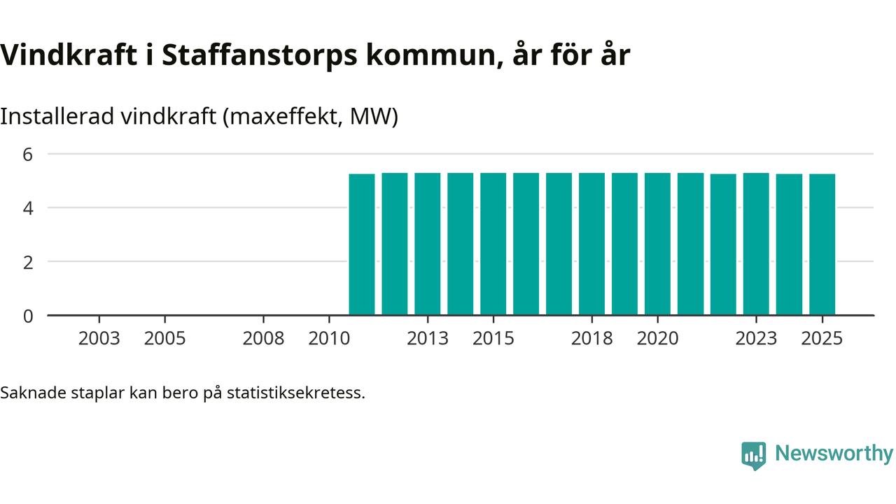 Totalt fanns i slutet av förra året fyra vindkraftverk i Staffanstorps kommun, med en sammanlagd maxeffekt på 5 megawatt. Det är oförändrade siffror jämfört med året innan. Det visar nya siffror från Energimyndigheten.