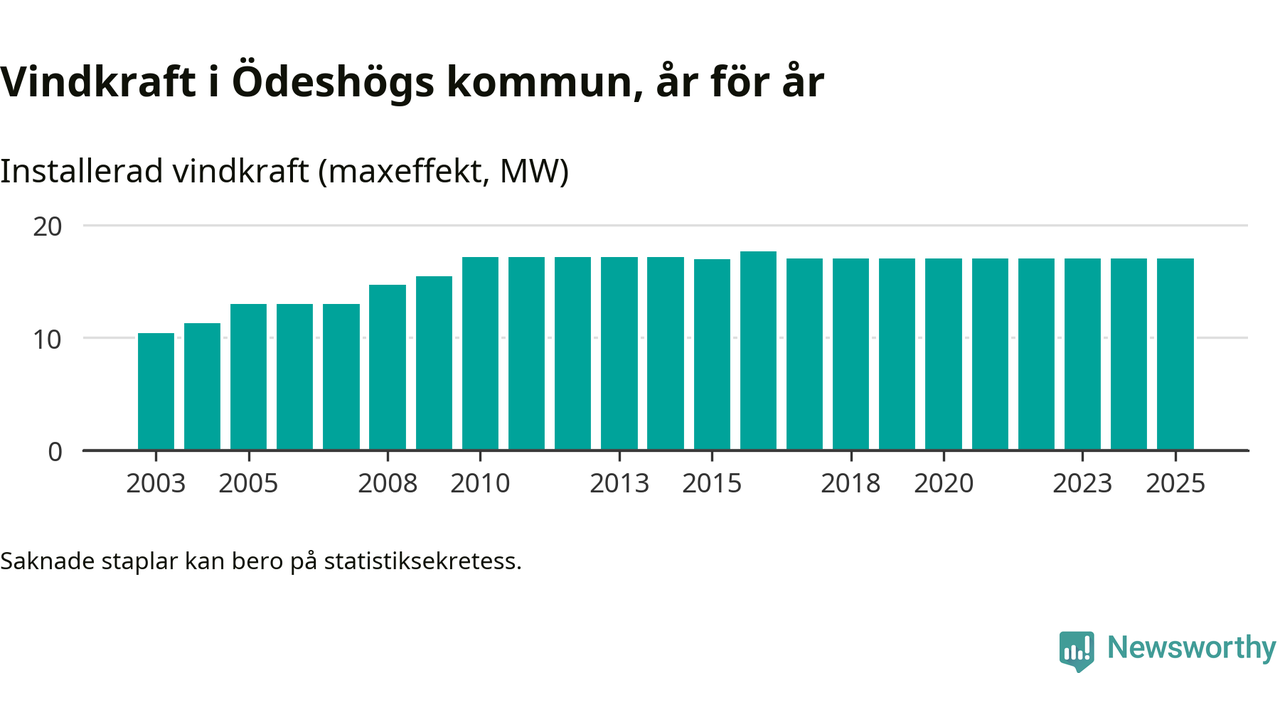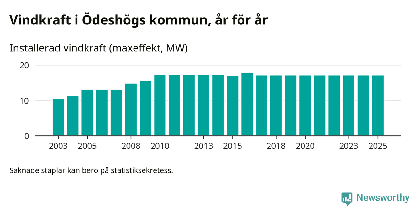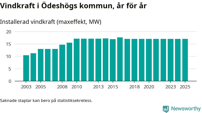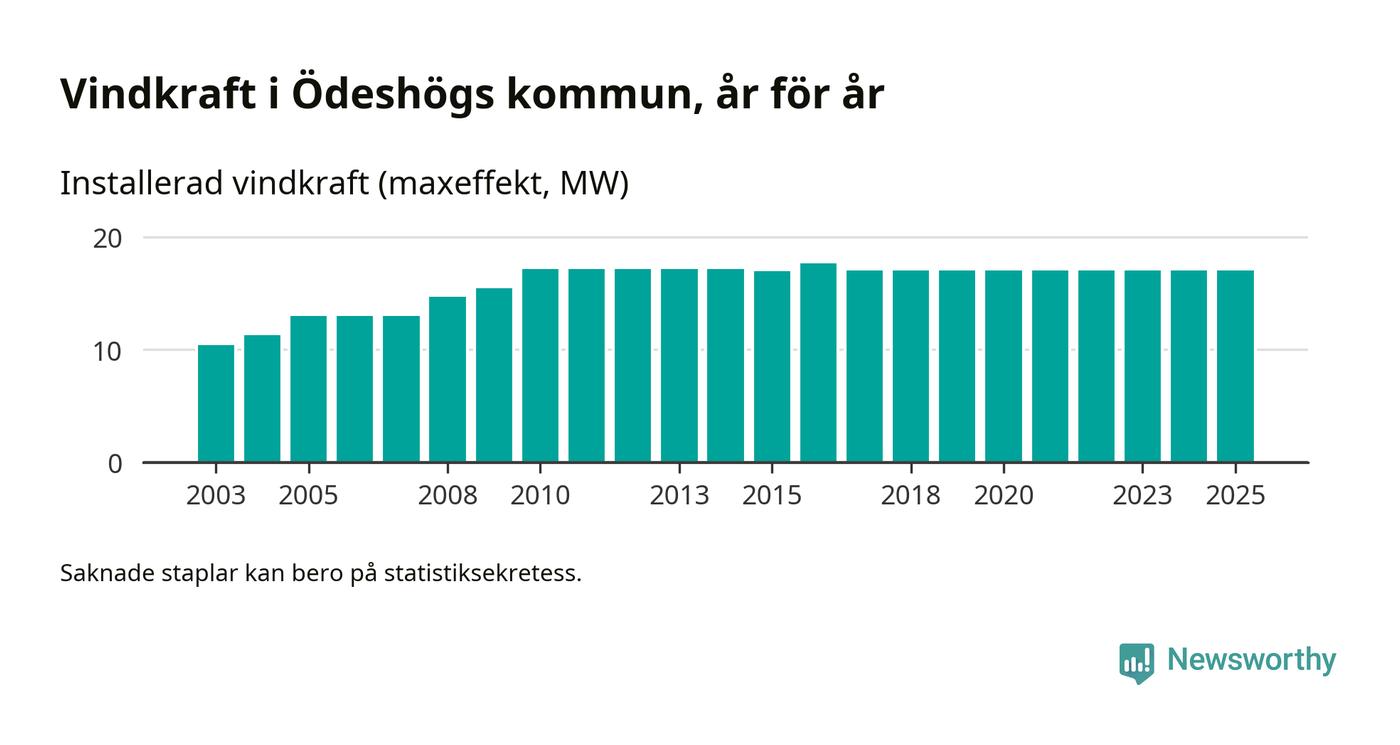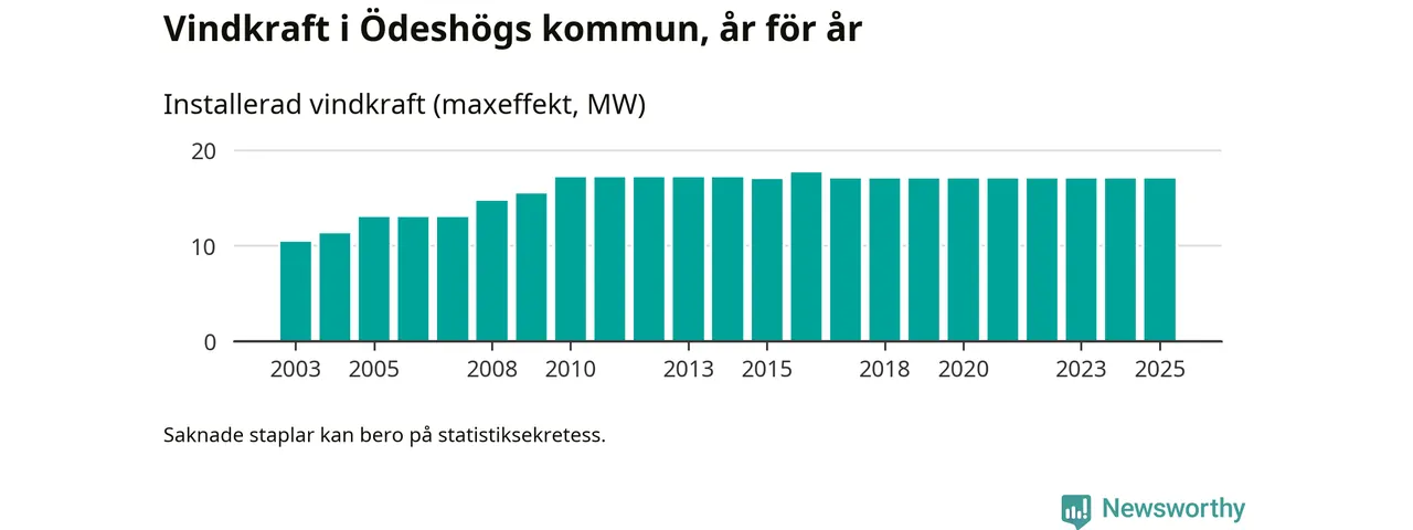 Totalt fanns i slutet av förra året 22 vindkraftverk i Ödeshögs kommun, med en sammanlagd maxeffekt på 17 megawatt. Det är, för åttonde året i rad, oförändrade siffror jämfört med året innan. Det visar nya siffror från Energimyndigheten.