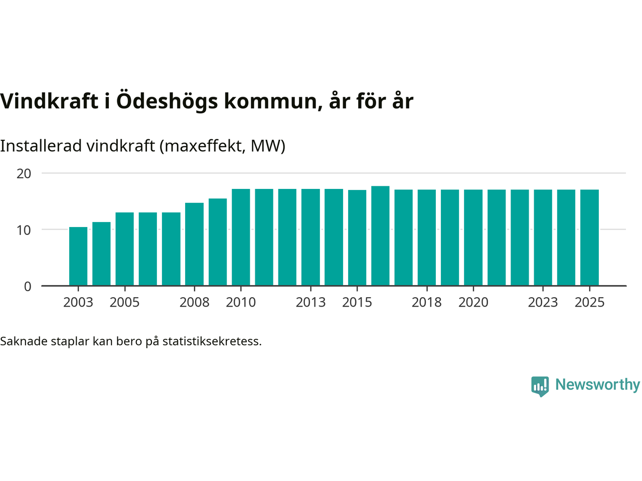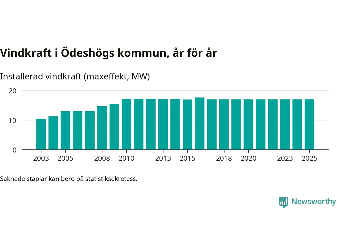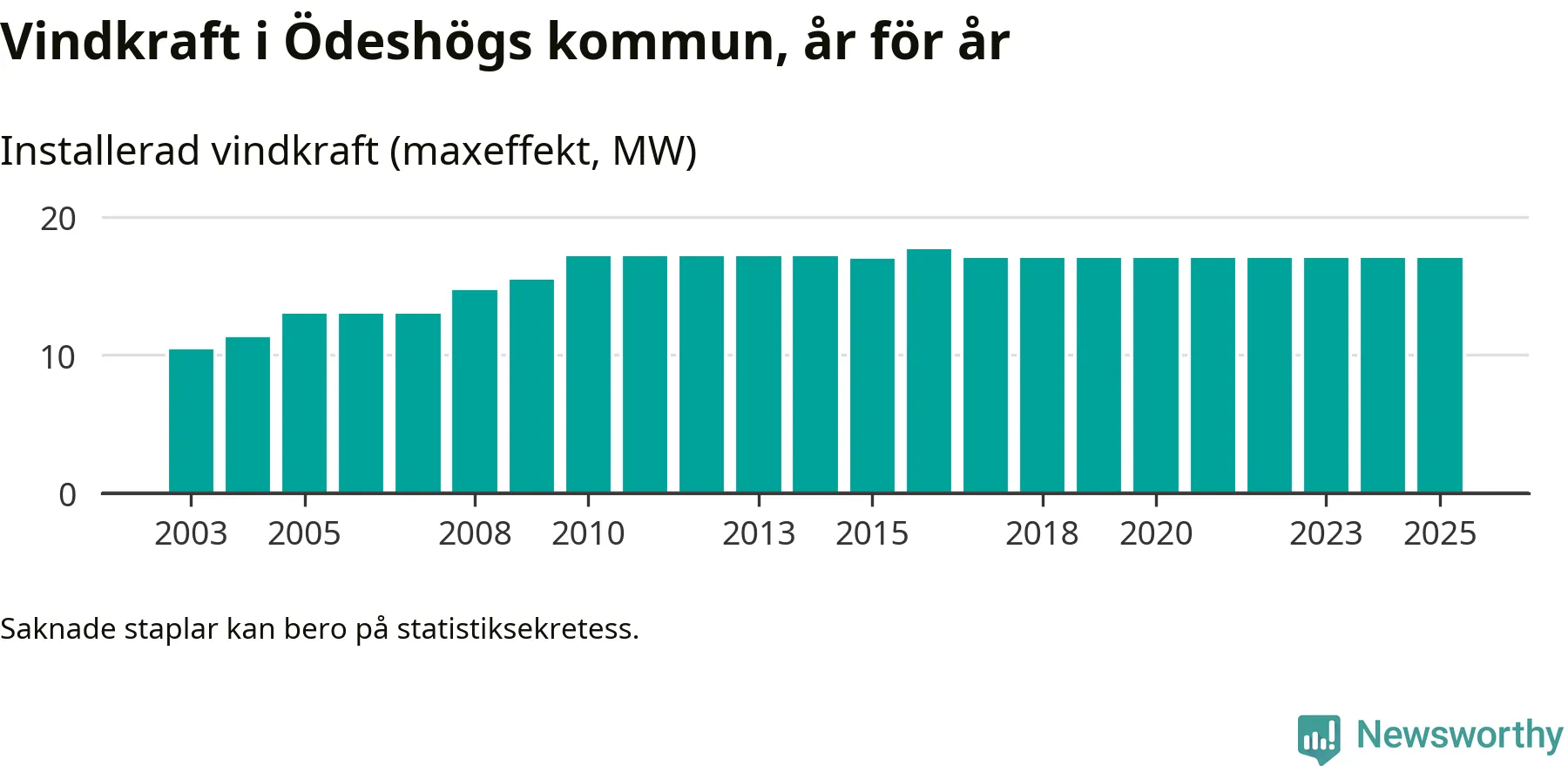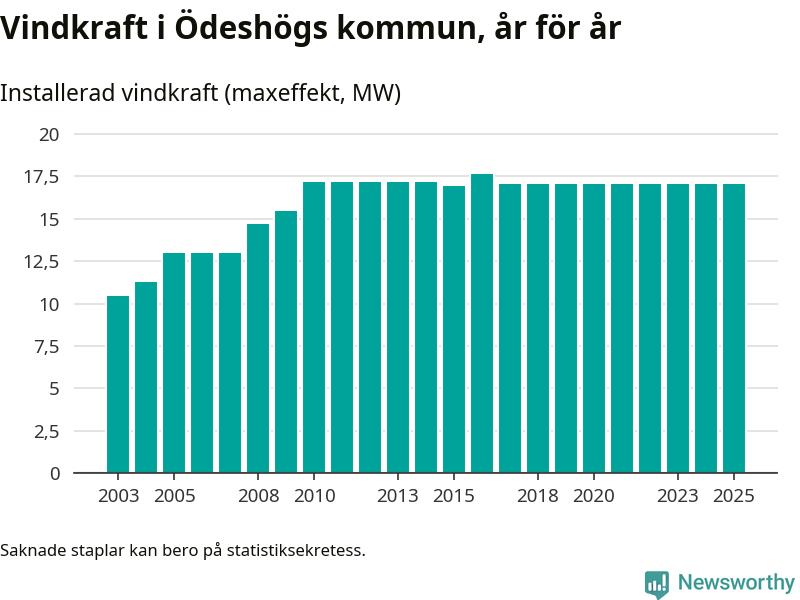 Totalt fanns i slutet av förra året 22 vindkraftverk i Ödeshögs kommun, med en sammanlagd maxeffekt på 17 megawatt. Det är, för åttonde året i rad, oförändrade siffror jämfört med året innan. Det visar nya siffror från Energimyndigheten.