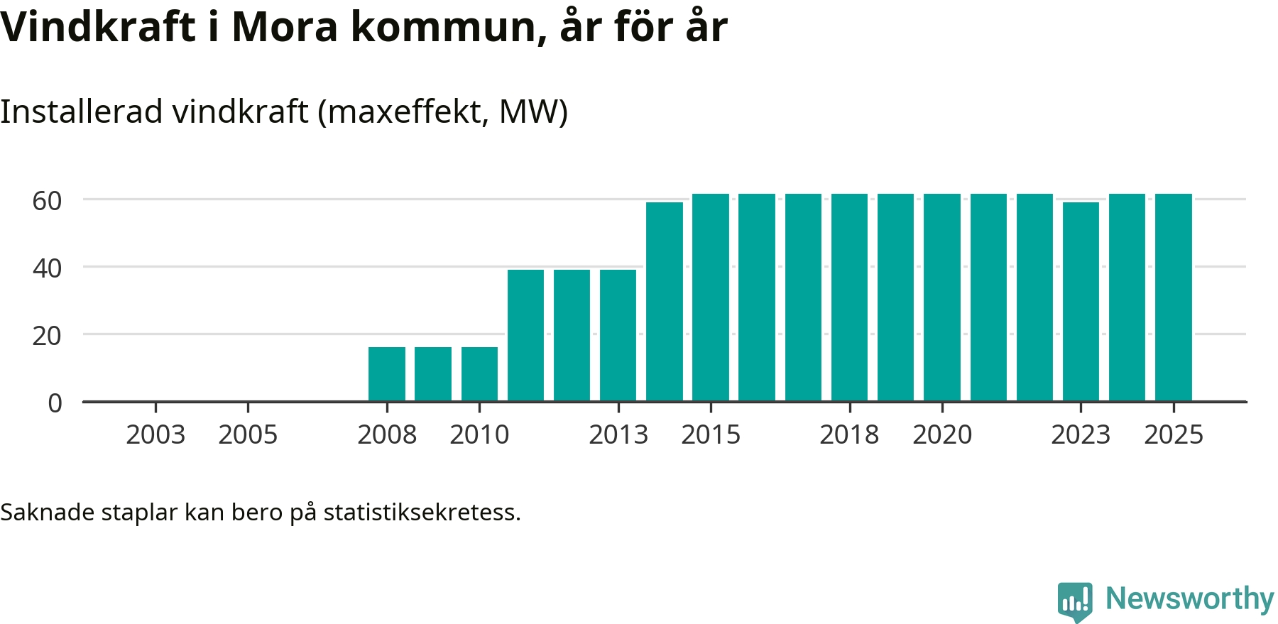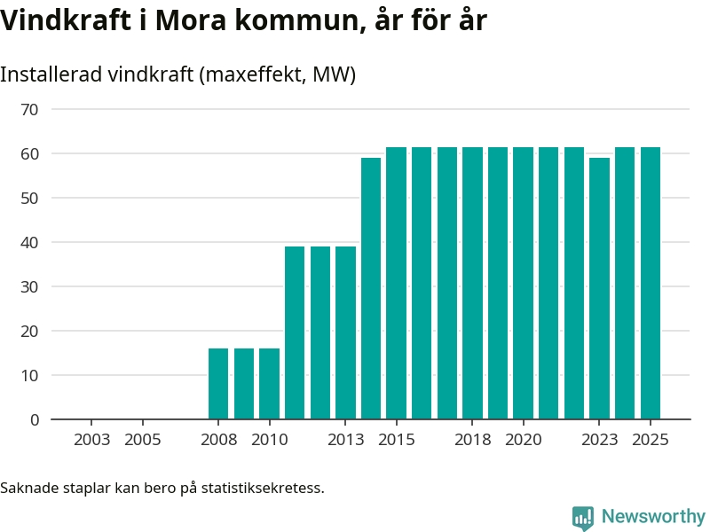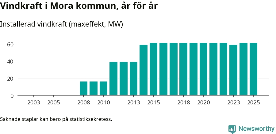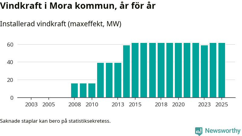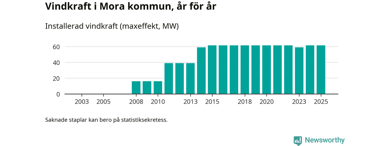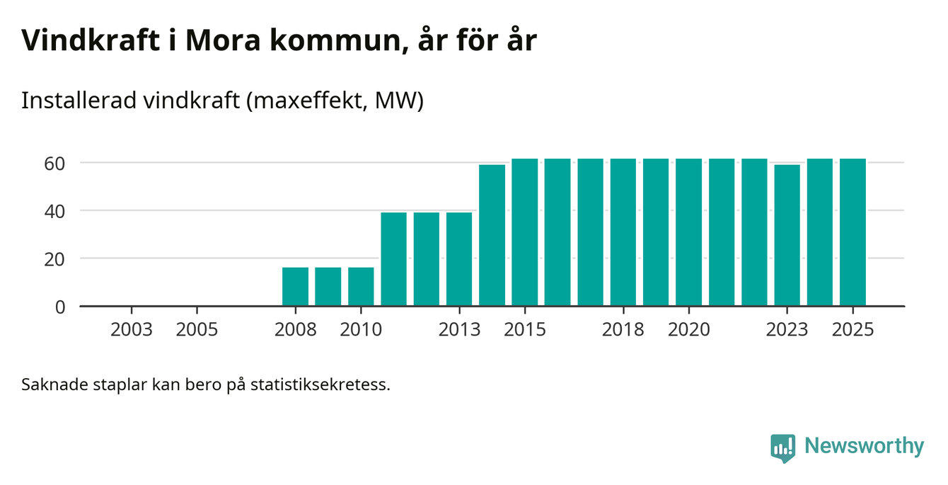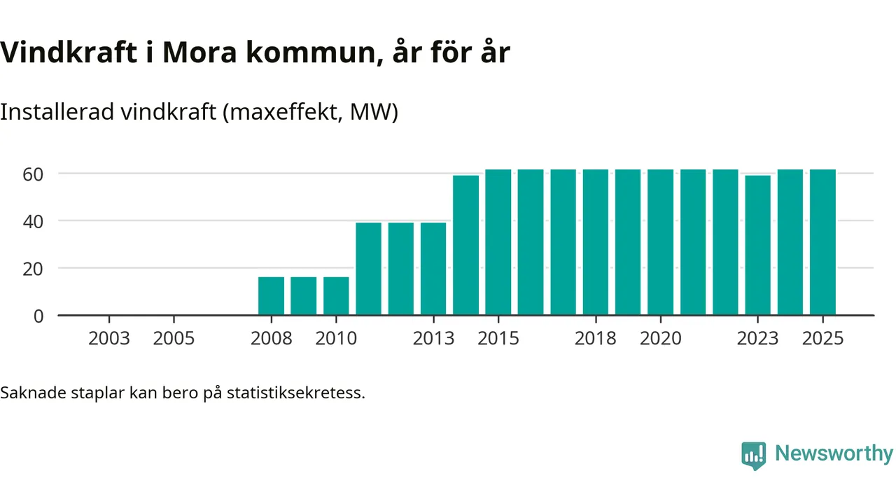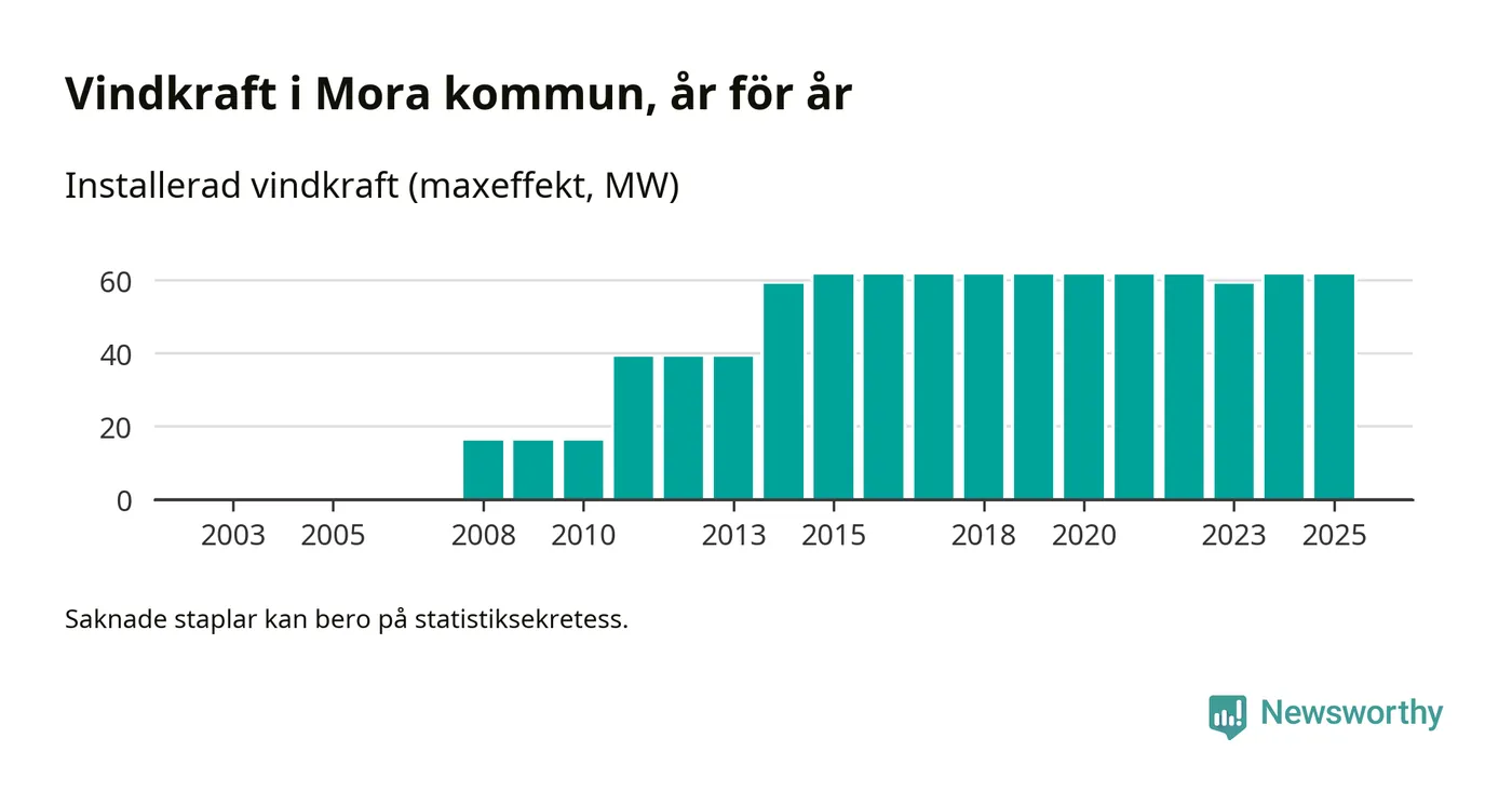 Totalt fanns i slutet av förra året 27 vindkraftverk i Mora kommun, med en sammanlagd maxeffekt på 62 megawatt. Det är oförändrade siffror jämfört med året innan. Det visar nya siffror från Energimyndigheten.