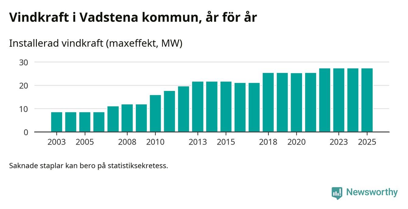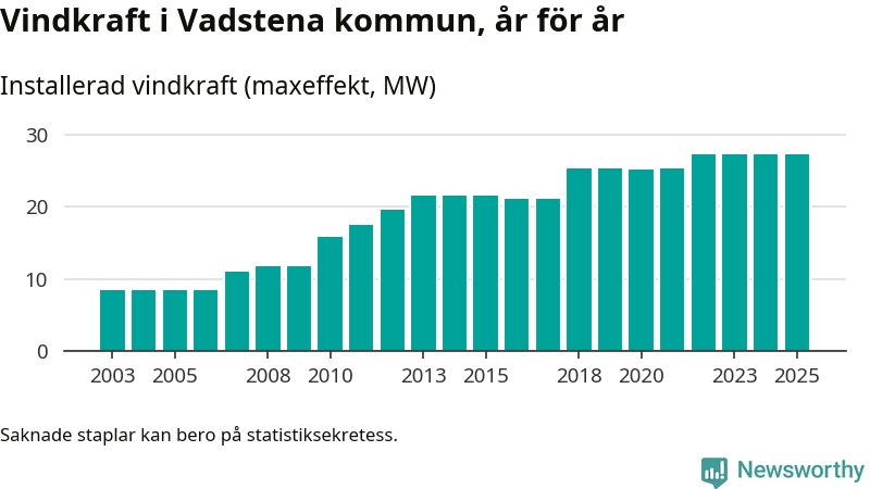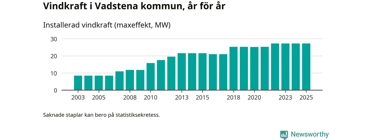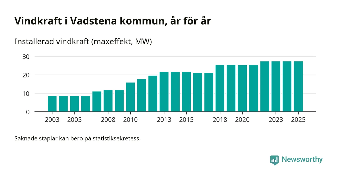 Totalt fanns i slutet av förra året 25 vindkraftverk i Vadstena kommun, med en sammanlagd maxeffekt på 27 megawatt. Det är, för tredje året i rad, oförändrade siffror jämfört med året innan. Det visar nya siffror från Energimyndigheten.