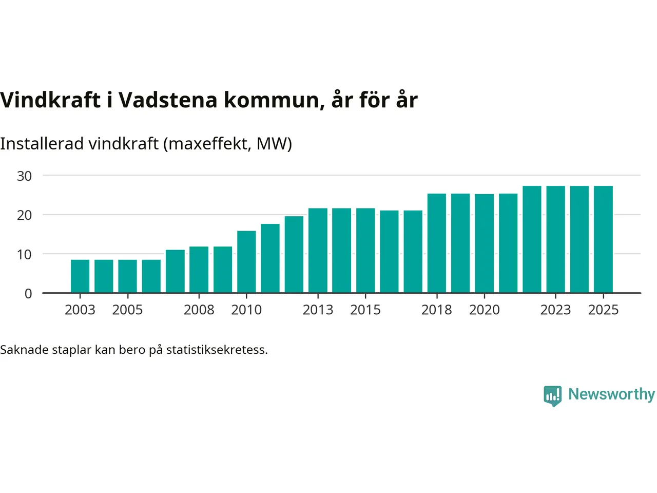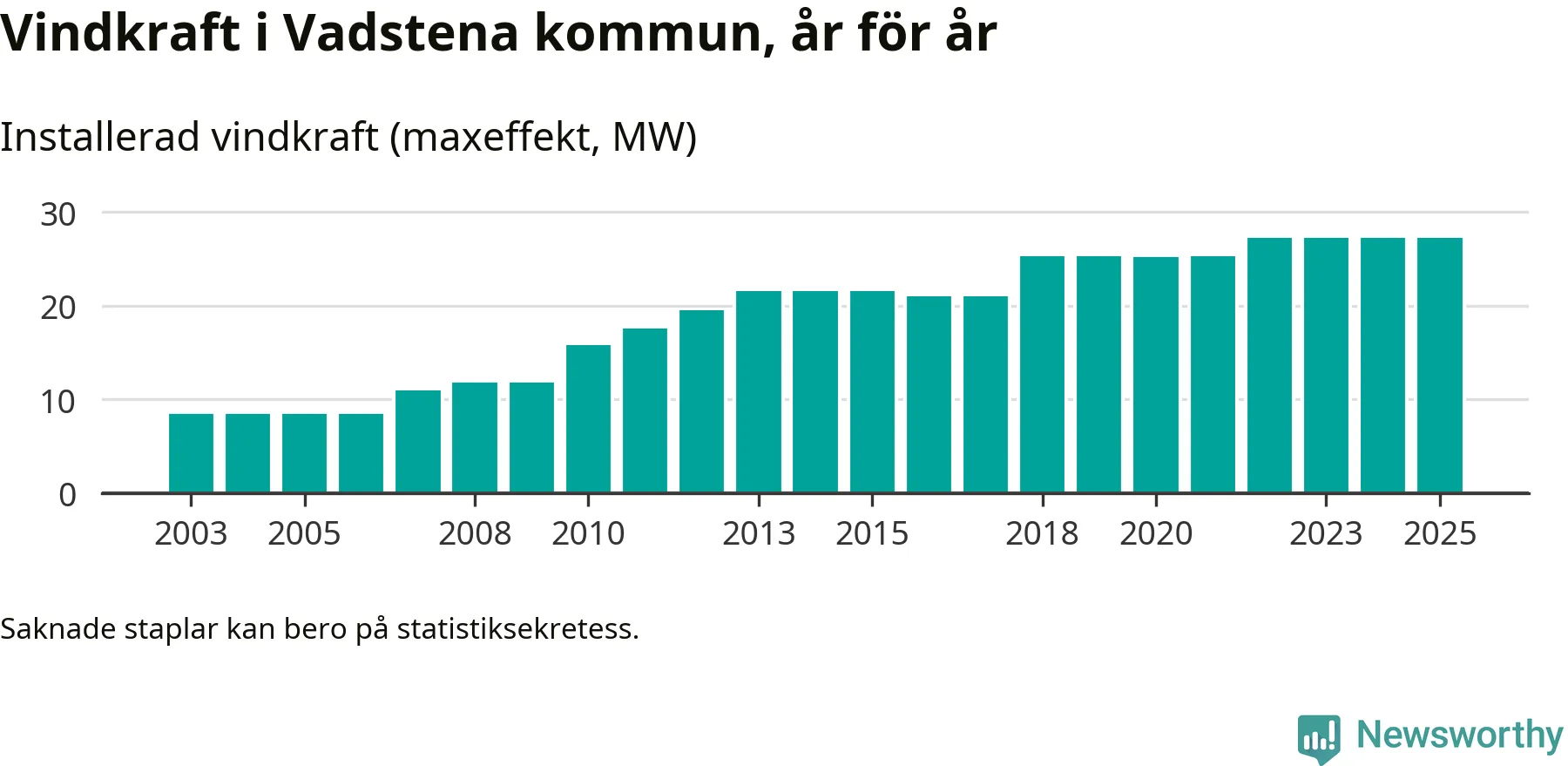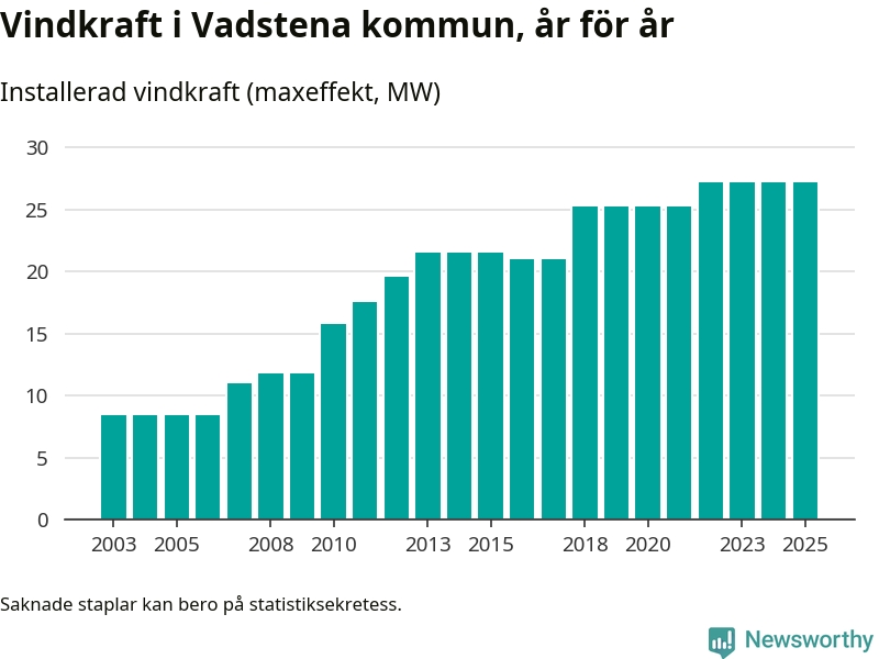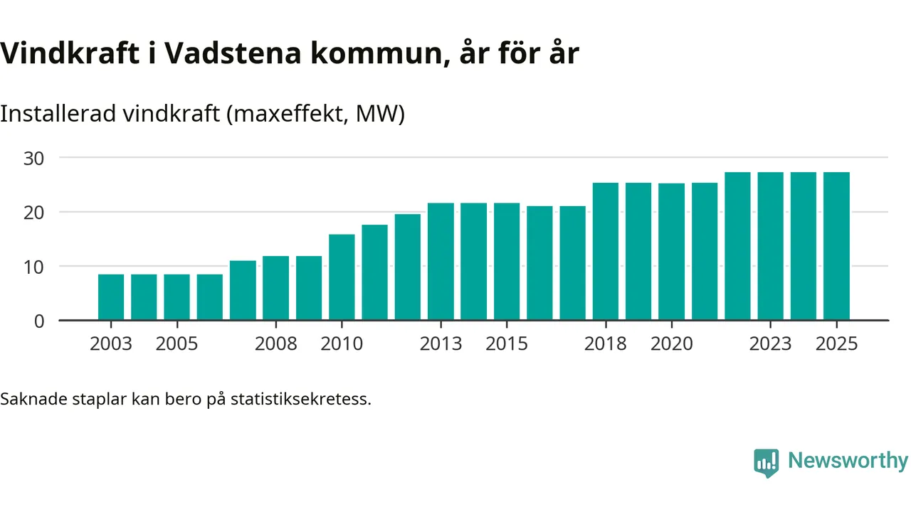 Totalt fanns i slutet av förra året 25 vindkraftverk i Vadstena kommun, med en sammanlagd maxeffekt på 27 megawatt. Det är, för tredje året i rad, oförändrade siffror jämfört med året innan. Det visar nya siffror från Energimyndigheten.