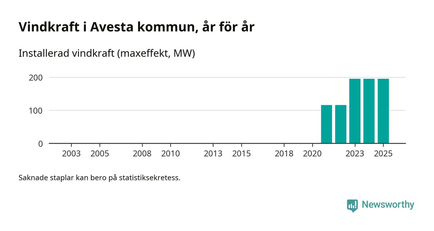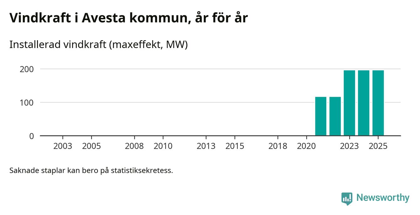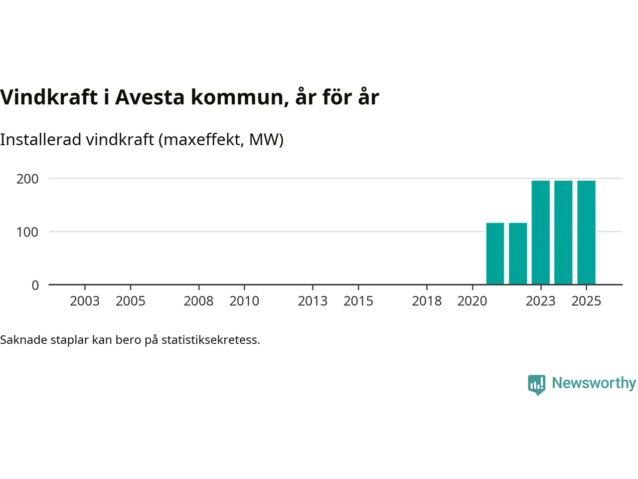 Totalt fanns i slutet av förra året 39 vindkraftverk i Avesta kommun, med en sammanlagd maxeffekt på 195 megawatt. Det är, för andra året i rad, oförändrade siffror jämfört med året innan. Det visar nya siffror från Energimyndigheten.