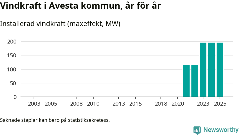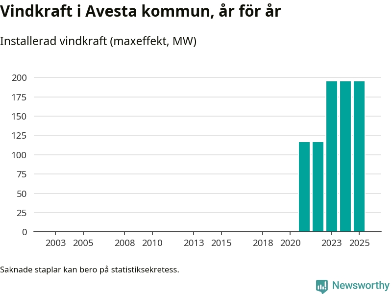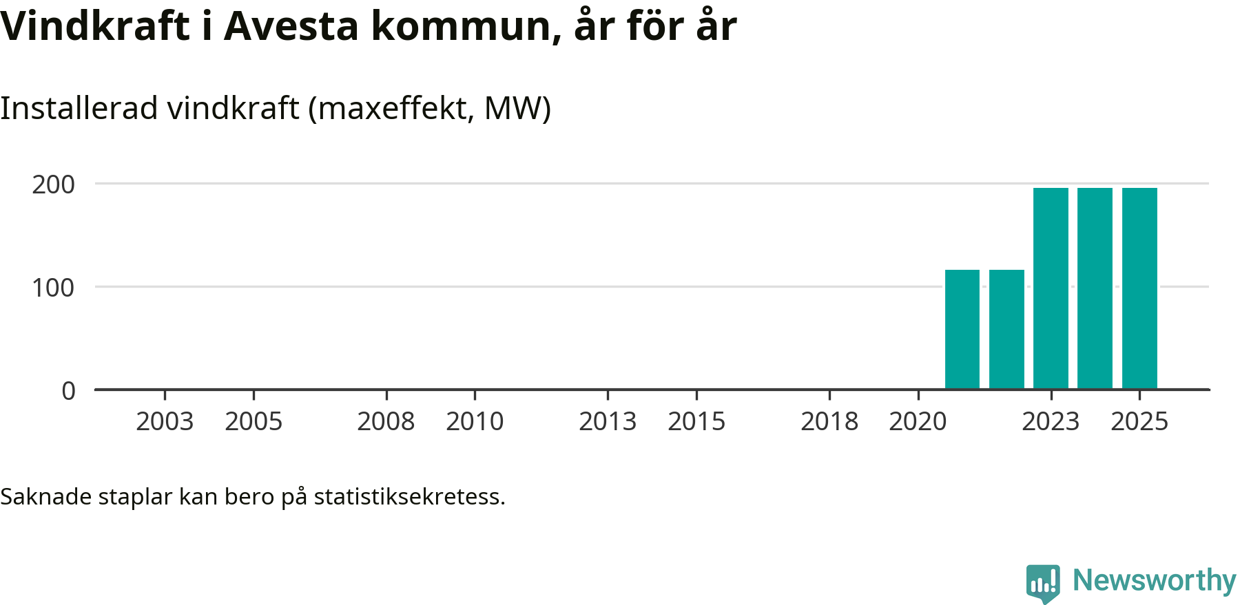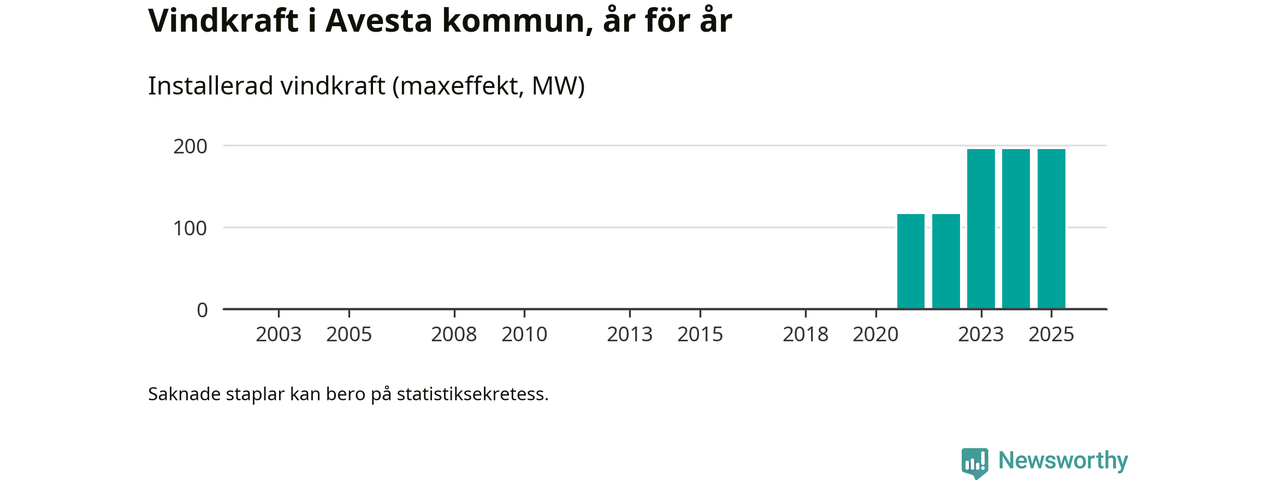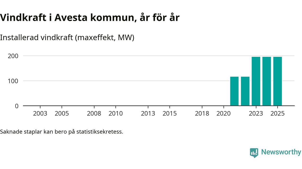 Totalt fanns i slutet av förra året 39 vindkraftverk i Avesta kommun, med en sammanlagd maxeffekt på 195 megawatt. Det är, för andra året i rad, oförändrade siffror jämfört med året innan. Det visar nya siffror från Energimyndigheten.