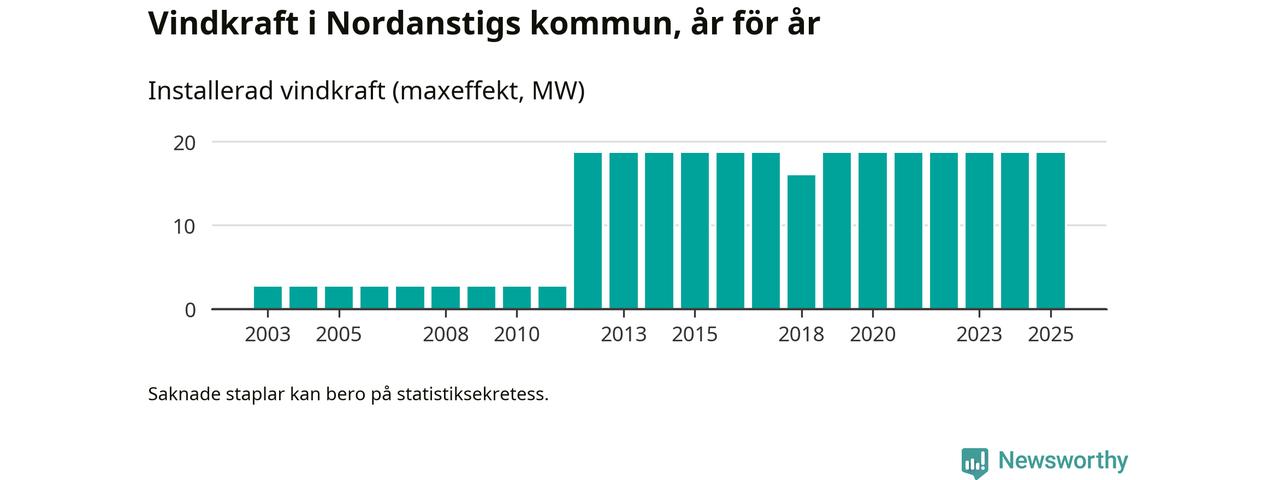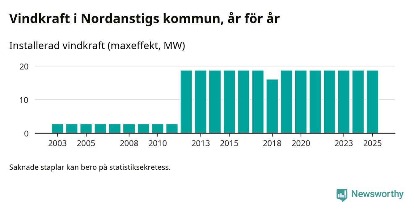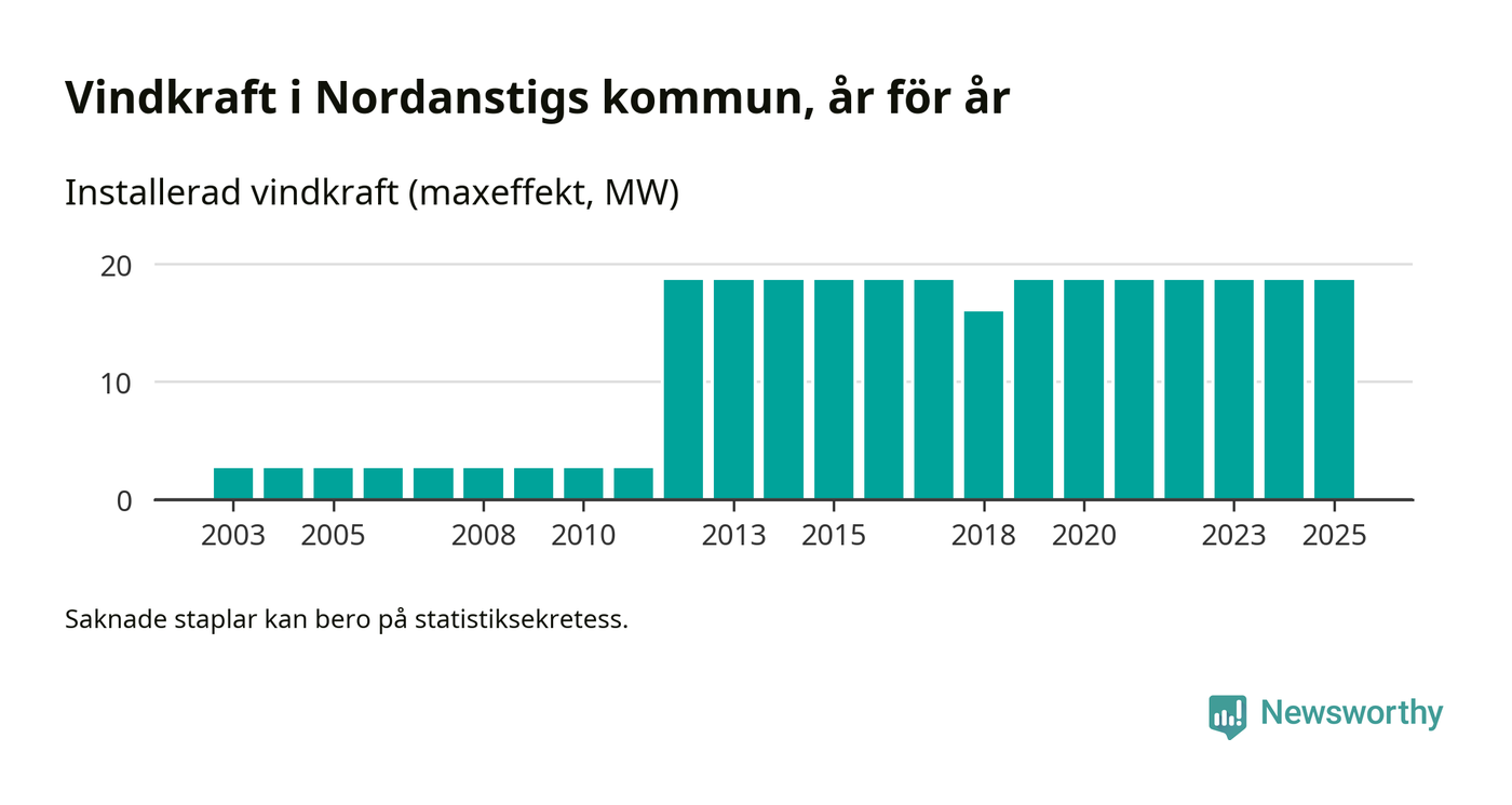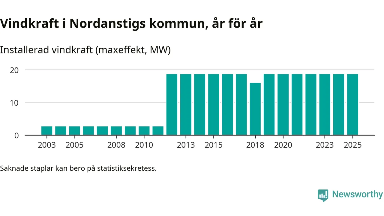 Totalt fanns i slutet av förra året tolv vindkraftverk i Nordanstigs kommun, med en sammanlagd maxeffekt på 19 megawatt. Det är, för sjätte året i rad, oförändrade siffror jämfört med året innan. Det visar nya siffror från Energimyndigheten.