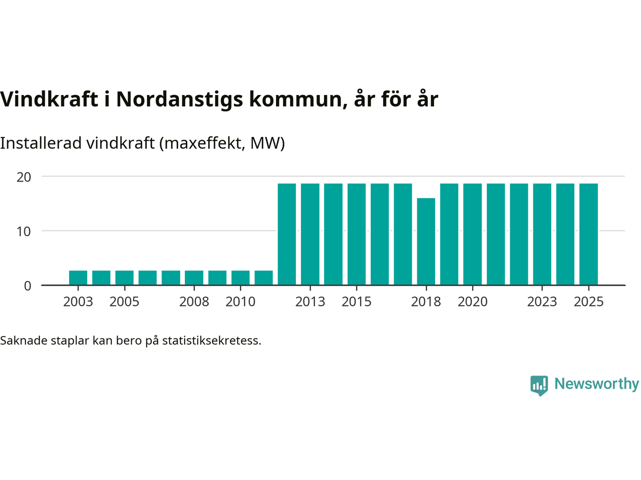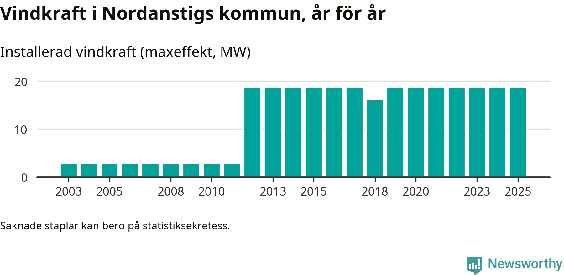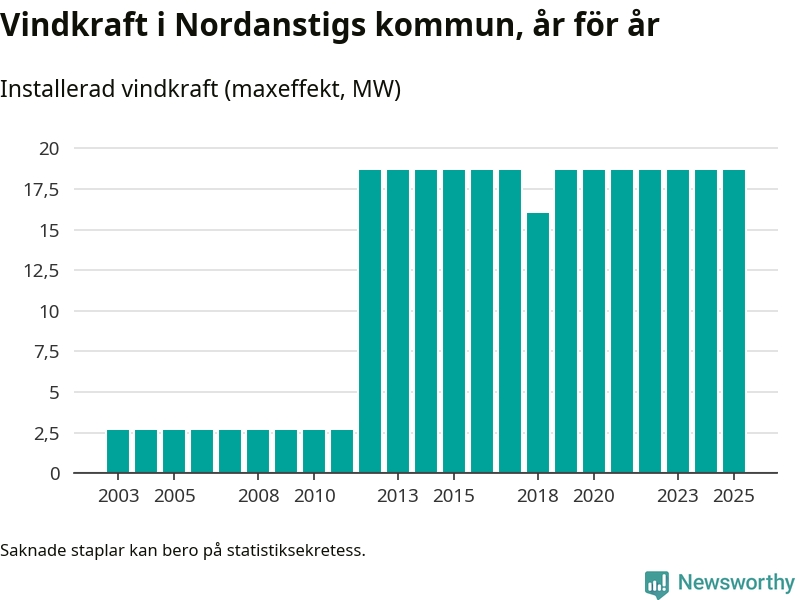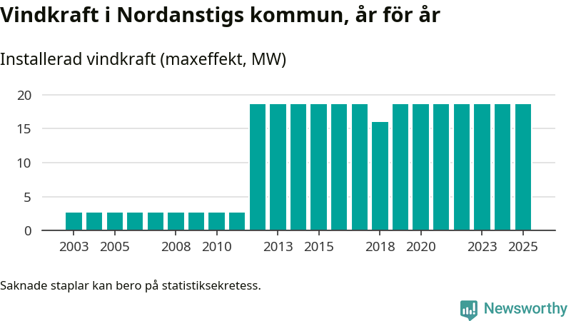 Totalt fanns i slutet av förra året tolv vindkraftverk i Nordanstigs kommun, med en sammanlagd maxeffekt på 19 megawatt. Det är, för sjätte året i rad, oförändrade siffror jämfört med året innan. Det visar nya siffror från Energimyndigheten.