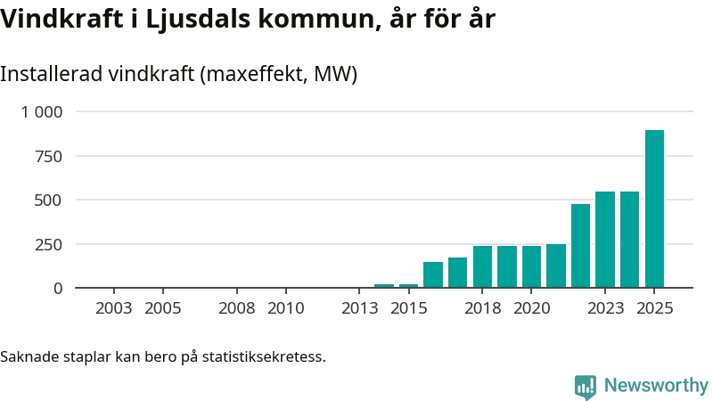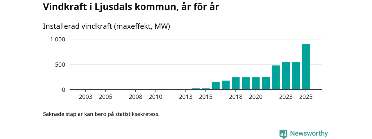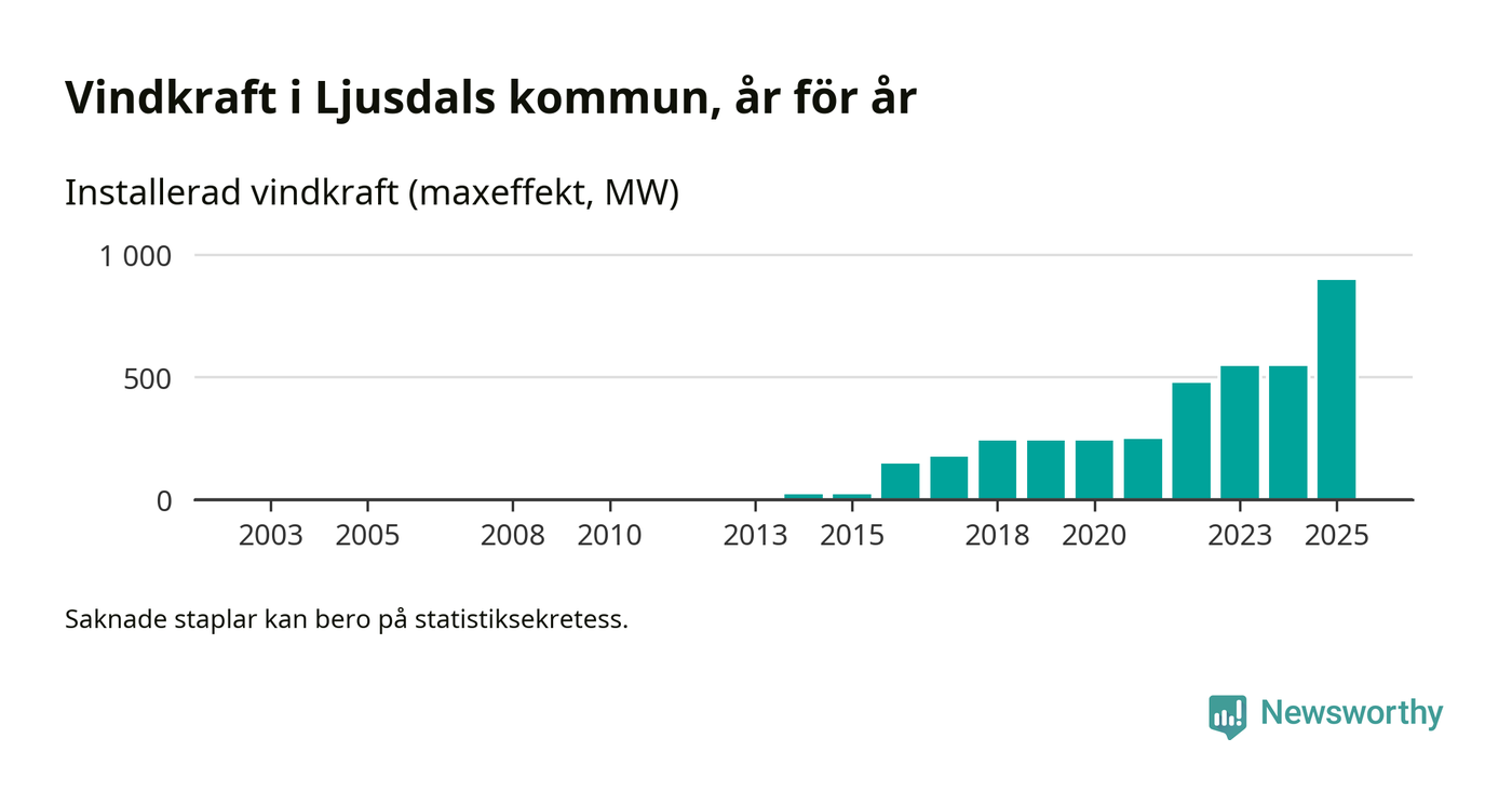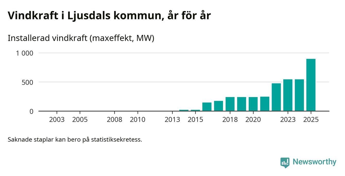 Totalt fanns i slutet av förra året 173 vindkraftverk i Ljusdals kommun, med en sammanlagd maxeffekt på 895 megawatt. Det är en ökning med 349,8 megawatt, eller 64 procent, jämfört med året innan. Det visar nya siffror från Energimyndigheten.