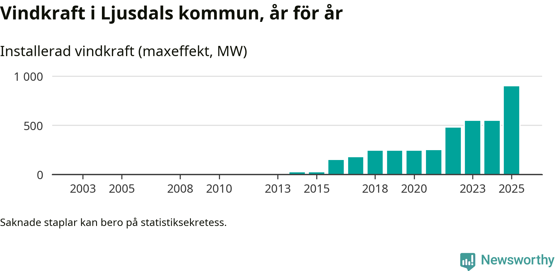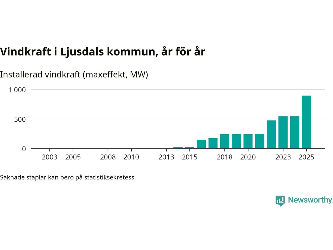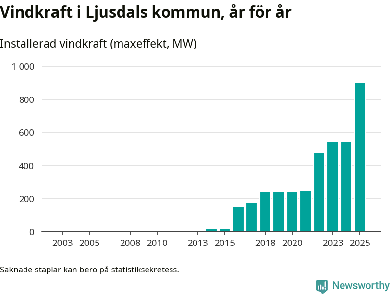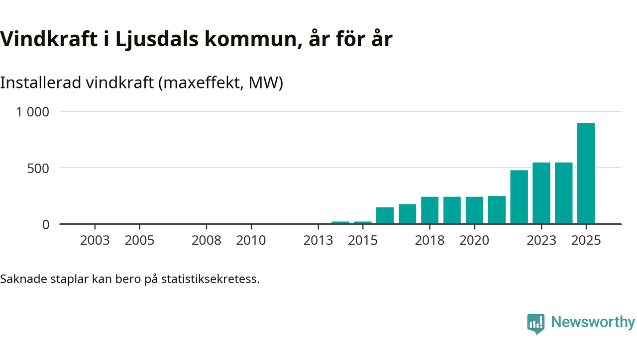 Totalt fanns i slutet av förra året 173 vindkraftverk i Ljusdals kommun, med en sammanlagd maxeffekt på 895 megawatt. Det är en ökning med 349,8 megawatt, eller 64 procent, jämfört med året innan. Det visar nya siffror från Energimyndigheten.
