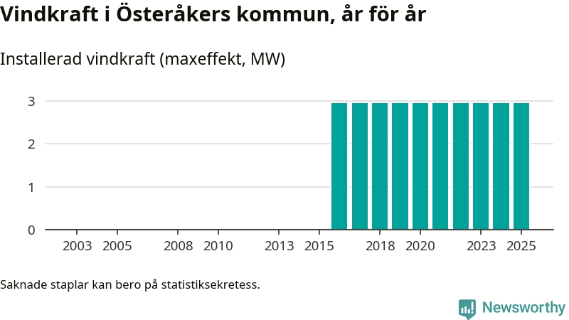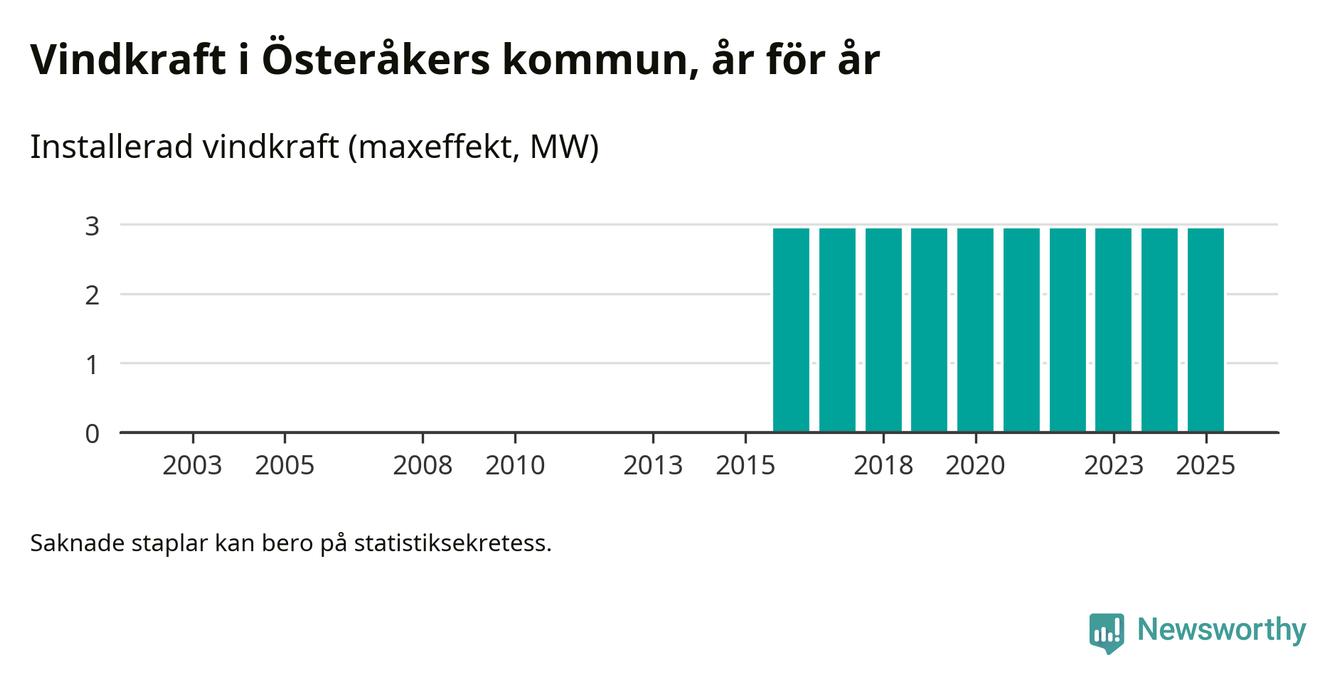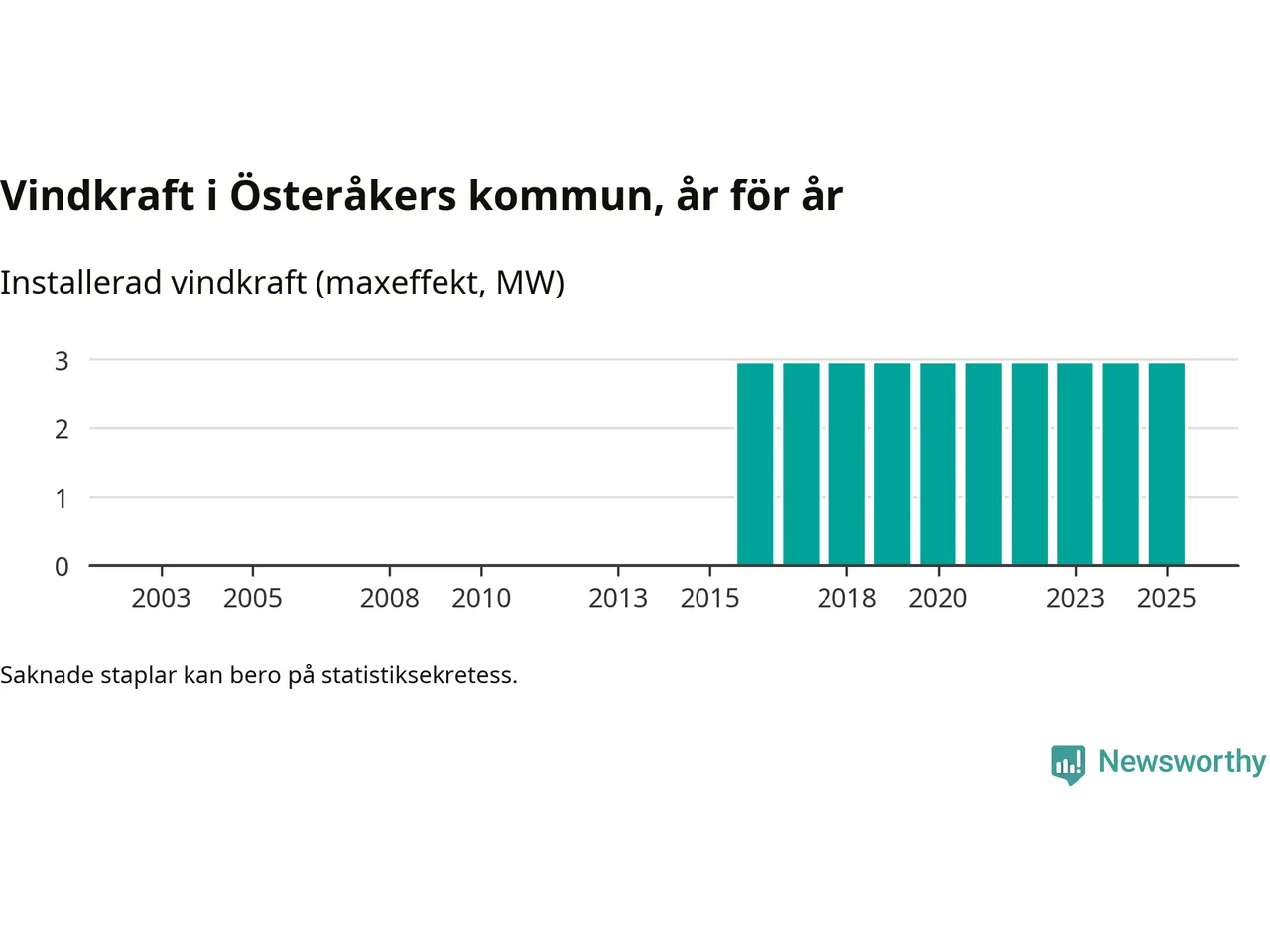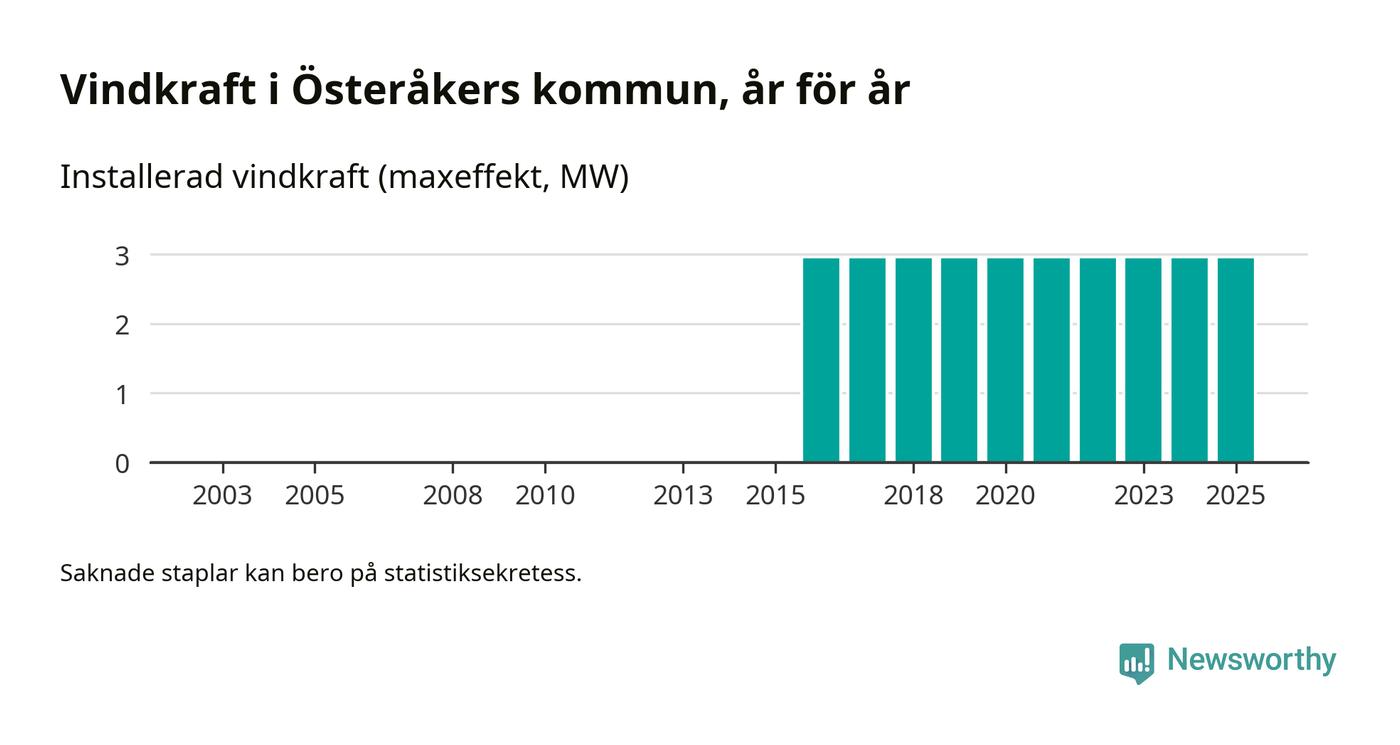 Totalt fanns i slutet av förra året tre vindkraftverk i Österåkers kommun, med en sammanlagd maxeffekt på 3 megawatt. Det är, för nionde året i rad, oförändrade siffror jämfört med året innan. Det visar nya siffror från Energimyndigheten.