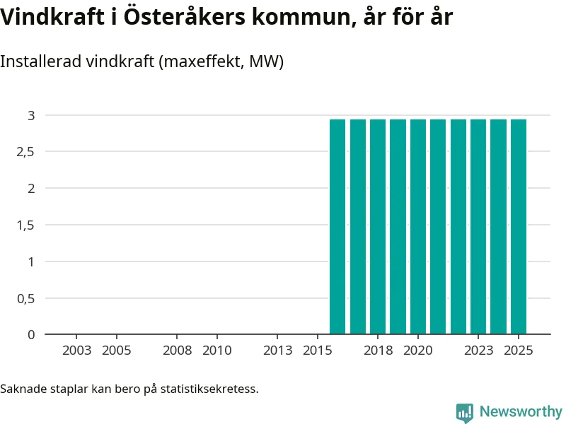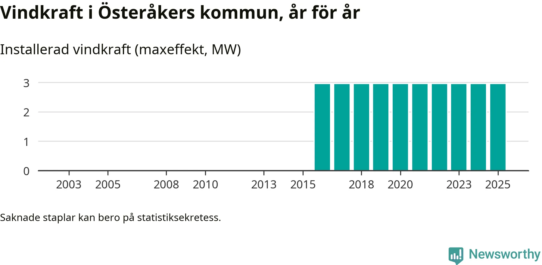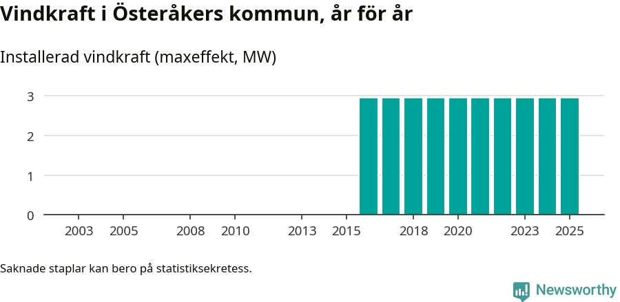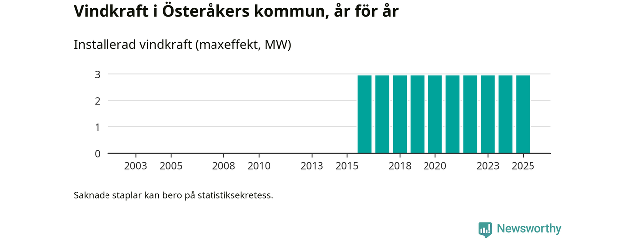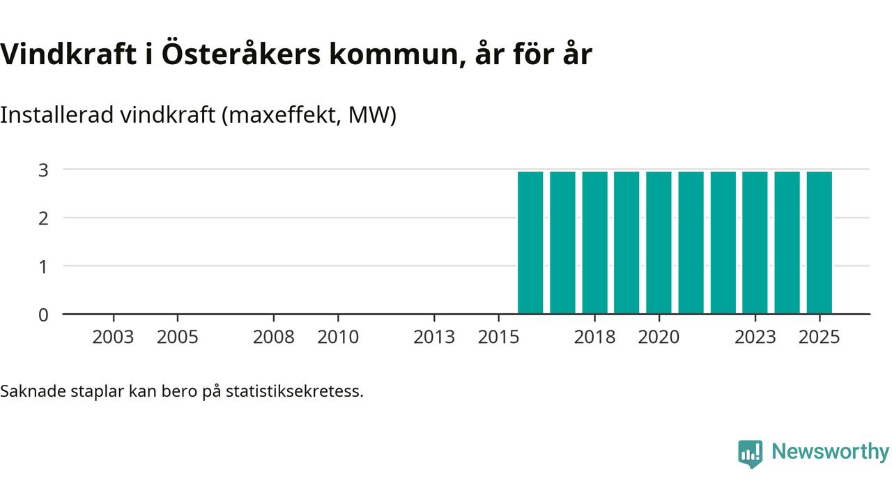 Totalt fanns i slutet av förra året tre vindkraftverk i Österåkers kommun, med en sammanlagd maxeffekt på 3 megawatt. Det är, för nionde året i rad, oförändrade siffror jämfört med året innan. Det visar nya siffror från Energimyndigheten.