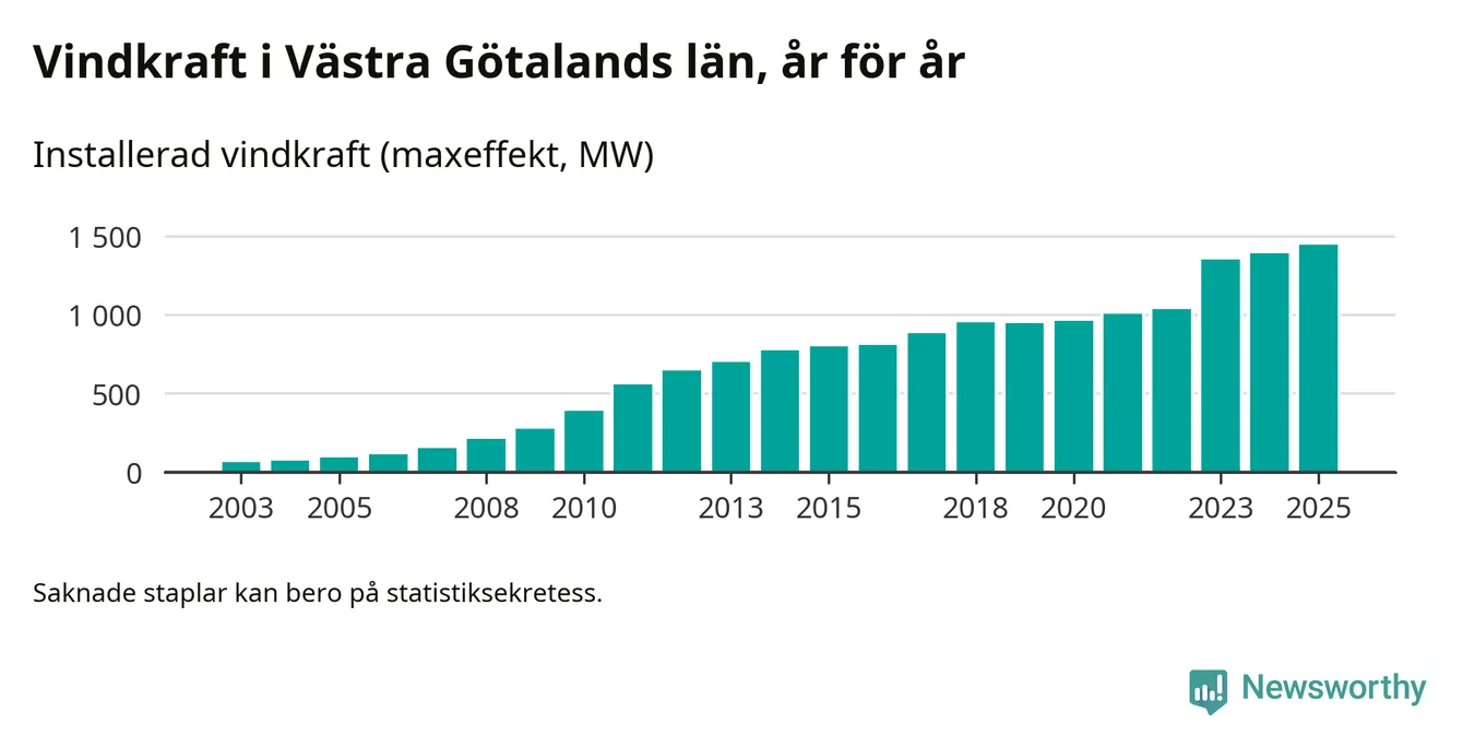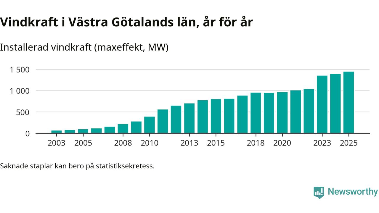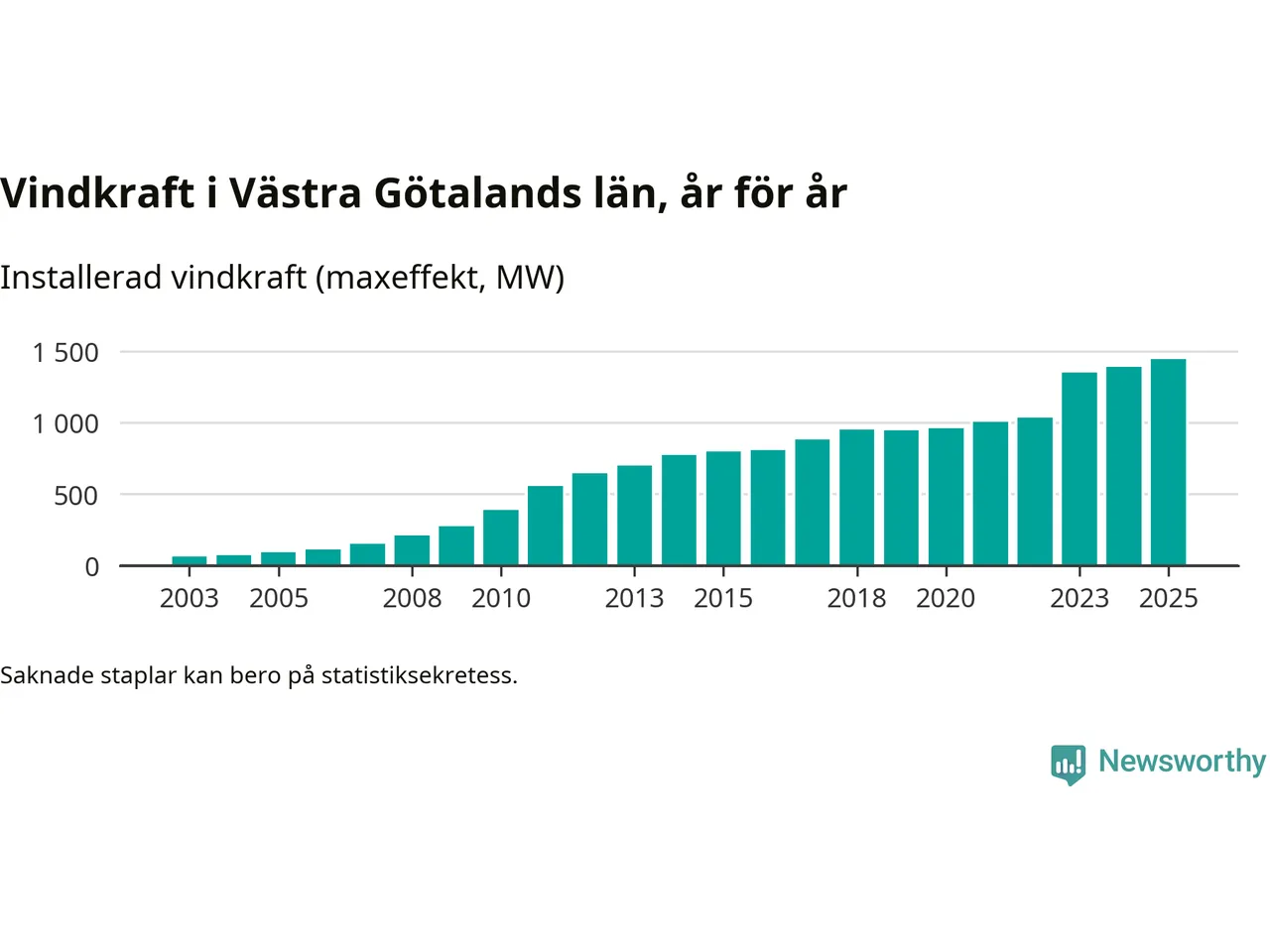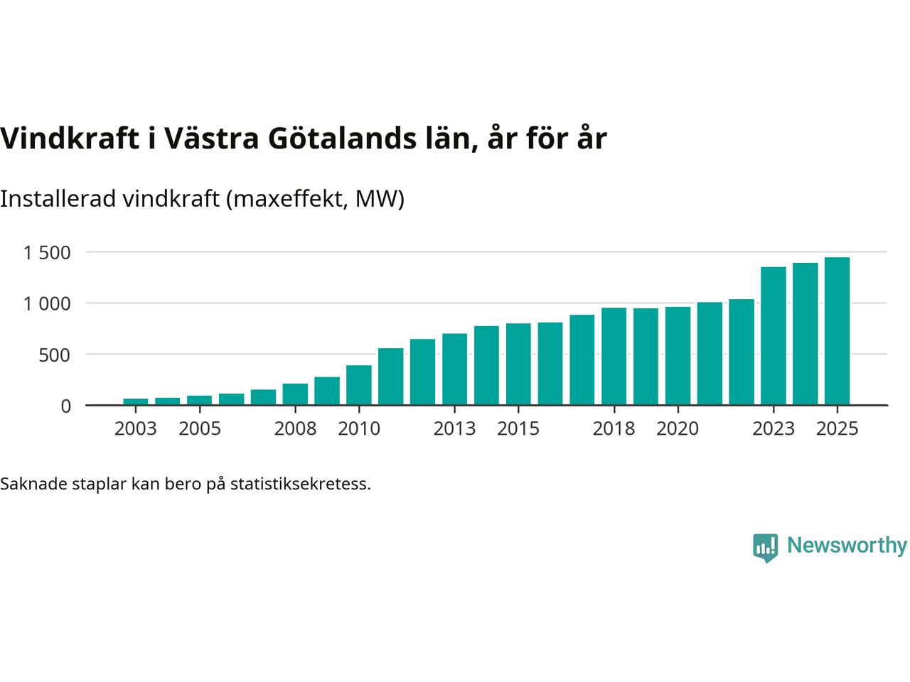 Totalt fanns i slutet av förra året 630 vindkraftverk i Västra Götalands län, med en sammanlagd maxeffekt på 1 444 megawatt. Det är en ökning med 54,3 megawatt, eller 4 procent, jämfört med året innan. Det visar nya siffror från Energimyndigheten.