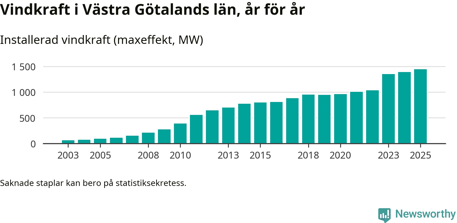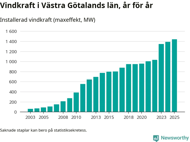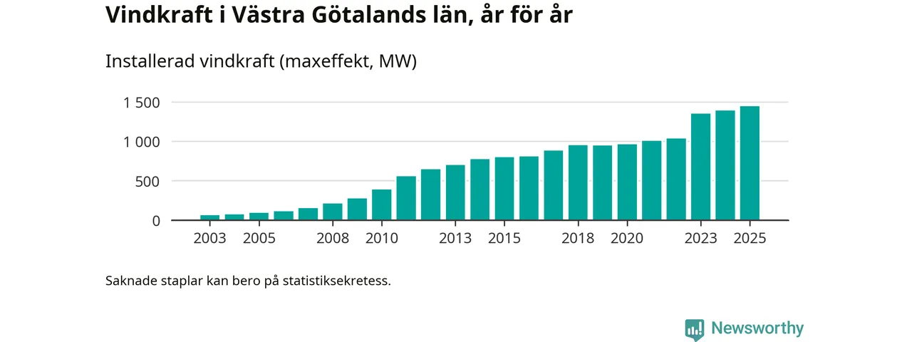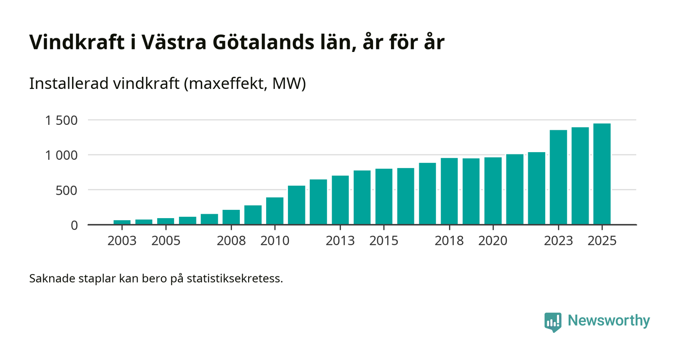 Totalt fanns i slutet av förra året 630 vindkraftverk i Västra Götalands län, med en sammanlagd maxeffekt på 1 444 megawatt. Det är en ökning med 54,3 megawatt, eller 4 procent, jämfört med året innan. Det visar nya siffror från Energimyndigheten.