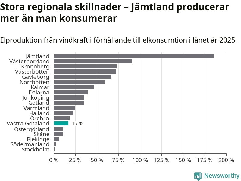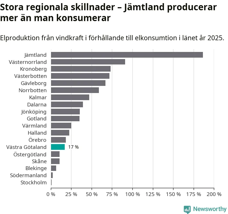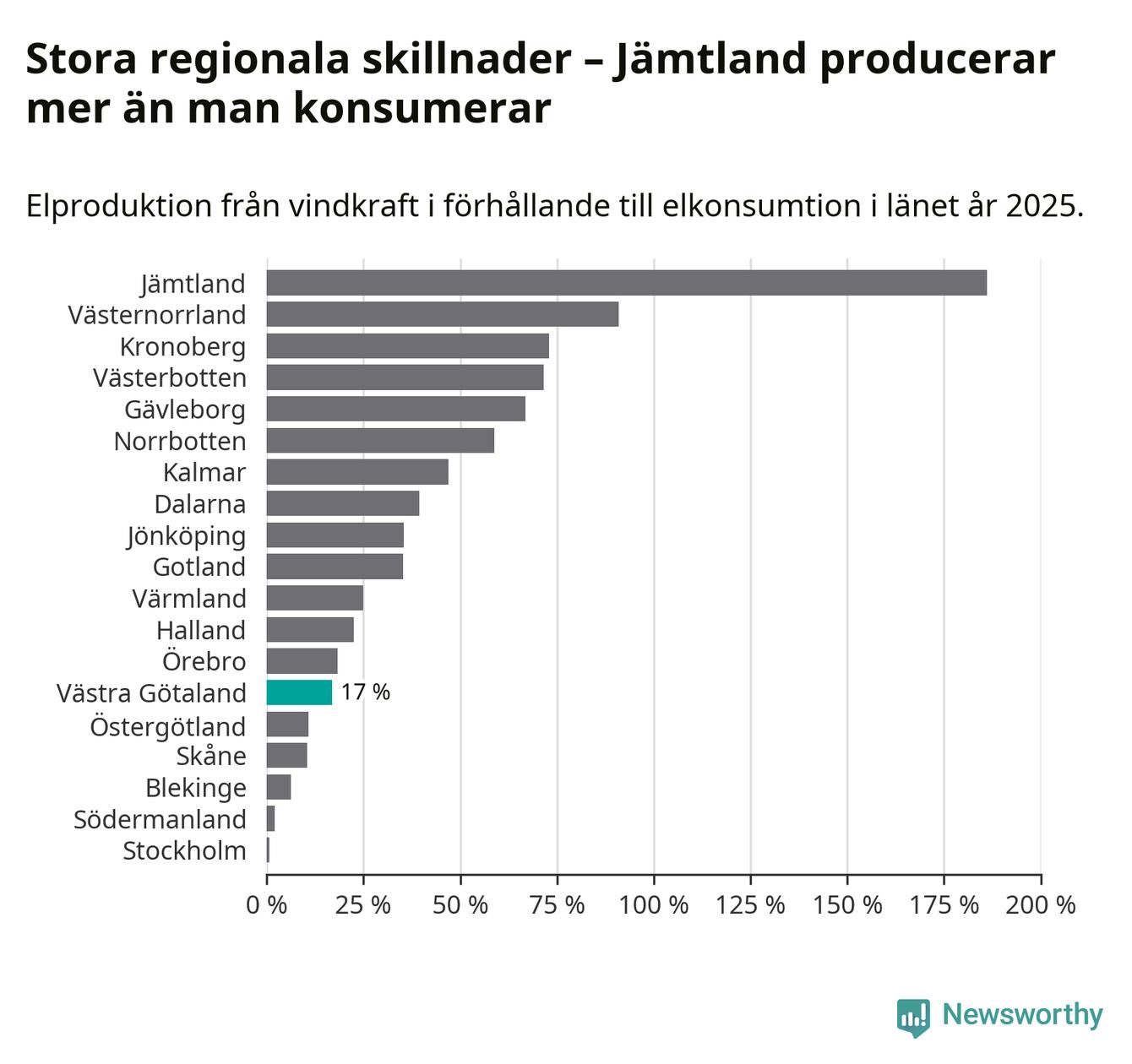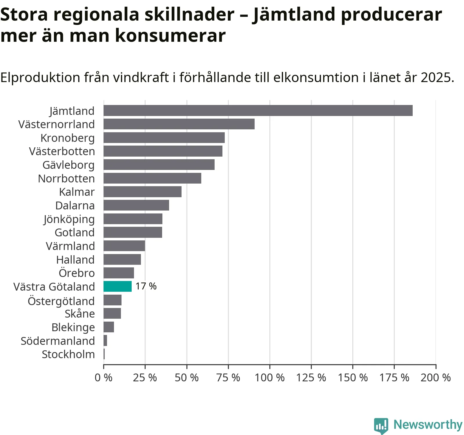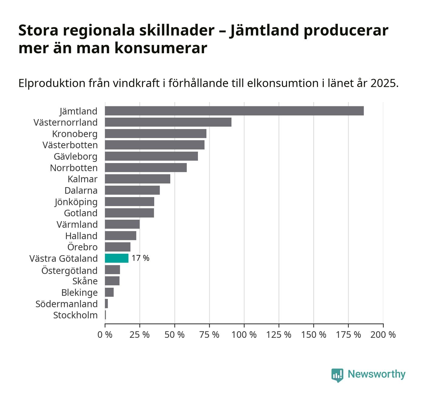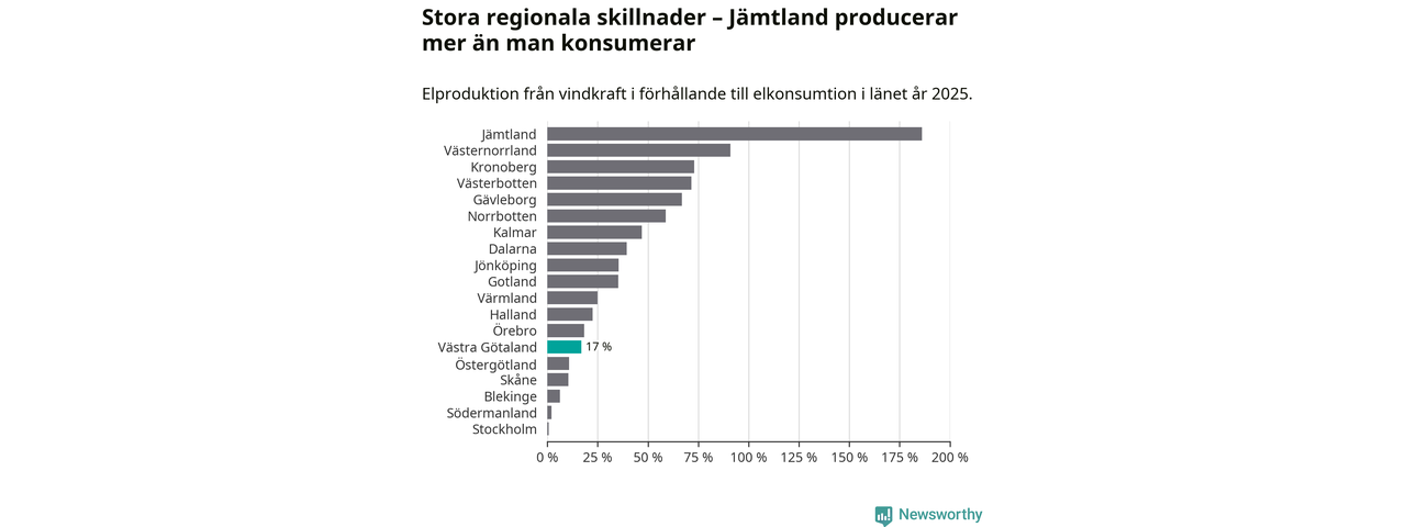 Störst installerad vindkraftseffekt bland landets län finns nu i Västernorrland, med 3 477 megawatt. Bland kommunerna i Västra Götaland ligger Tanums kommun i topp i effektligan.
