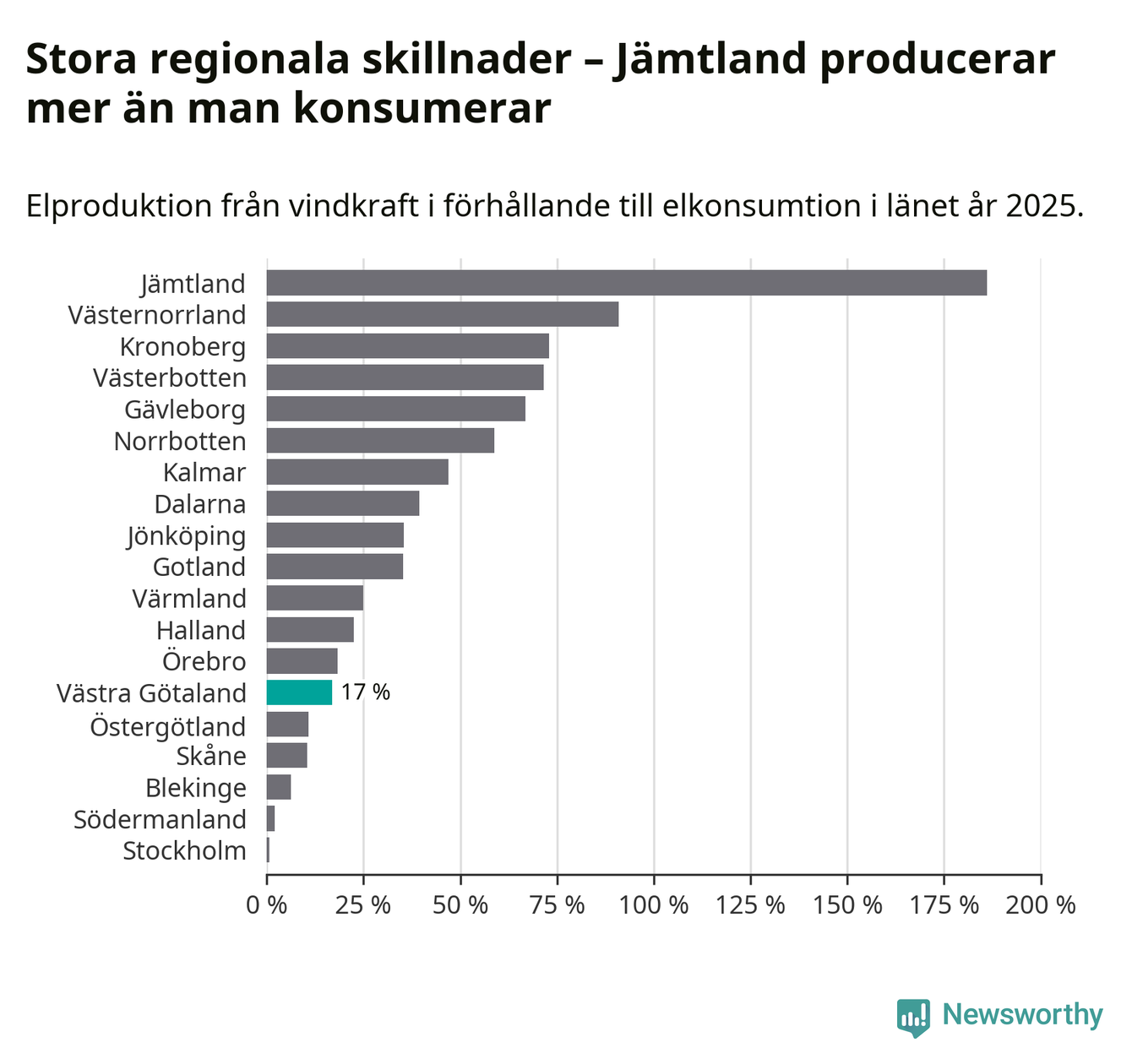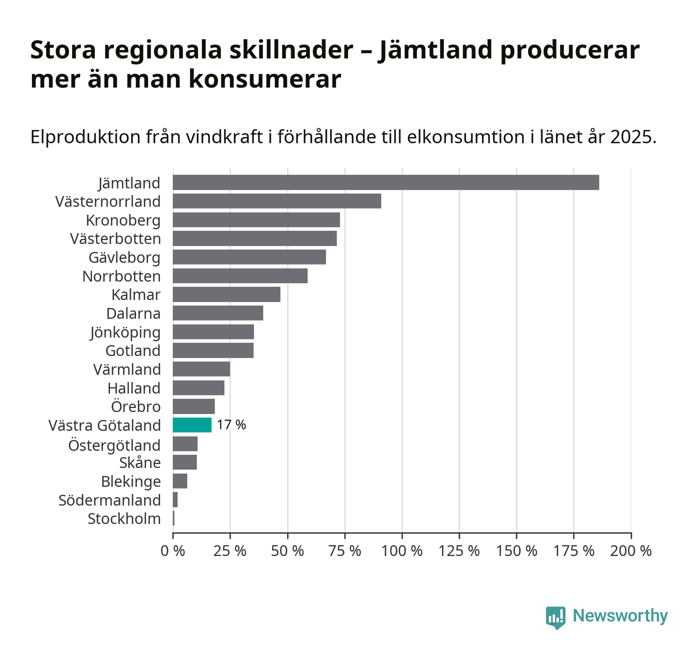 Det är bara ett femtontal kommuner i landet där vindkraftskapaciten rapporterats öka under 2025. Under hela den innevarande mandatperioden har ett 30-tal kommuner ökat den installerade effekten med totalt tre gigawatt, samtidigt som små minskningar skett i ett 20-tal kommuner. Totalt var utbyggnaden omkring 20 procent lägre under 2023–2025, än under motsvarande period förra mandatperioden.