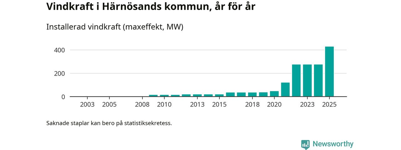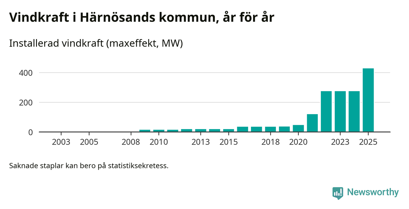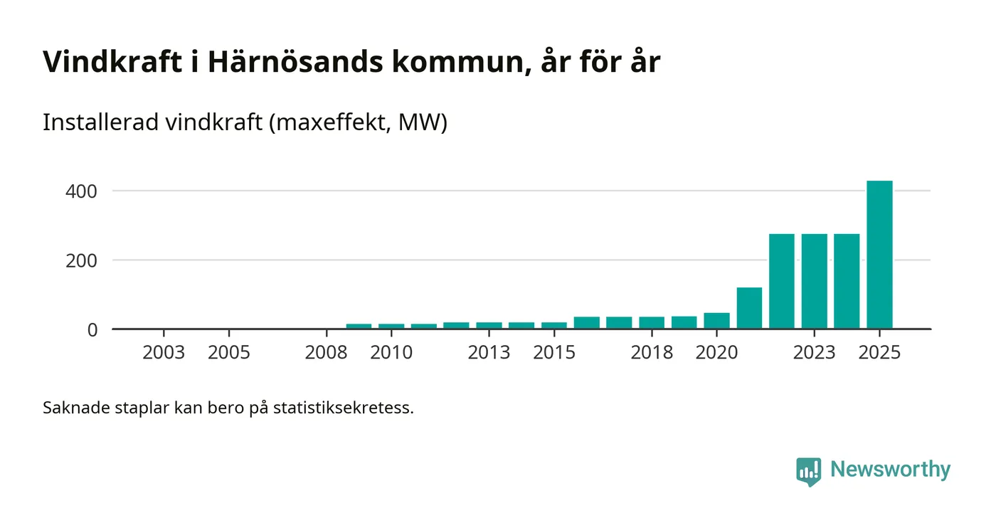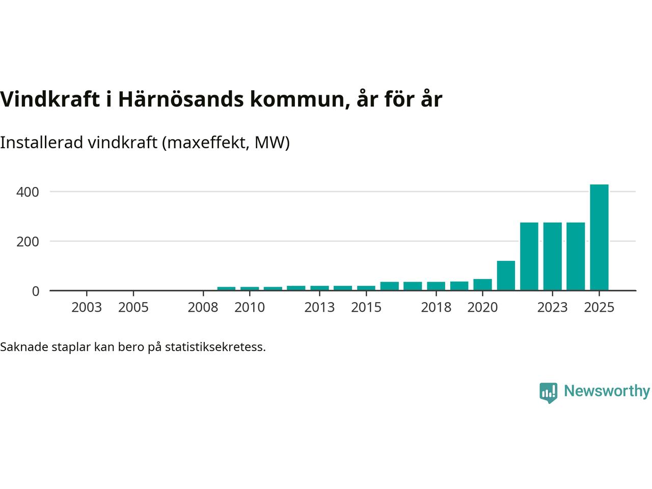 Totalt fanns i slutet av förra året 104 vindkraftverk i Härnösands kommun, med en sammanlagd maxeffekt på 427 megawatt. Det är en ökning med 154 megawatt, eller 56 procent, jämfört med året innan. Det visar nya siffror från Energimyndigheten.