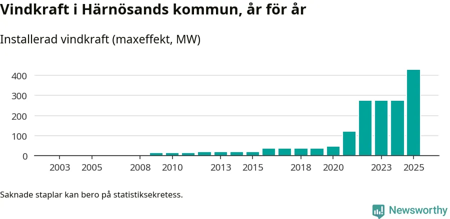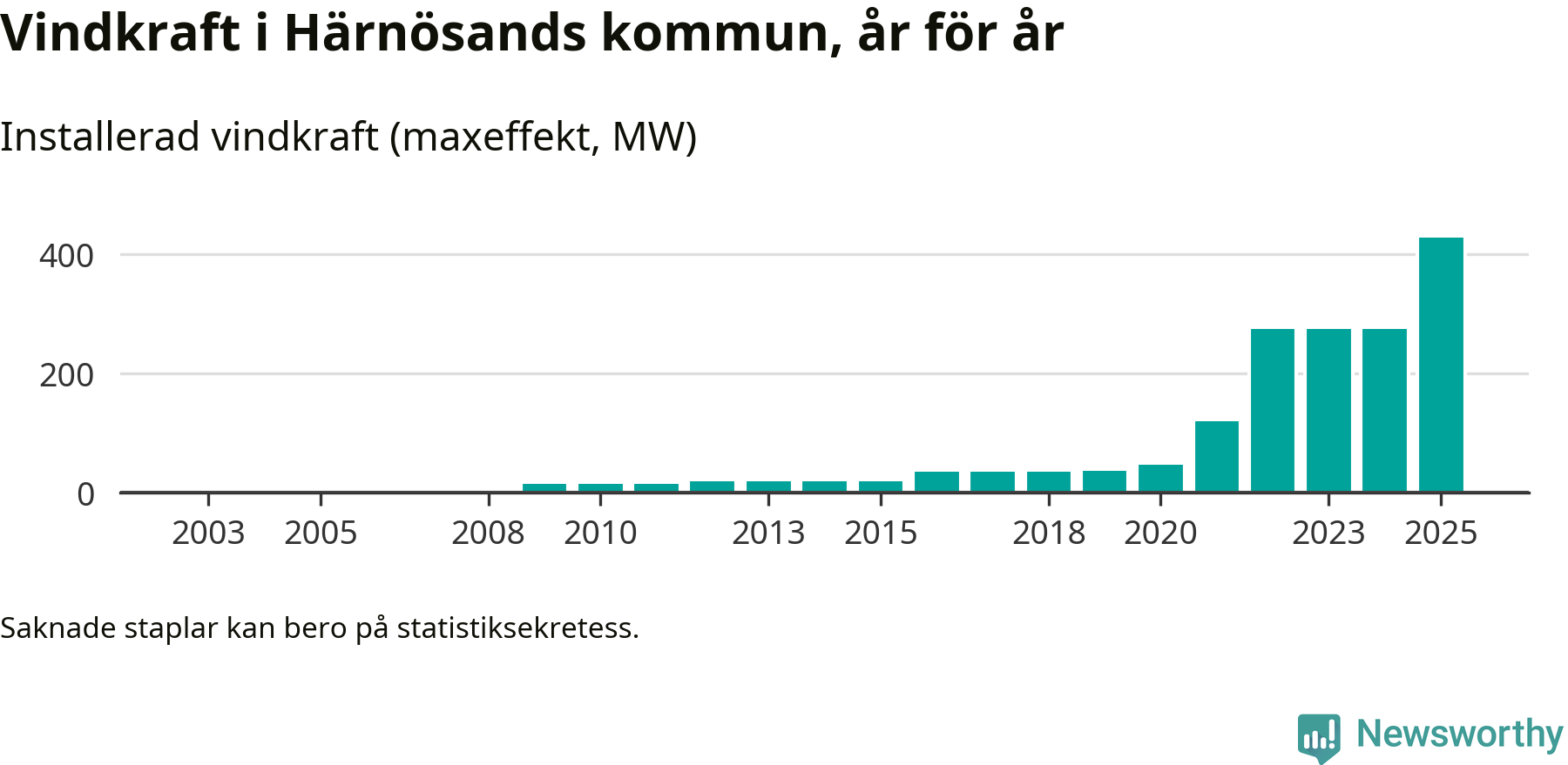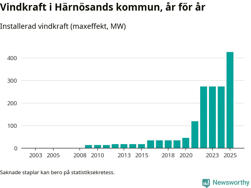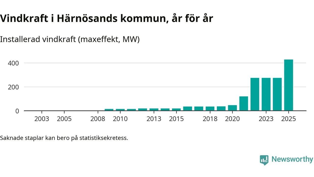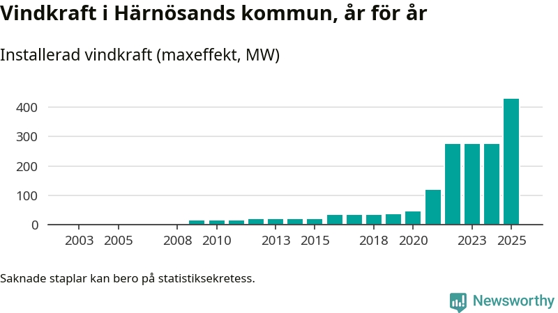 Totalt fanns i slutet av förra året 104 vindkraftverk i Härnösands kommun, med en sammanlagd maxeffekt på 427 megawatt. Det är en ökning med 154 megawatt, eller 56 procent, jämfört med året innan. Det visar nya siffror från Energimyndigheten.