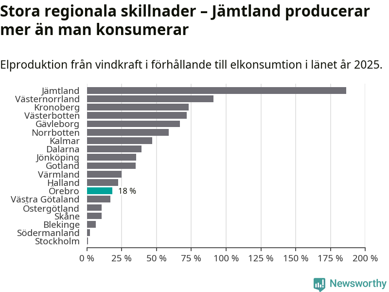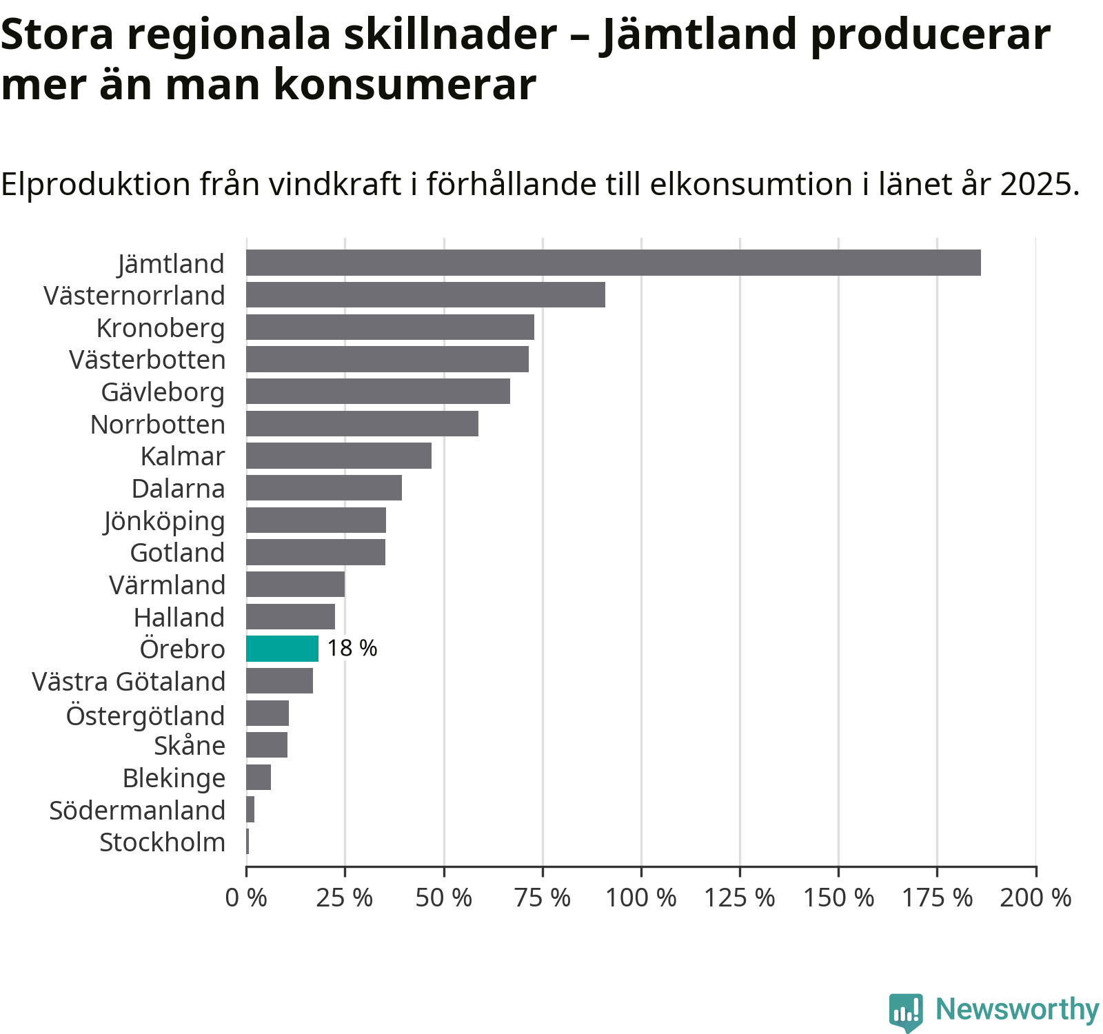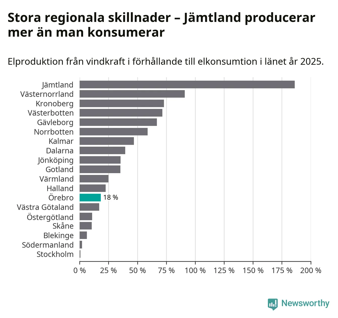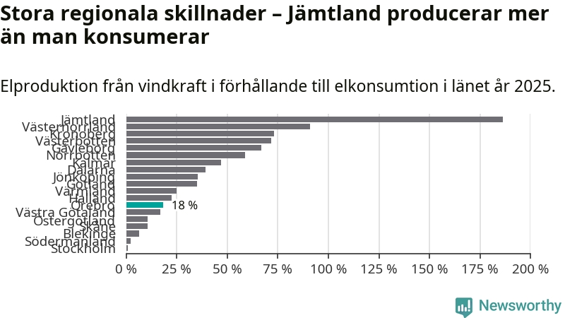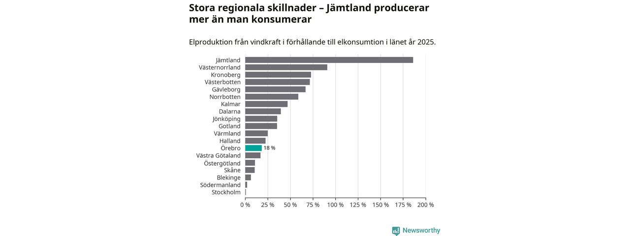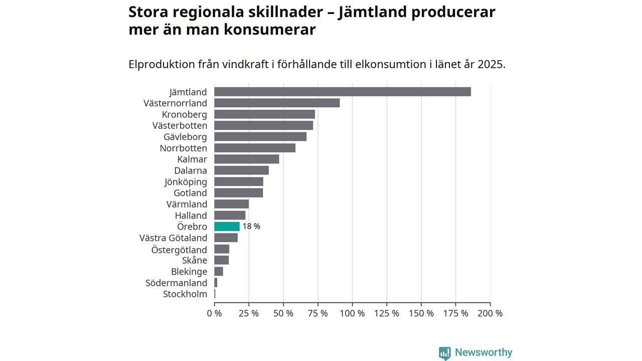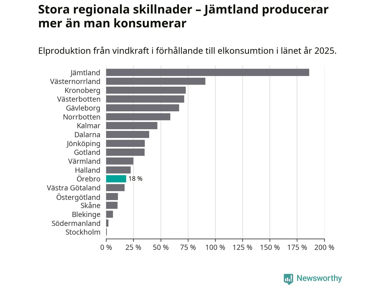 Störst installerad vindkraftseffekt bland landets län finns nu i Västernorrland, med 3 477 megawatt. Bland kommunerna i Örebro län ligger Askersunds kommun i topp i effektligan.