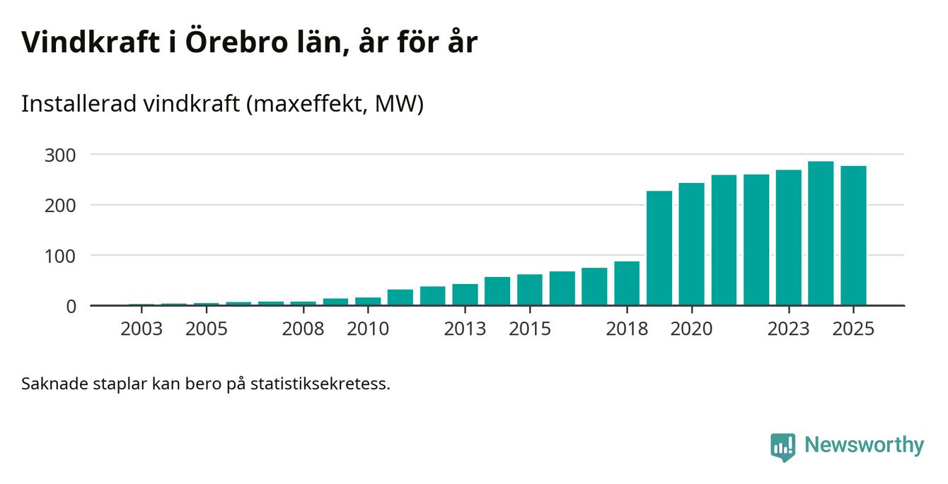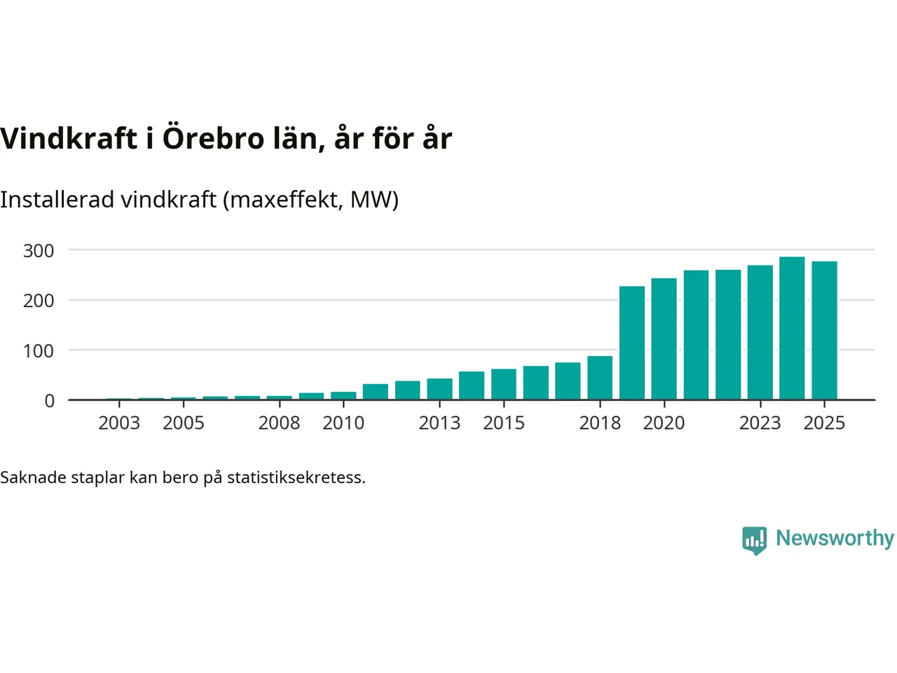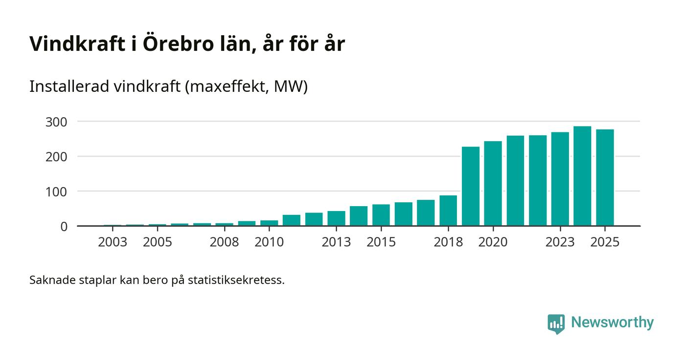 Totalt fanns i slutet av förra året 98 vindkraftverk i Örebro län, med en sammanlagd maxeffekt på 277 megawatt. Det är en minskning med nio megawatt 1, jämfört med året innan. Det visar nya siffror från Energimyndigheten.
