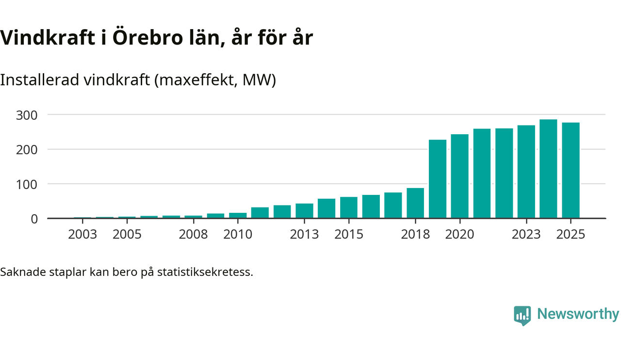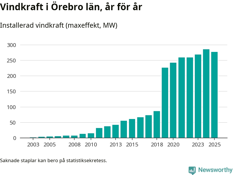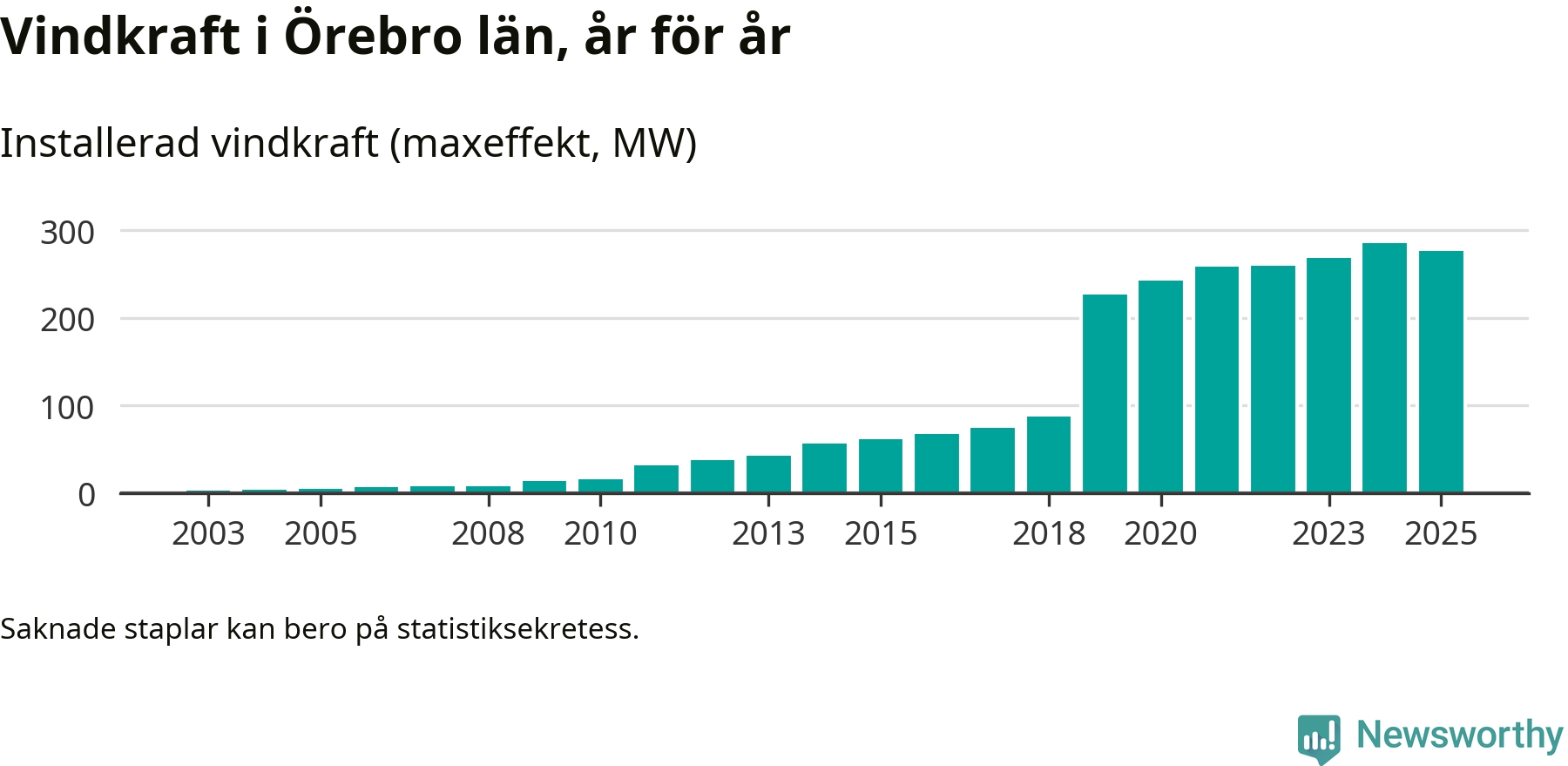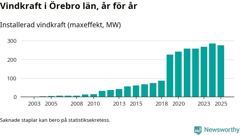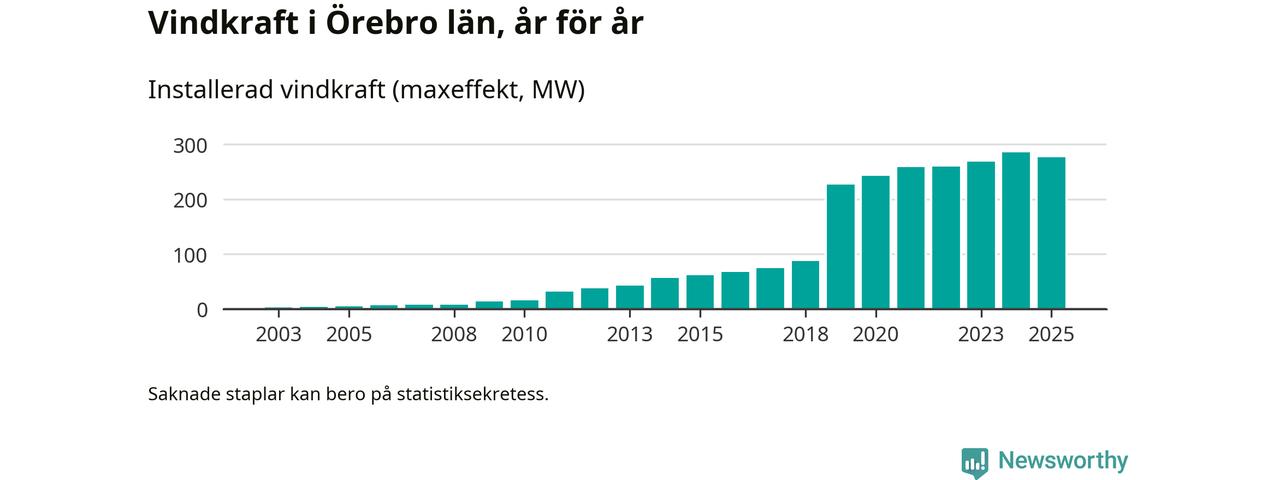 Totalt fanns i slutet av förra året 98 vindkraftverk i Örebro län, med en sammanlagd maxeffekt på 277 megawatt. Det är en minskning med nio megawatt 1, jämfört med året innan. Det visar nya siffror från Energimyndigheten.