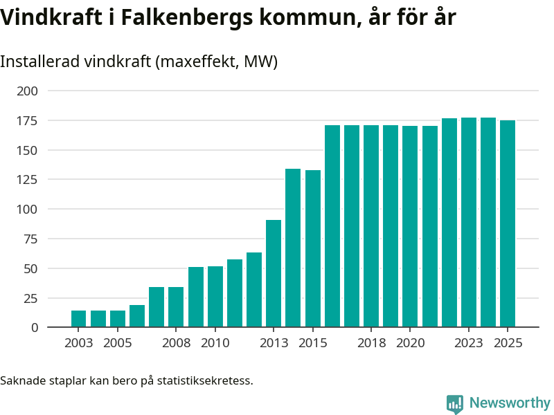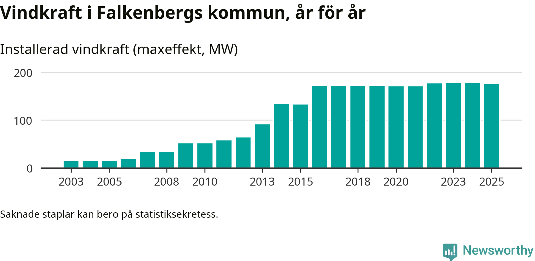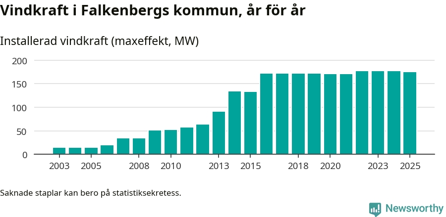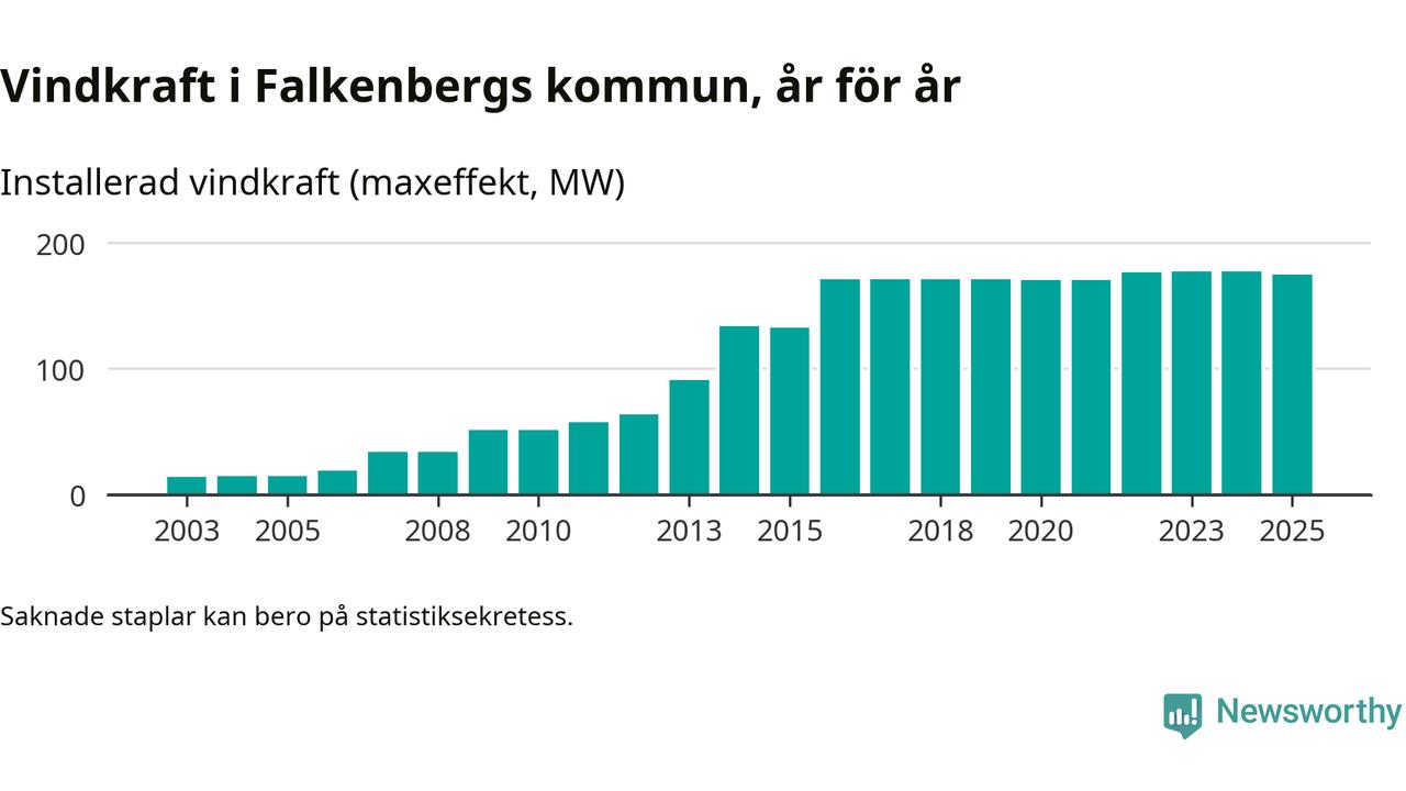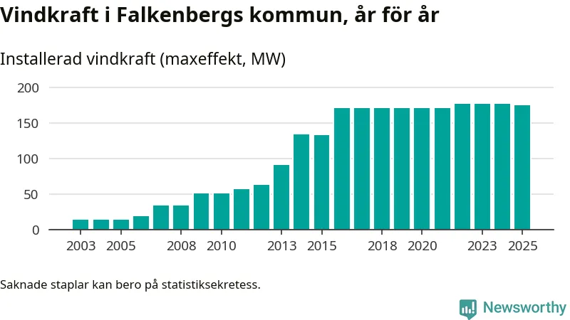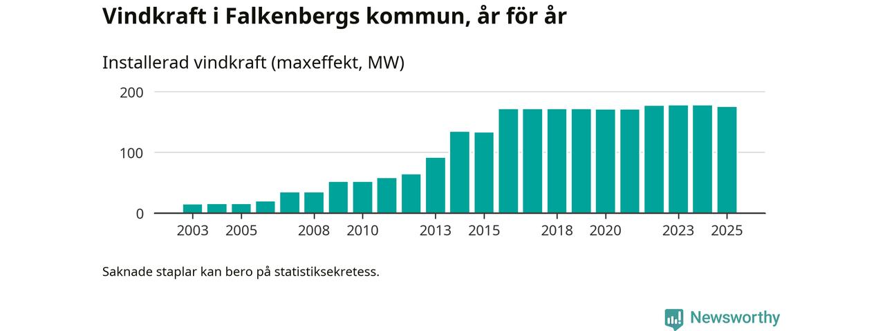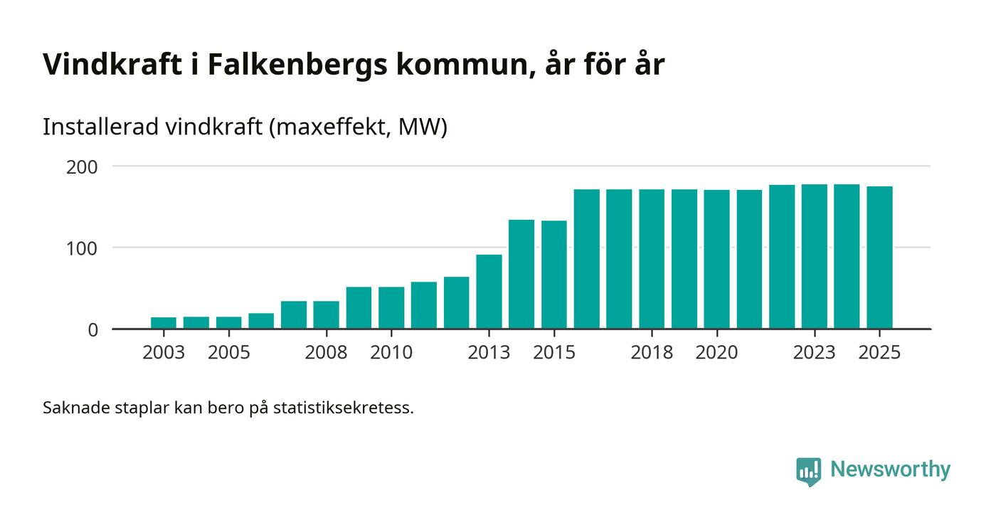 Totalt fanns i slutet av förra året 82 vindkraftverk i Falkenbergs kommun, med en sammanlagd maxeffekt på 175 megawatt. Det är en minskning med 2,3 megawatt 1, jämfört med året innan. Det visar nya siffror från Energimyndigheten.