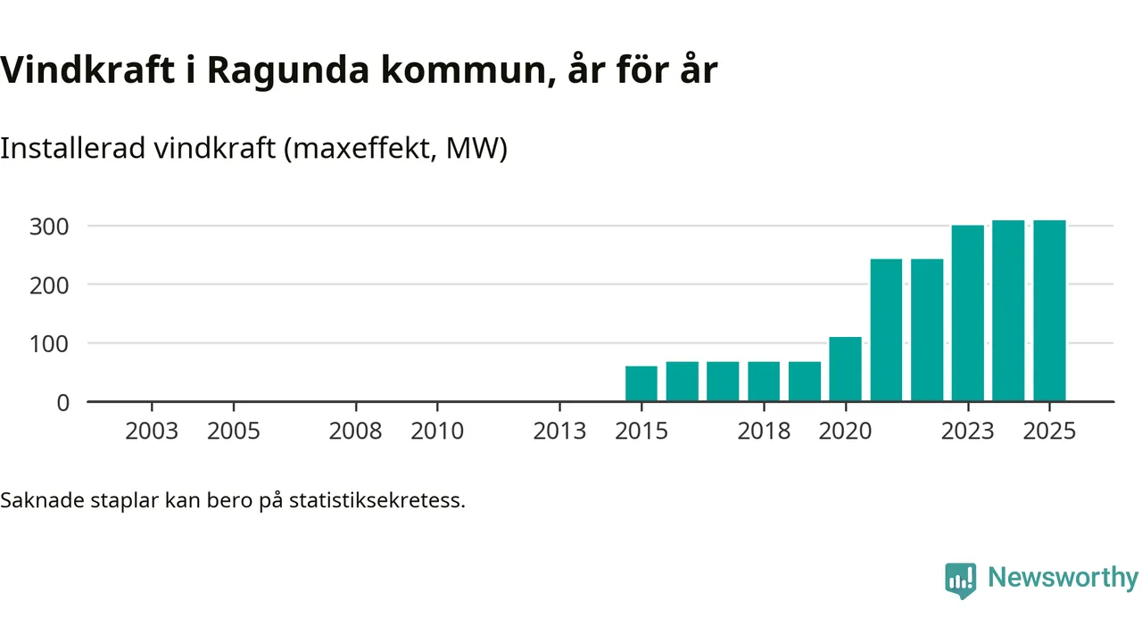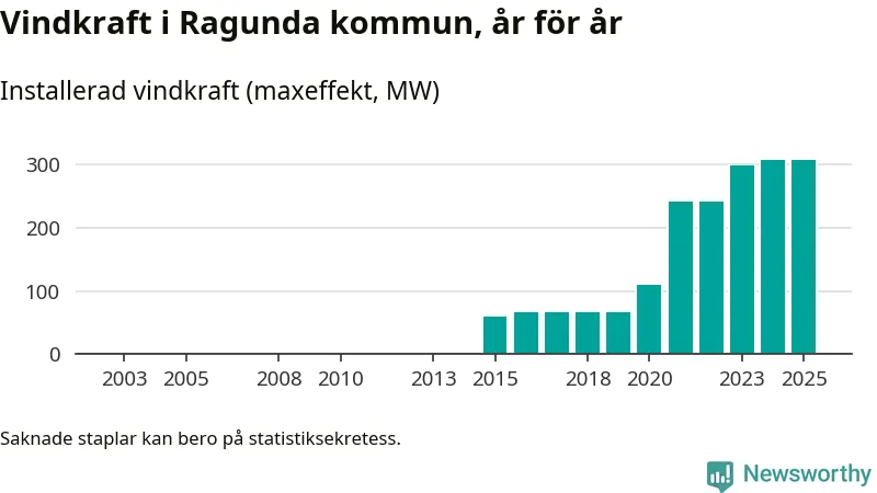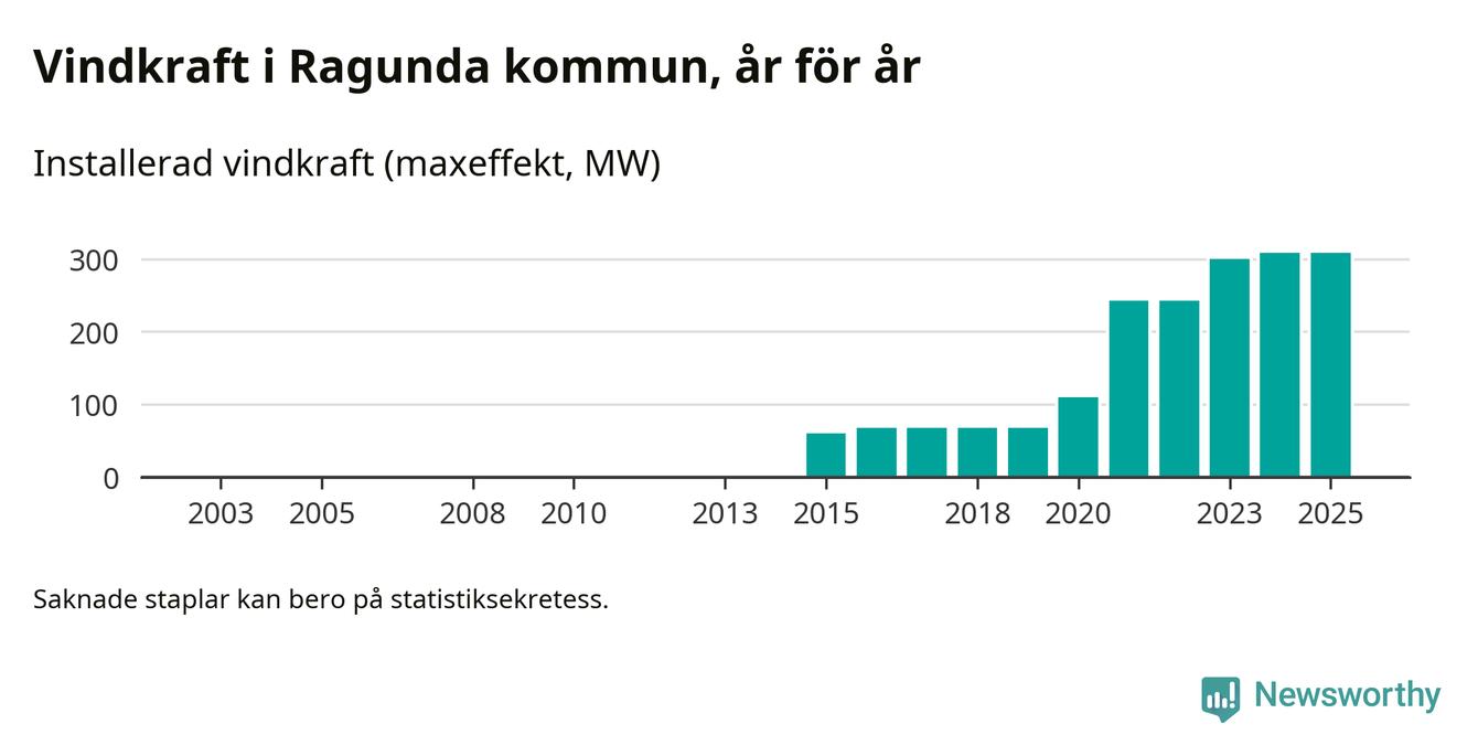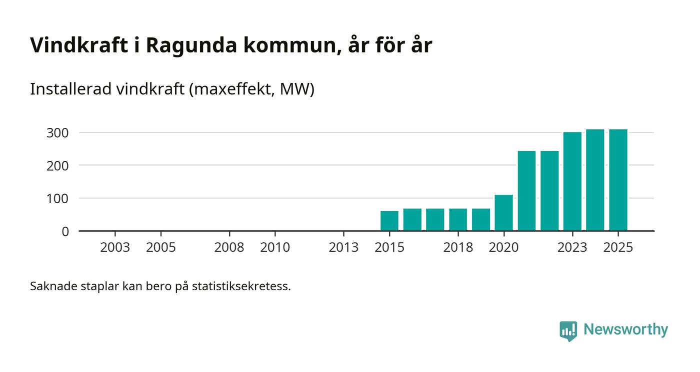 Totalt fanns i slutet av förra året 57 vindkraftverk i Ragunda kommun, med en sammanlagd maxeffekt på 308 megawatt. Det är oförändrade siffror jämfört med året innan. Det visar nya siffror från Energimyndigheten.