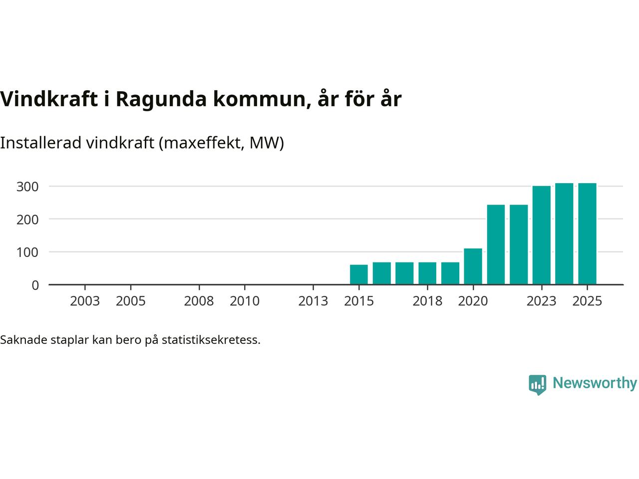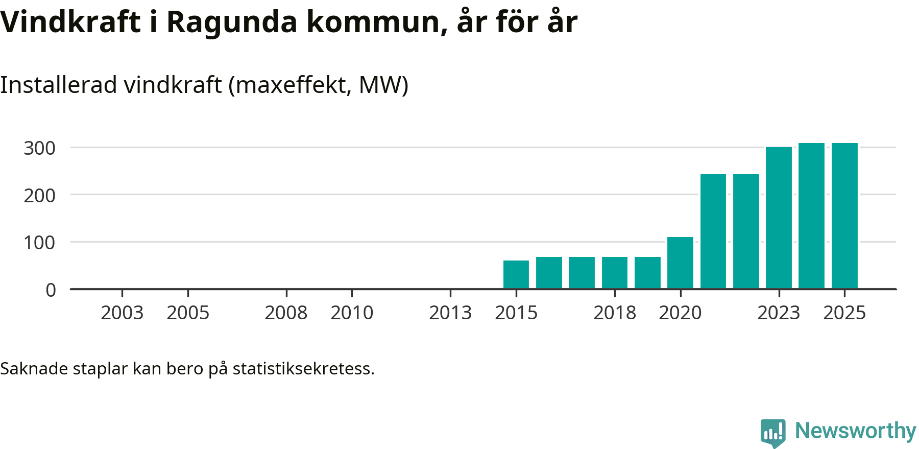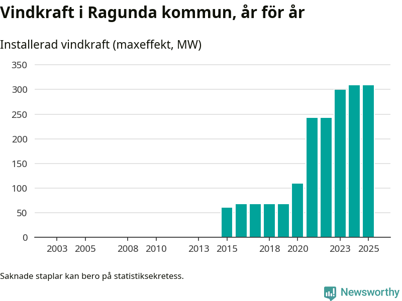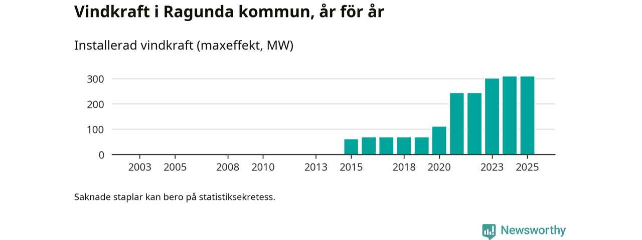 Totalt fanns i slutet av förra året 57 vindkraftverk i Ragunda kommun, med en sammanlagd maxeffekt på 308 megawatt. Det är oförändrade siffror jämfört med året innan. Det visar nya siffror från Energimyndigheten.
