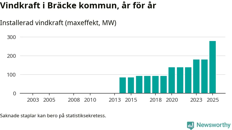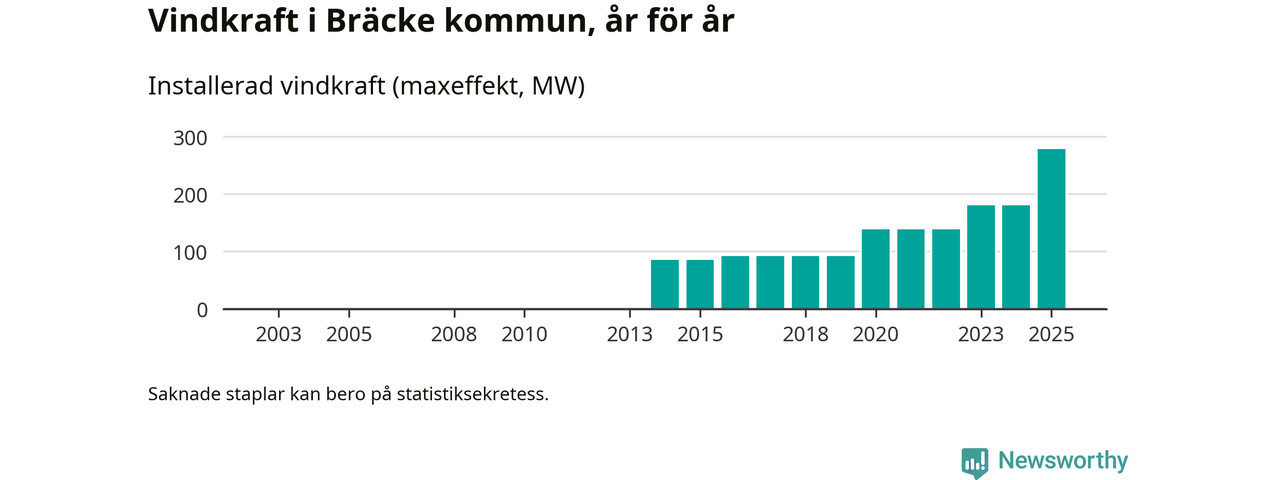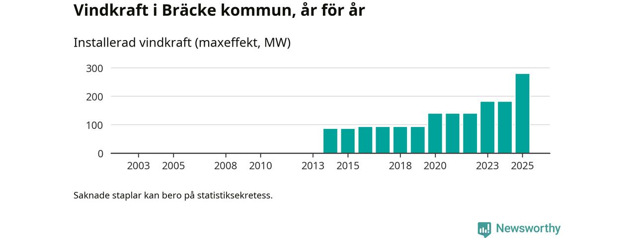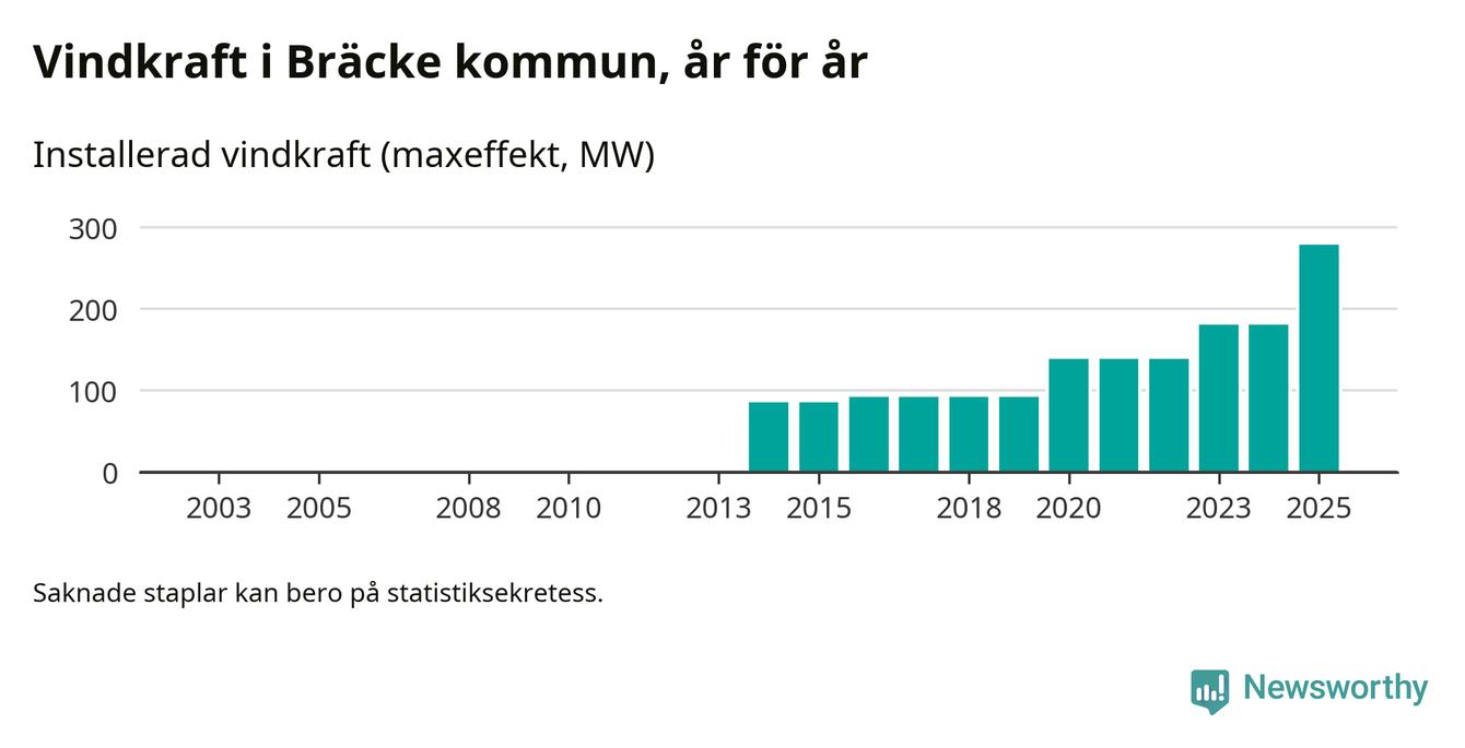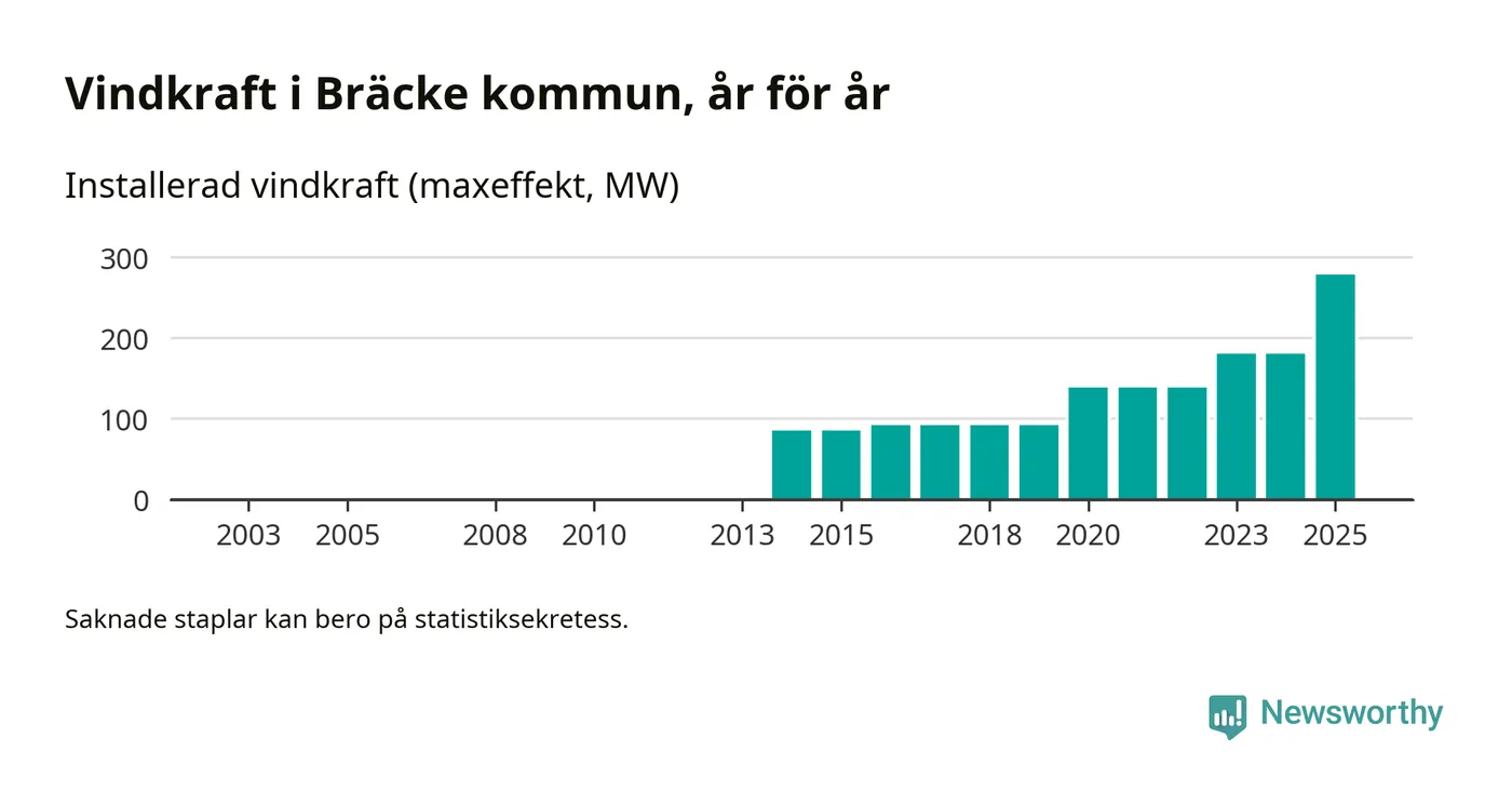 Totalt fanns i slutet av förra året 72 vindkraftverk i Bräcke kommun, med en sammanlagd maxeffekt på 278 megawatt. Det är en ökning med 98 megawatt, eller 54 procent, jämfört med året innan. Det visar nya siffror från Energimyndigheten.