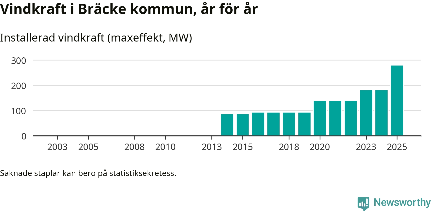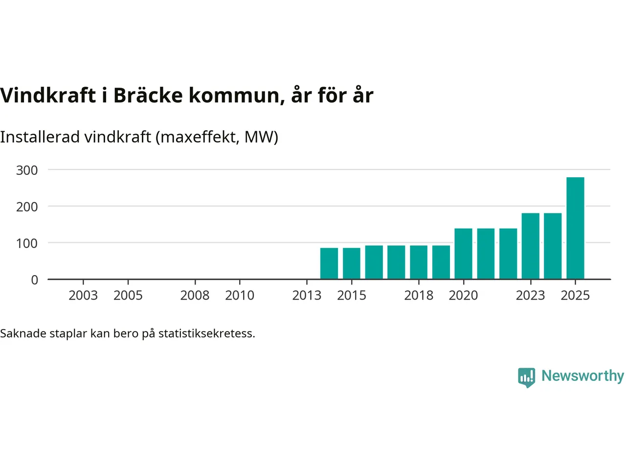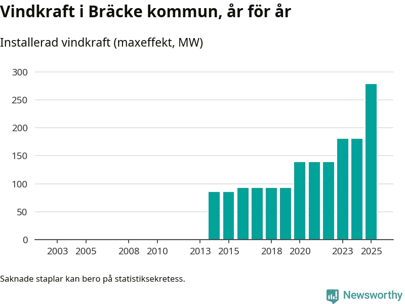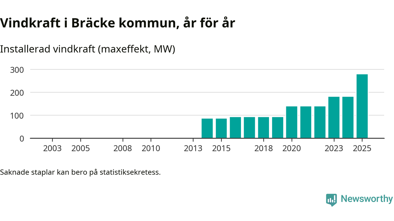 Totalt fanns i slutet av förra året 72 vindkraftverk i Bräcke kommun, med en sammanlagd maxeffekt på 278 megawatt. Det är en ökning med 98 megawatt, eller 54 procent, jämfört med året innan. Det visar nya siffror från Energimyndigheten.