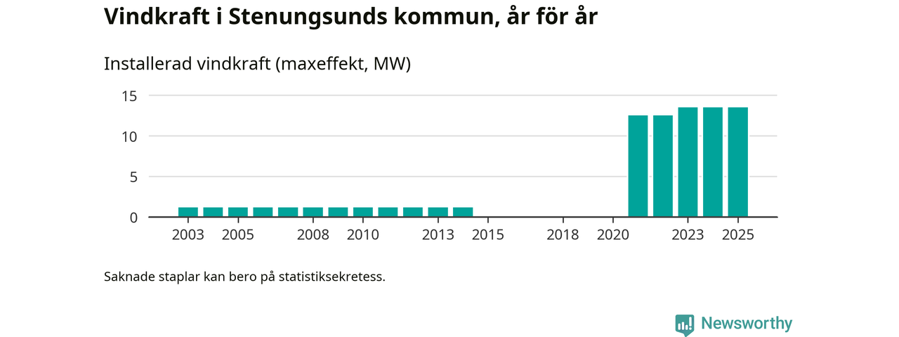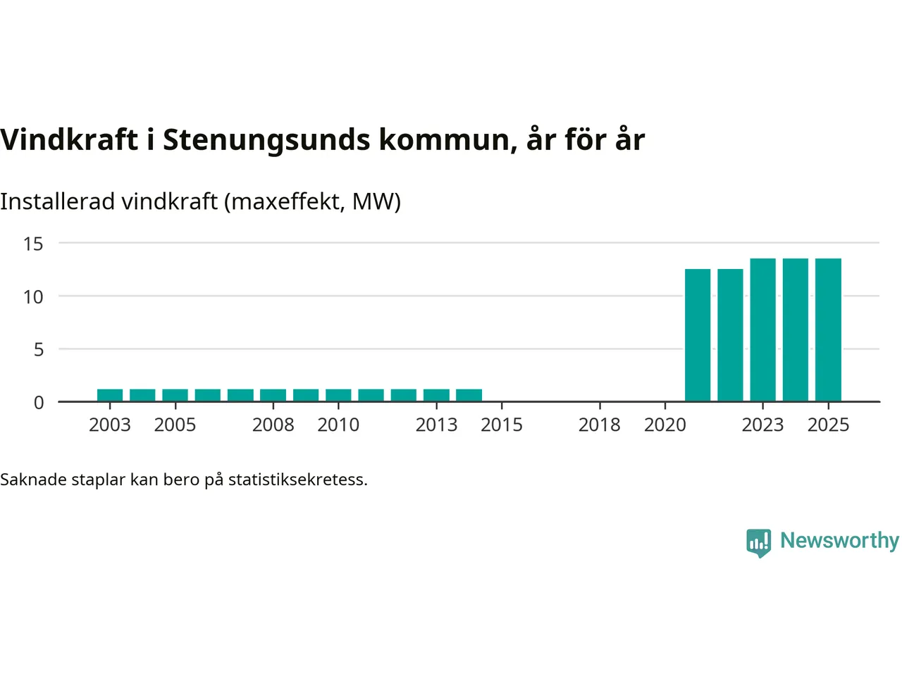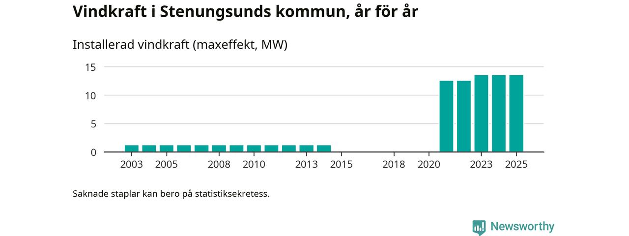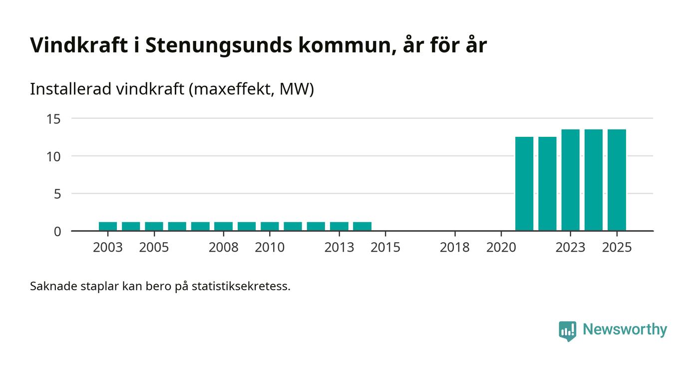 Totalt fanns i slutet av förra året sex vindkraftverk i Stenungsunds kommun, med en sammanlagd maxeffekt på 14 megawatt. Det är, för andra året i rad, oförändrade siffror jämfört med året innan. Det visar nya siffror från Energimyndigheten.