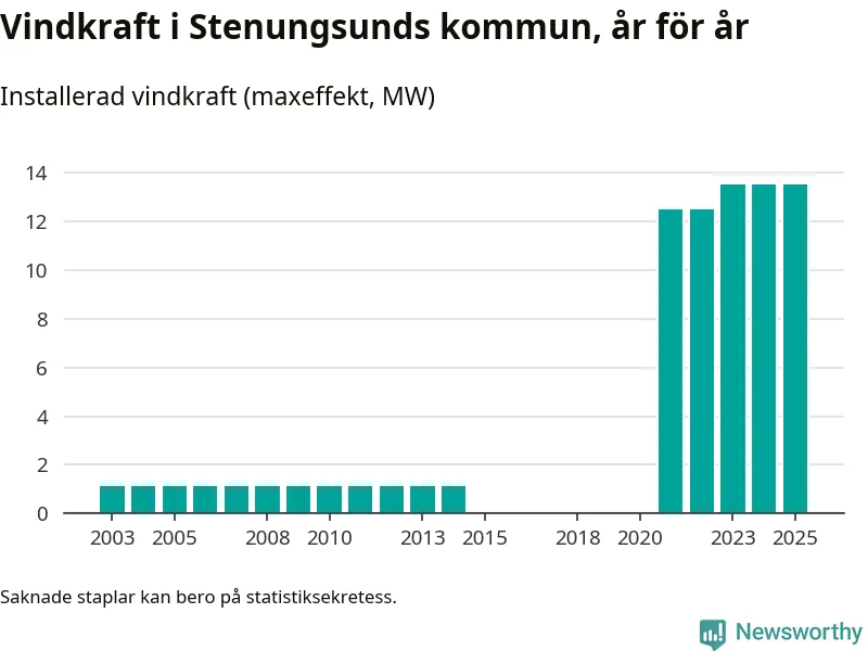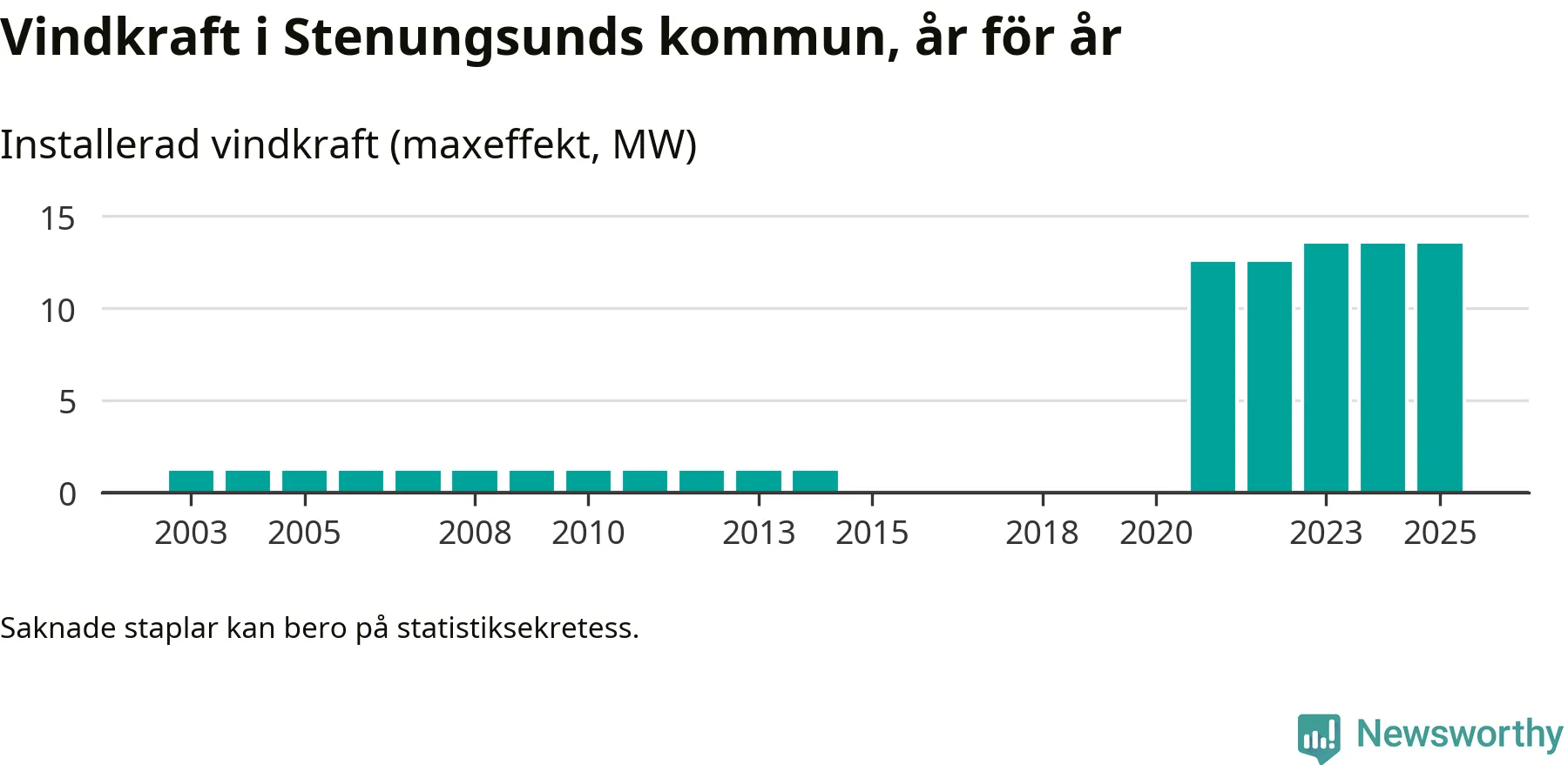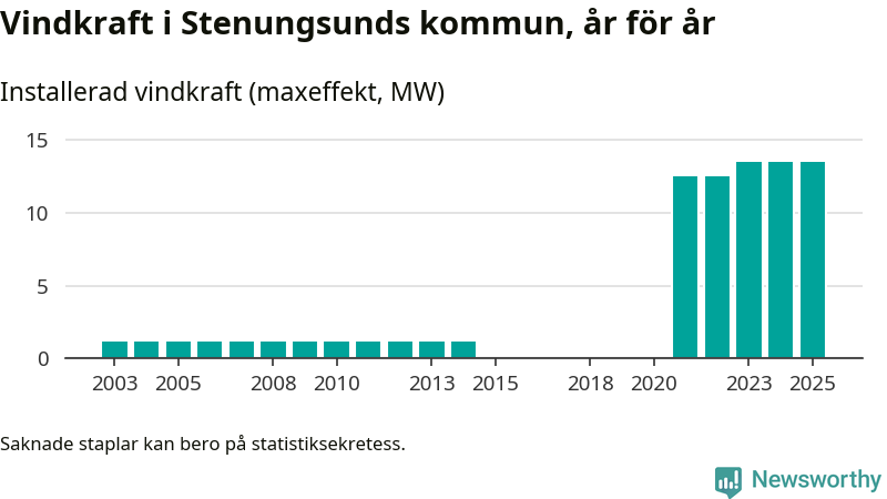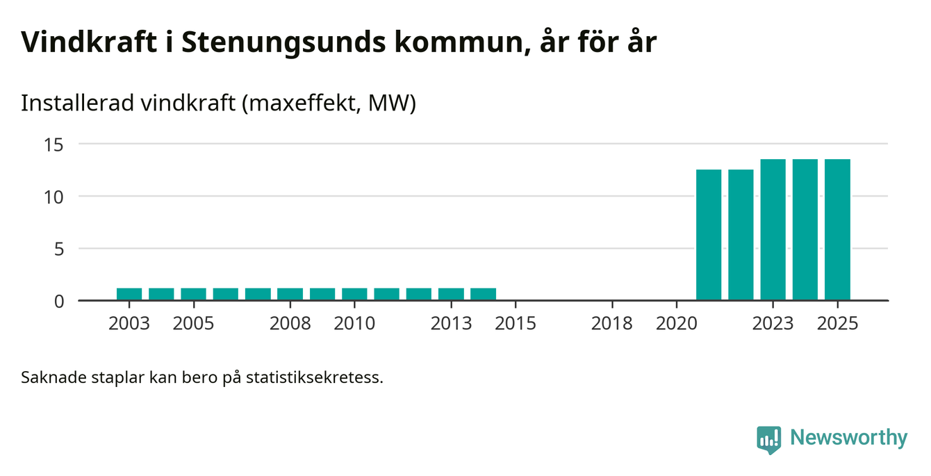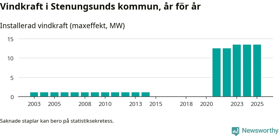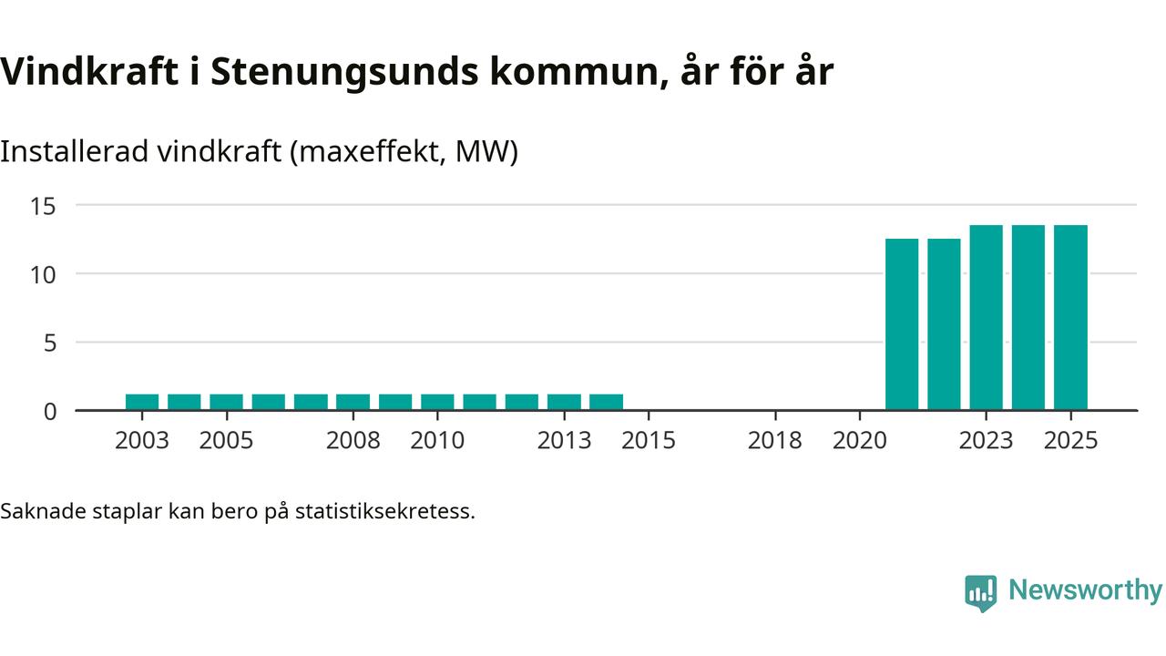 Totalt fanns i slutet av förra året sex vindkraftverk i Stenungsunds kommun, med en sammanlagd maxeffekt på 14 megawatt. Det är, för andra året i rad, oförändrade siffror jämfört med året innan. Det visar nya siffror från Energimyndigheten.