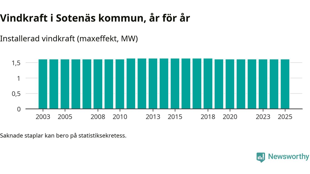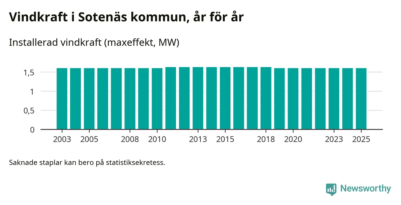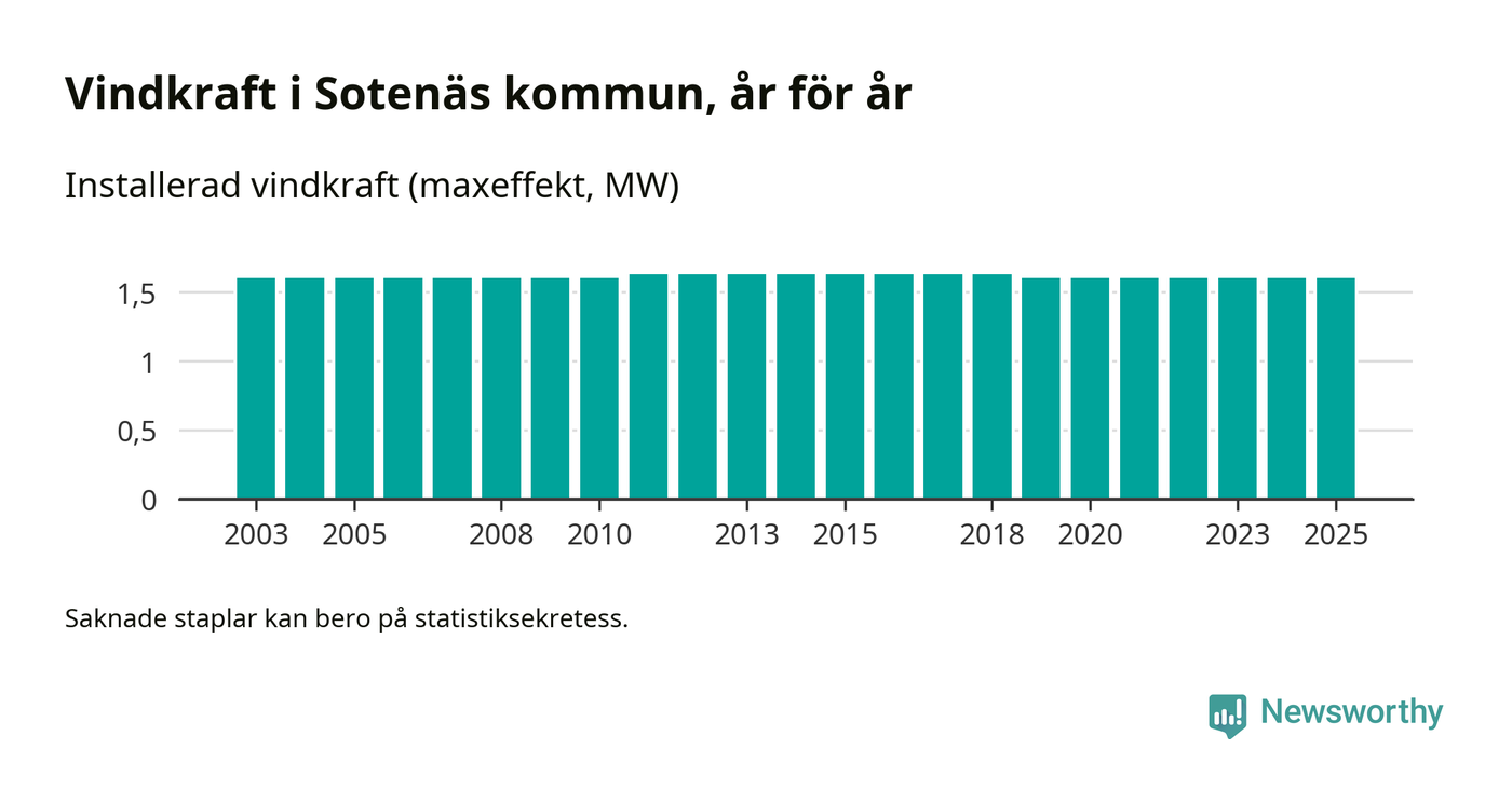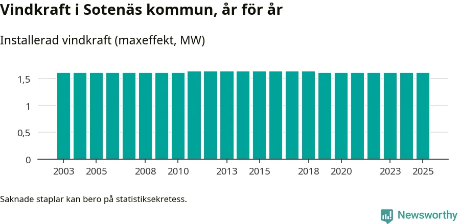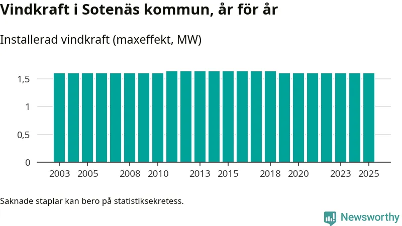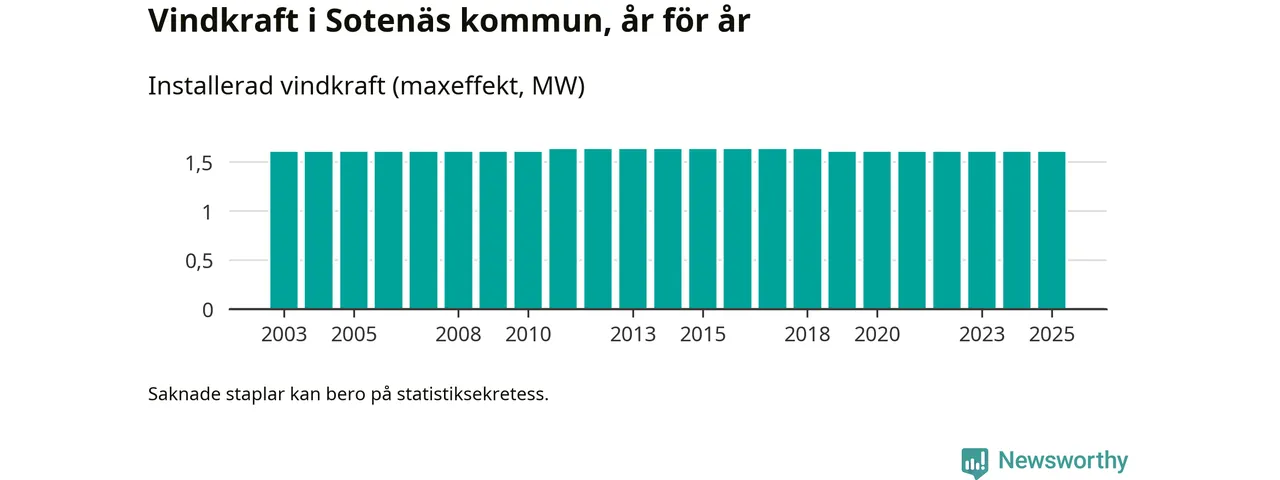 Totalt fanns i slutet av förra året tre vindkraftverk i Sotenäs kommun, med en sammanlagd maxeffekt på 2 megawatt. Det är, för sjätte året i rad, oförändrade siffror jämfört med året innan. Det visar nya siffror från Energimyndigheten.