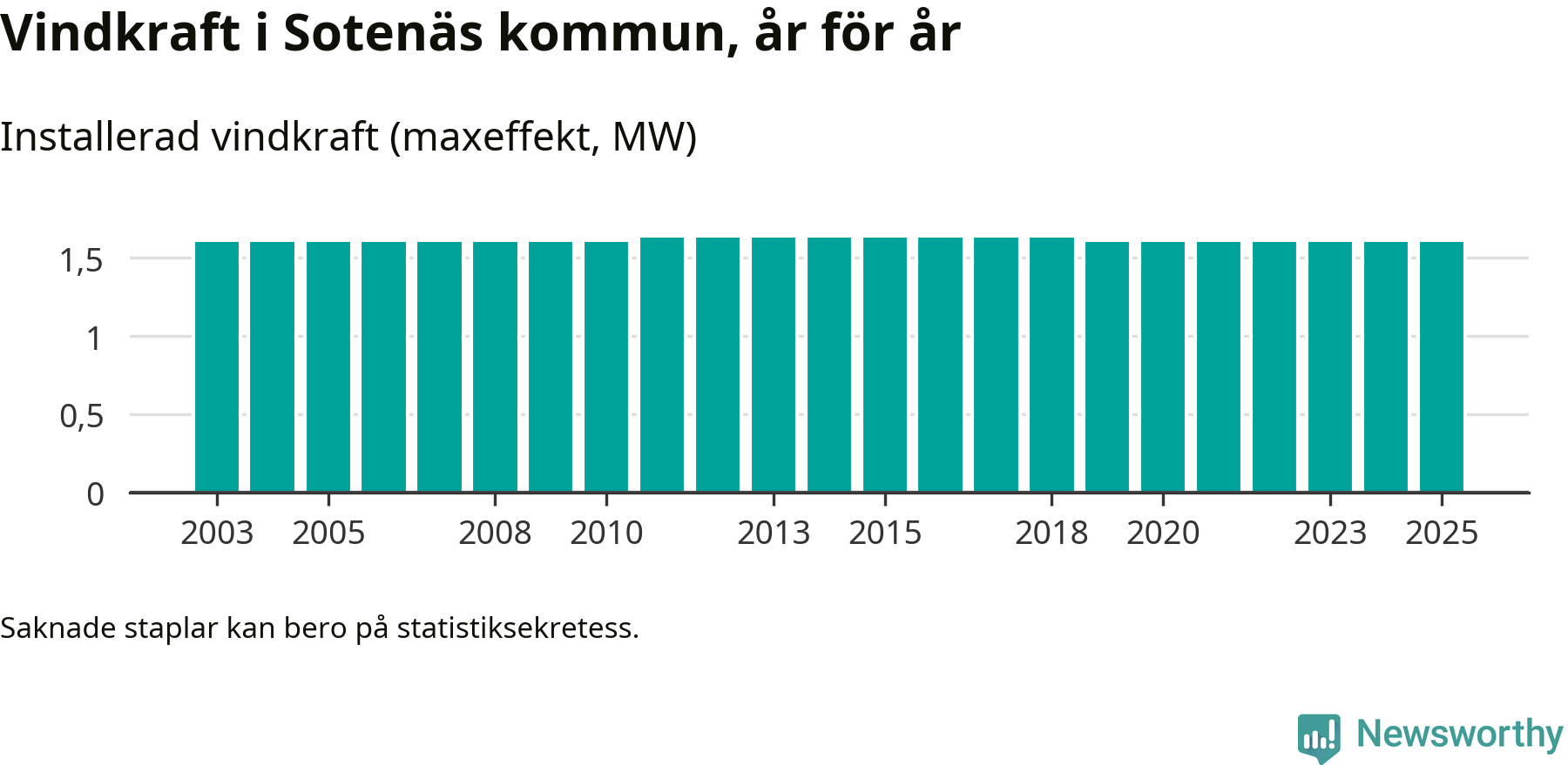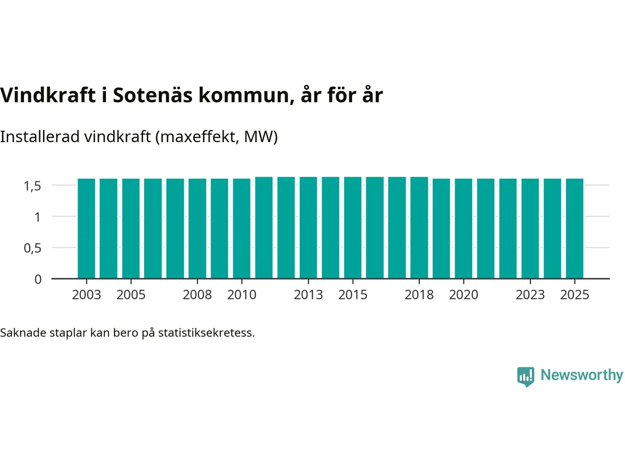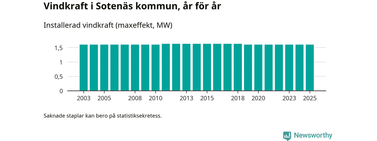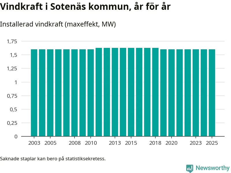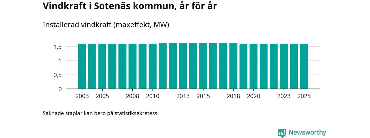 Totalt fanns i slutet av förra året tre vindkraftverk i Sotenäs kommun, med en sammanlagd maxeffekt på 2 megawatt. Det är, för sjätte året i rad, oförändrade siffror jämfört med året innan. Det visar nya siffror från Energimyndigheten.
