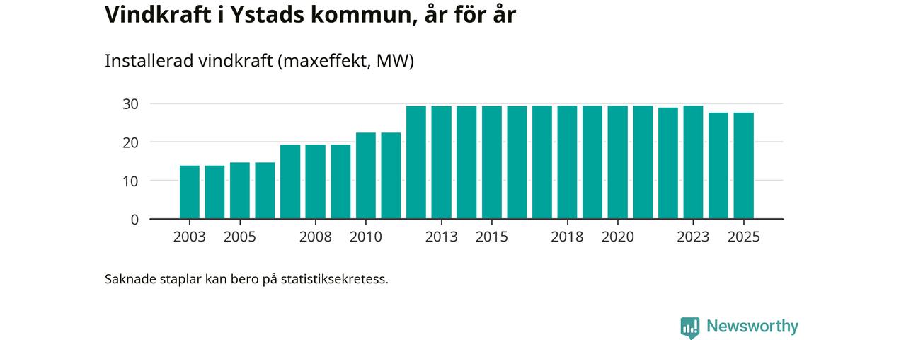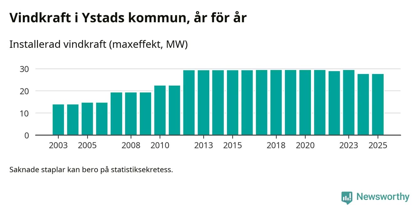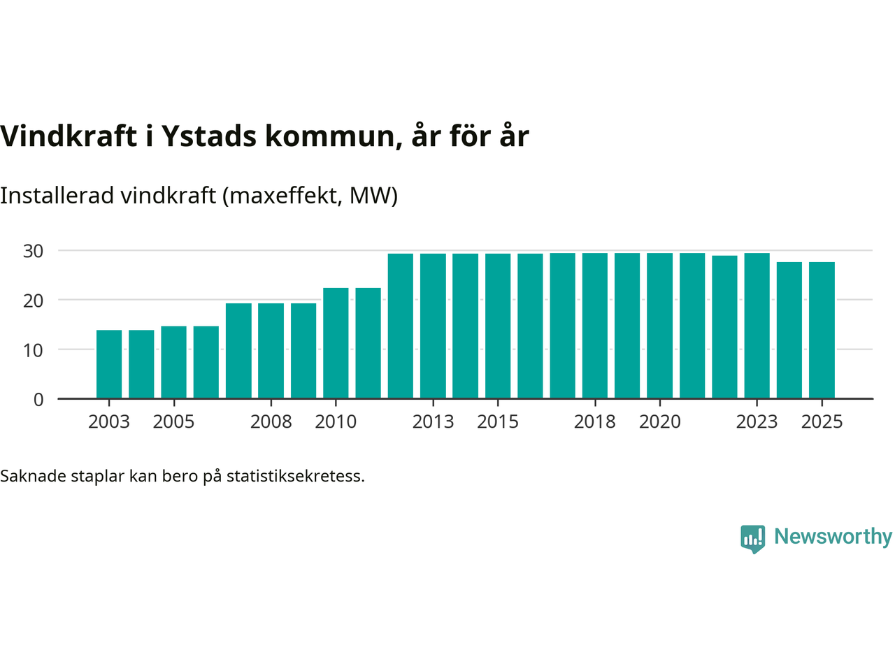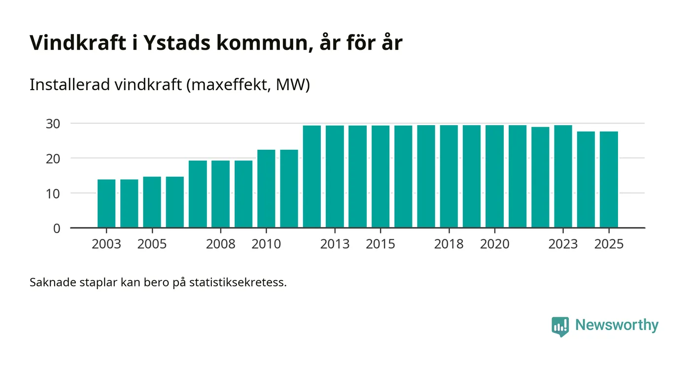 Totalt fanns i slutet av förra året 28 vindkraftverk i Ystads kommun, med en sammanlagd maxeffekt på 28 megawatt. Det är oförändrade siffror jämfört med året innan. Det visar nya siffror från Energimyndigheten.