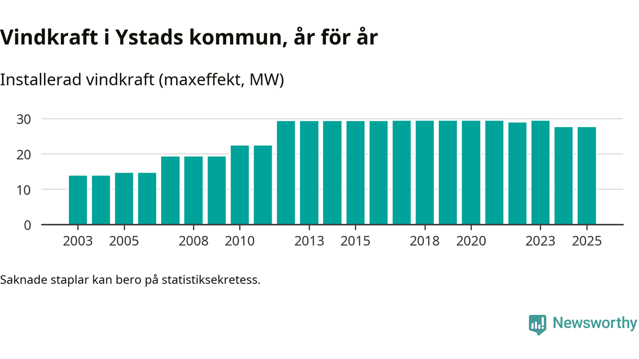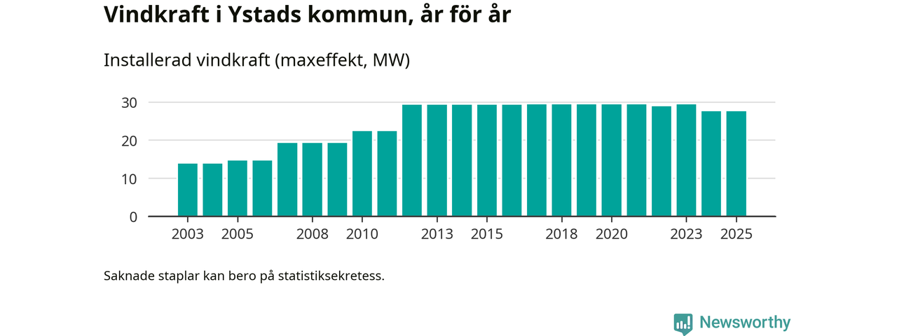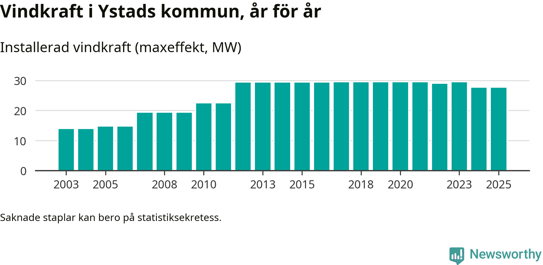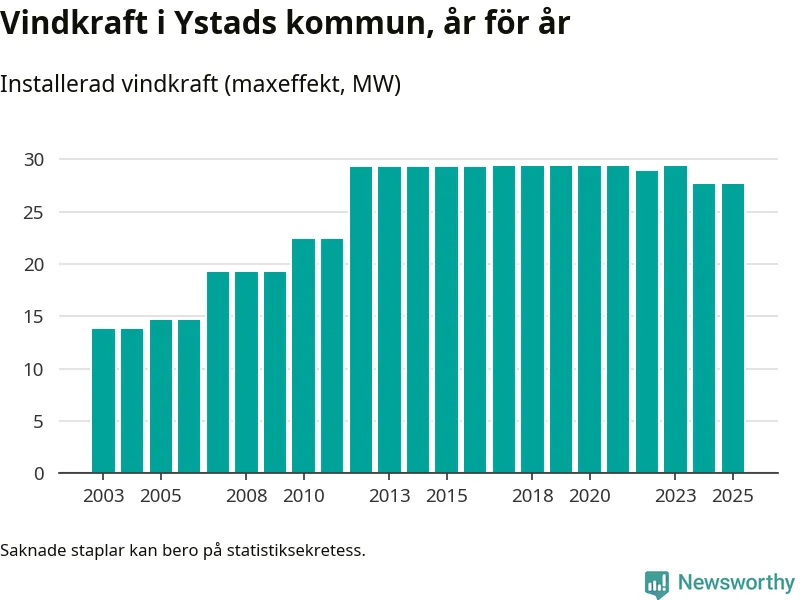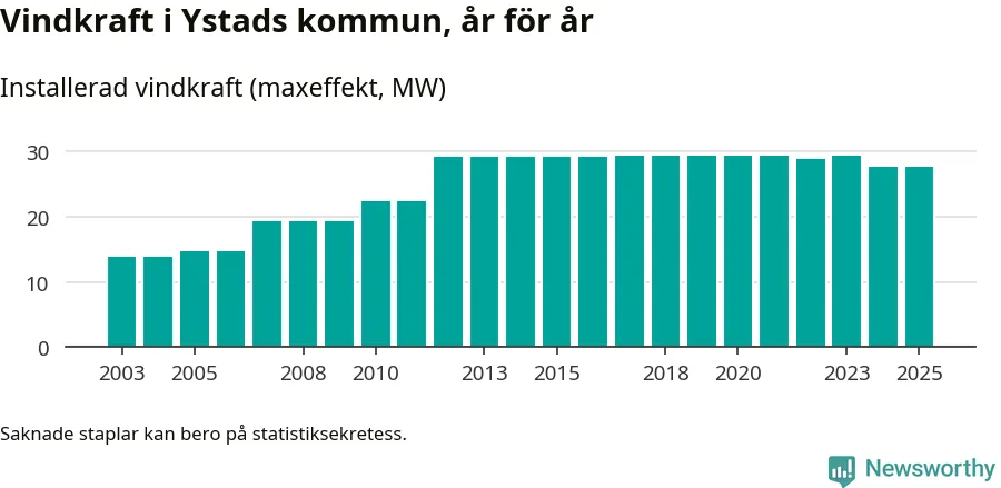 Totalt fanns i slutet av förra året 28 vindkraftverk i Ystads kommun, med en sammanlagd maxeffekt på 28 megawatt. Det är oförändrade siffror jämfört med året innan. Det visar nya siffror från Energimyndigheten.